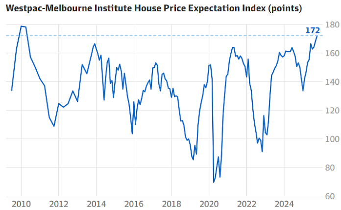 近日,澳洲房价预期指标达15年新高。西太平洋银行(Westpac)的10月房价预期指标在过去一年上涨了12.2%,比长期平均水平高出34%...