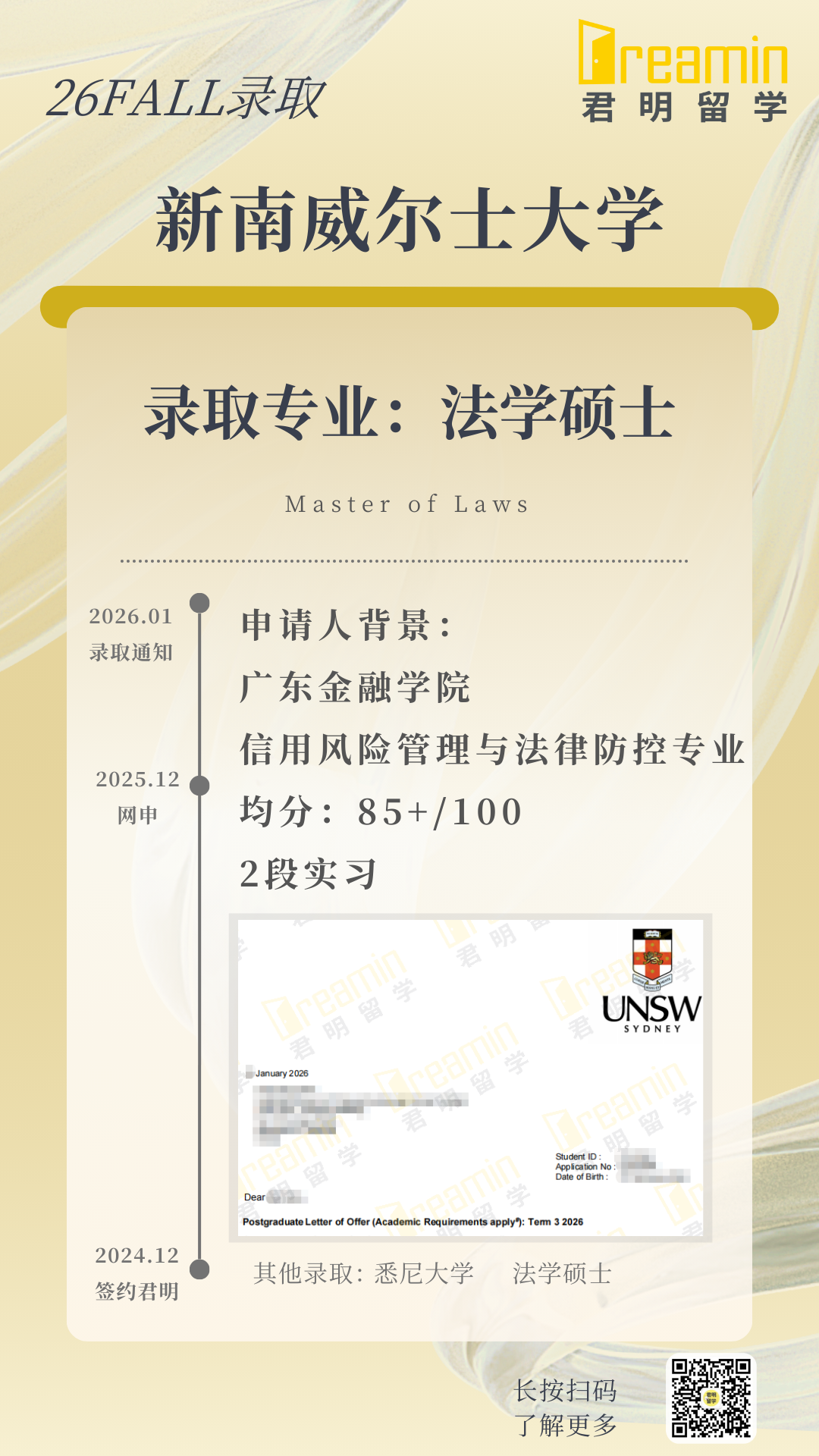 恭喜广东金融学院的W同学成功收获新南威尔士大学法学硕士offer一枚!项目概况新南威尔士大学(The University of New South Wale...