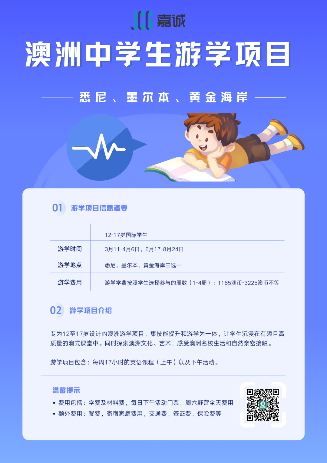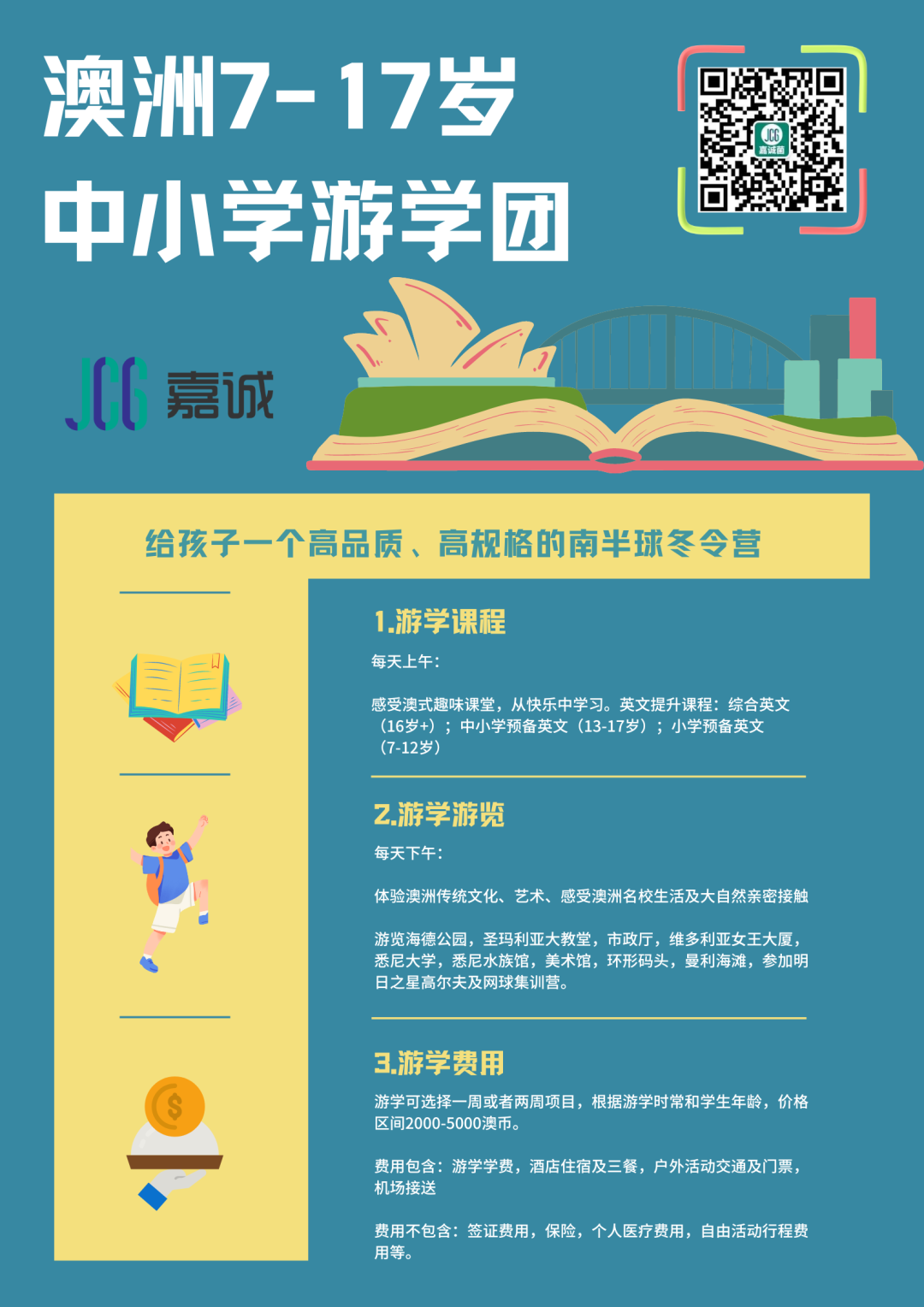 ![]() 小伙伴们和酷炫家长们!澳大利亚,你敢来吗?我们的中小学游学项目燃爆你的暑假! 随着国际旅游的开放,游学项目再次回到了我们的视野!相比单纯带着孩子出来旅游,很多家长更希望孩子的假期可以去到国外参加游学。 ![]() 游学项目通常包括强化的语言课程,有助于学生提高语言技能。在目标国家的实际环境中使用语言,加深了对语言的理解和运用能力。 同时,它还提供了一个深入了解目标国家文化的机会。学生可以亲身体验当地的风土人情、传统习俗和生活方式,从而拓宽自己的国际视野。 拓展学生的全球视野,使其更深刻地理解世界各地的差异和共通之处。这有助于培养独立意识和跨文化交流能力。 我们JCG嘉诚为大家带来两个游学项目,给孩子一个难以忘怀的南半球假期! 游学项目一:悉尼1周或2周游学冬令营 SYNDEY 适合人群:7-17岁国际学生 游学地点:澳大利亚,悉尼 游学长度:1周或者2周 游学时间:国内暑假(6-8月) 游学类型:上午英文课;下午当地游览活动 ![]() ![]() ![]() 游学项目二:12-17岁中学生游学项目 SYNDEY 适合人群:12-17岁国际学生 游学地点:澳大利亚,悉尼/墨尔本/黄金海岸 游学长度:1周-4周可选 游学时间:3-4月,6-8月 游学类型:上午英文课;下午当地游览活动 ![]() ![]() ![]() 别再犹豫了,让孩子在这个假期玩转全英文,感受澳洲的独特风采! 温馨提示:游学项目需要提前准备,我们需要帮助学生申请课程安排签证,需要预留充足的时间,因此请各位家长有计划的家长尽早联系我们。 ![]() 欢迎大家关注嘉诚! 嘉诚会第一时间为您提供真实、可信、及时的澳洲移民与留学的相关资讯!如有咨询需要,请不要犹豫联系我们! ![]() |