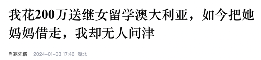 荐读DISCOVERY 澳洲入境 | 加拿大入境 | 疫苗 | 加拿大移民生活 | 美国移民生活 | ![]() 海外留学 ![]() 海外投资 ![]() 海外房产 作者:肖寒先生 本周,一则华人的自述经历在网上引发热议,看完五味杂陈。大家可以一起来看看,以下来自作者本人自述: 相关报告:2020年世界移民报告 ![]() 对于一个59岁的老人来说,其实没什么盼头,尤其是像我这样的孤家寡人。年轻时性格孤僻,和谈了四年的对象分手后,转身娶了离婚带着一个女儿的女同事,说实话,我们两个是相爱的,在她没离婚前就对彼此有着特殊的情感,只不过她在婚姻内,我不便表达自己的爱意。 缘分就是这样,让本该在一起的人最终团圆。 ![]() 我妻子叫张蓉蓉,继女叫廖米佳,那个时候我对廖MJ如同亲生女儿,但妻子并不愿意再生一个孩子,婚前就说得很清楚,说她只想把廖MJ抚养成人,和我安安分分地度过这一生。可能是出于对张RR的爱,我答应了下来。 在很多二婚家庭中,想要一辈子幸福下去并不容易,感情的维系除了爱情,还有孩子。 时常在想,要是张RR答应给我生个孩子,不管是男孩还是女孩,我都会很开心,但她很坚决,自始至终都没有改变自己的想法。 随着年龄增长,现实条件已经不允许再要孩子,再者廖MJ也是一个懂事的孩子,平时一口一个“爸爸”,让我产生了错觉,这孩子就是自己的亲生女儿。廖MJ学习成绩很优秀,人也长得漂亮,我觉得这孩子以后肯定有出息。 ![]() 当时我家的条件不错,再加上常年做生意,给了廖MJ最优越的成长环境,廖MJ也在读高中一年级的时候提出以后要留学,她的英语说得很流利,时常让我羡慕,要是走出国门,能够和世界上所有的交流,那是一件很了不起的事情。 2009年我过生日那天,是廖MJ高考的日子,端着蛋糕等在考场外面,似乎比上考场都紧张,很多家长看我这个样子,说什么的都有,有人羡慕廖MJ有一个好爸爸,也有人说我这个是在作秀,可对一个父亲来说,这是悲喜交加的日子,毕竟女儿高考,巴不得考出好成绩。 好在成绩出来后,廖MJ考得很不错,除了清华北大等四五所名校,其他的学校随便可以上。 当然廖MJ去留学的愿望没有改变过,最终一家人商量了七八天时间,决定让廖MJ去澳大利亚留学,那边还有廖MJ舅舅的一个朋友,去了之后可以给予照顾。 廖MJ走后,我和妻子在家也是显得很尴尬,平时话语也少了,当然平时我在外忙,基本上妻子一个人独居。总感觉孩子上大学后,张RR对我的态度也发生了转变,可又说不上是哪方面的转变。 ![]() 留学并不容易,在六年时间里,廖MJ花了200万,这几乎掏空了我所有的家底,可我是心甘情愿的,毕竟是自己的女儿,怎么可能不舍得这点钱,有些家庭还变卖房子供子女读书,我还不至于到这个地步。 廖MJ硕士毕业后回来了一次,但和之前完全不是一个样子,对我的态度很冰冷,处处给人一种很客气的感觉,完全没有了父女之间的情分,似乎我只是个外人,对她妈妈倒是各种亲昵,让人看了心里极不舒服。 在家住了一个多月,平时忙着和同学朋友聚餐,走的时候也不要我送她去机场,两个月后,廖MJ给她妈妈打了个电话,说交往了一个澳洲男朋友,他们打算要结婚了。 原本我是想去澳大利亚参加廖MJ的婚礼,可她并没有邀请,只是让她妈妈过去,第一次出国的梦想戛然而止,她妈妈一个人去的澳大利亚,接走后直接宛如消失,回来后和我就分房了。 ![]() 那个时候我才明白,辛苦几十年,终归在张RR心里是个打工人,她嫁给我不是爱情,而是希望我能帮她把女儿抚养大,再者那个时候我家的条件不错,这可能也是为什么嫁给我吧。 廖MJ原本在2020年的时候就要把她妈妈接走,但因为情况特殊,一直到今年下半年,廖MJ专门回来了一趟,办了些出国的手续,然后就带着她妈妈走了。 走的时候客气地说:“爸爸,等我们那边安顿好了就来接你。” 这句话听着舒心,可我知道,这一走就是永别,估计这辈子都别想再见一面。我说这话也是有根据的,走了快五个月了,张RR一个电话都没有给我打过,我主动打电话,提出离婚,张RR狮子大开口,要一半的财产,我说这些年供张RR花光了积蓄,除了两套房子,什么都没有了。 但张RR不同意。 心中苦闷,找好朋友聊天,他给我的解答是:“你无儿无女,到时候房产还不都是廖MJ的,张RR的算盘打得可比你细腻多了。” ![]() 这么一说,我才知道这个女人是多么的可怕,处心积虑几十年,为的就是让我把她的女儿养大,然后霸占我所有的财产。 好在我有外甥,婚前也有父母留给我的一套房子,把房子卖了给了外省,再把我和张RR共同拥有的房子卖了,一半钱留给张RR,另一半则是给了我的外省,这样她也就说不了什么,因为找律师询问过,可以这么做。 时光过得飞快,转眼间就是花甲老人,而我也知道自己的最终归宿,自己的继女都不管,更别指望外甥,他还有自己的父母,哪有那么多好心,只不过我不想把自己的财产给忘恩负义的继女。 如今我无人问津,只能说是自己一开始就是自取其辱。 你怎么看待此事? 全球海外移民政策(ID :qqhwymzc)公众号提供各海外投资政策、海外移民政策、海外置业政策、海外留学政策。如果你在遇到海外移民的问题,或者其他海外业务上的疑问,欢迎添加(微信:report5)进行详细咨询! ![]() ─ 点击下列关键词 获取更多 移民知识 ─ |加拿大移民|澳洲移民| |护照|移民||美国移民|入境|绿卡| ![]() ——END—— 点击微信小程序👉"报告搜一搜";免费下载各行业研究报告pdf和word