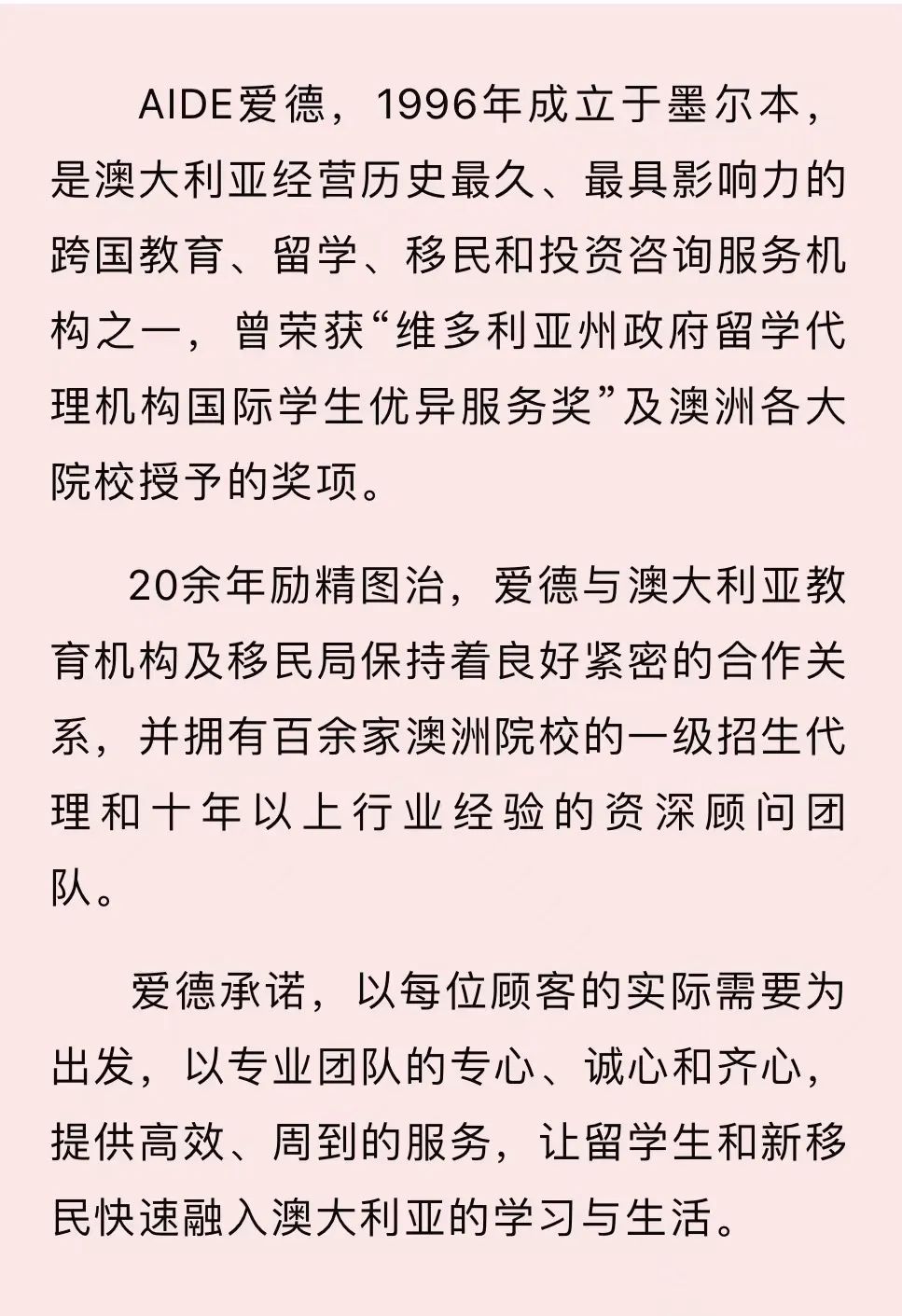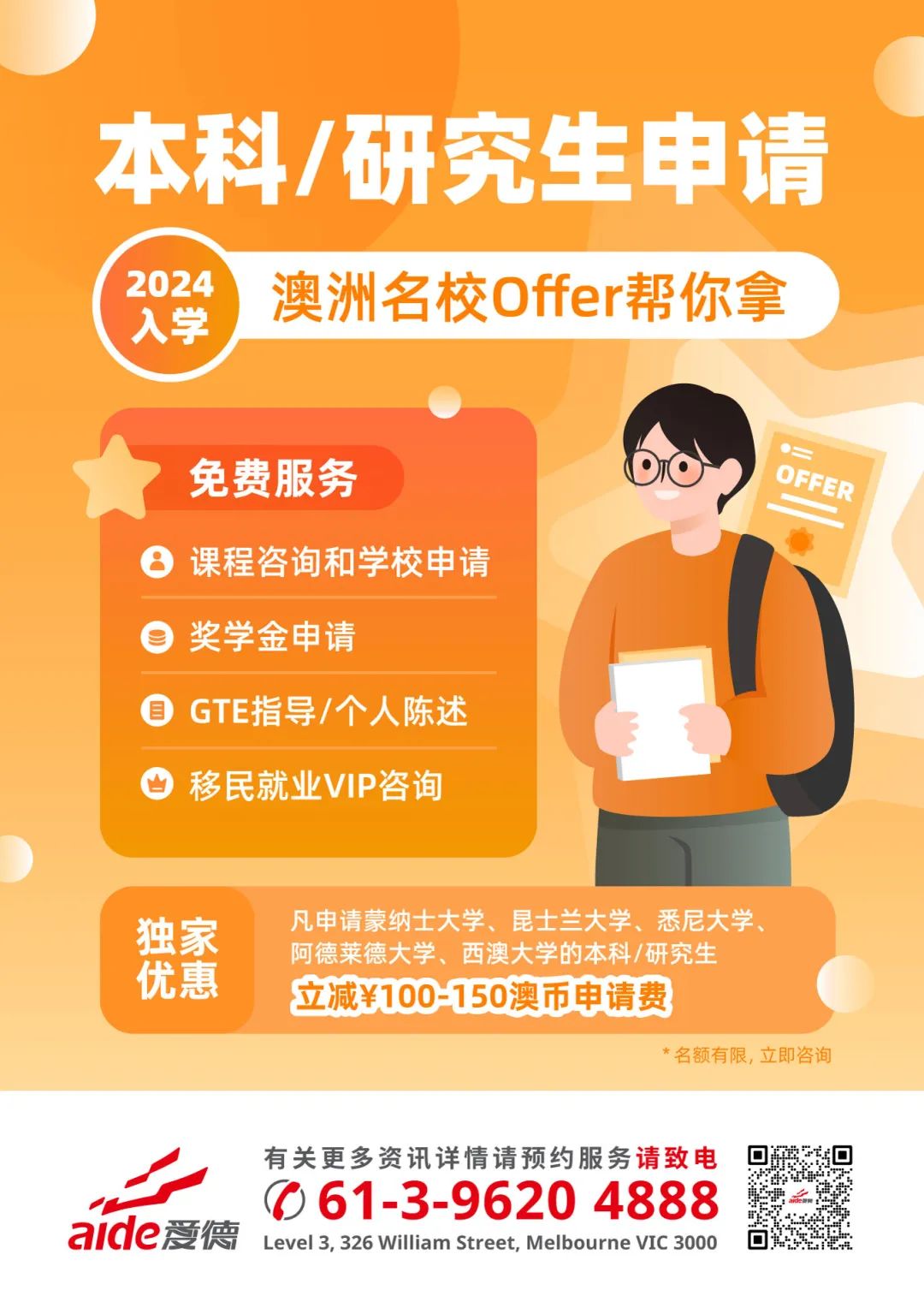 ![]() 国内考研即将出分,不少同学开始担心考研没有达到预期怎么办?小爱近期也收到了不少小伙伴的咨询,现在开始计划去澳洲留学还来得及吗?不同学位又该如何选择呢?今天小爱就详细地为大家整理了一份澳洲硕士留学申请攻略,建议收藏! 澳洲留学优势 ![]() 排名优势 澳洲拥有世界顶尖的教育资源和教育水平,“八大”院校更是闻名全球。据2024QS世界大学排名显示,澳大利亚共有9所大学进入世界前100,澳洲前8所大学排名均有上升!澳洲“八大”也在世界前100名单中聚齐! 悉尼科技大学更是直接上升47名,一跃进入世界前100名单!墨尔本大学、新南威尔士大学和悉尼大学也是迎来了质的突破,跻身进入世界前20! 多个院校排名超过国内985/211院校,入学门槛对比国内985/211院校来说,相对友好!本科均分70+就有机会申请到世界排名领先的院校。 ![]() ![]() 时间优势 澳大利亚大部分学校和专业开学时间为每年2月和7月,也可以选择三学期制,每年2月、6月、9月开学的学校。从现在开始选择学校专业,递交申请,准备语言考试,5月左右就能顺利拿到offer和签证,选择7月或9月入学都很合适。 单就学制而言,澳州大学的大部分研究生专业的学制是2年,而国内的大学一般是3年。澳大利亚还有部分1年制研究生课程可以选择,在澳洲拿到学位的时间要更快,效率也更高,也比复读考研更节省时间! ![]() ![]() 发展优势 澳洲大学教育多以市场为导向,注重培养学生的职业能力。澳洲留学毕业生在国际上受到了广泛的认可,展现了独立学习、工作的能力以及创新思维,而这些都是未来雇主最看重的品质。澳洲毕业生薪资水平达到澳币5万-6万,折合人民币约为25万-30万。 留学生在回国后也能拥有不错的待遇,国内各大城市都出台了关于留学生回国落户的政策,回国后不但能够享受落户优惠、购车补贴,创业还可以获得一系列的基金支持,任何留学生需要的补贴,政府都已经考虑到位!今年,中国各大主流城市都公布了境外大学认可名单,并向留学生开放选拔公务员。详情可查看:澳洲留学生赢麻了,毕业就能成为公务员?2024年中国境外大学认可名单公布,澳洲多所大学上榜! ![]() 移民优势 如果想要留在澳大利亚发展,澳大利亚是世界上最大的移民国家之一,留学生完成学业后可以进行移民申请,成功后就能获得澳洲的永久居留权,可享有医疗保险、失业救济、生育津贴、养老金等福利。 硕士申请该如何选择? ![]() Master by Coursework 授课型硕士 以导师授课的形式来完成硕士学位,是大部分留学生选择的学位。课程内容除了必要的课堂学习之外,还需要完成assignment、考试和实习等,最后通过提交论文或参加毕业考试获取硕士学位。学制一般为2年,但是本科有相关背景的可以通过学分减免或就读1年制快速研究生课程,将时长压缩至1-1.5年。 学习时长:1-2年 申请要求及方式:根据学校、专业和学历等,成绩及语言要求也有所不同。感兴趣的小伙伴们也可以扫描下方⬇️二维码联系AIDE爱德专业的顾问老师进行咨询! ![]() ![]() Master by Research 研究型硕士 以科研为目的完成硕士学位,课程内容主要为学生由导师带领完成课题研究。一般选择这类型的学生都会在研究生毕业后选择继续深造,升读博士学位。 学习时长:大部分课程为2年 申请要求:要求较高,一般需要学生在本科阶段参与科研课题或发表过学术论文等 申请方式:需要先找到研究方向并联系导师申请,再向学校提供相关资料以及导师推荐信等 硕士申请时间线 如果你还想为自己准备备选方案,或者赶在2024年7月前入学,现在开始准备还来得及!小爱准备了完整的申请时间线供小伙伴们参考~ ![]() 申请前期 开始前,需要做好以下几点准备: