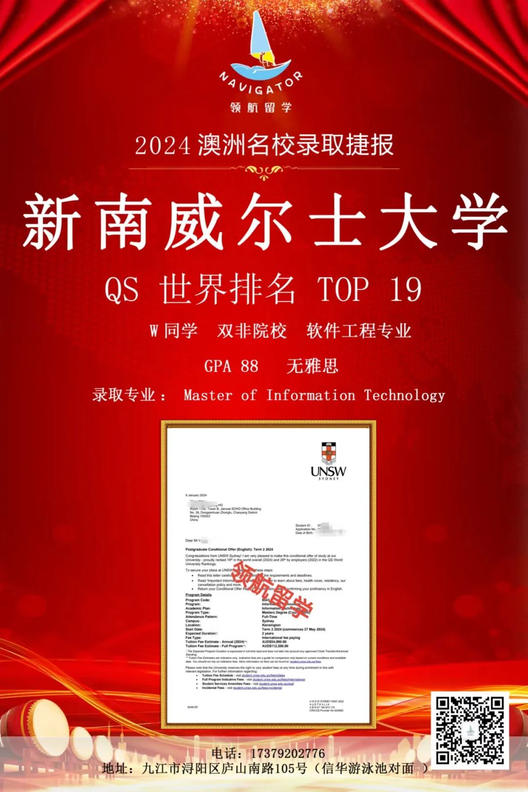 2024 Offer捷报 祝贺领航W同学获得 新南威尔士大学 Master of Information Technology 硕士项目录取 ![]() Offer展示 ![]() ![]() W同学背景 毕业院校:双非院校 本科专业:软件工程专业 GPA:88 录取结果:新南威尔士大学信息技术硕士 ![]() 新南威尔士大学介绍 新南威尔士大学(The University of New South Wales),简称UNSW,创立于1949年,主校区位于澳大利亚新南威尔士州首府悉尼,是一所世界顶尖公立研究型大学,也是澳大利亚八校联盟、环太平洋大学联盟、丝绸之路大学联盟、国际科技大学联盟、Universitas 21和英联邦大学协会成员。在2024年QS世界大学排名中,新南威尔士大学位列第19位。 ![]() 新南威尔士大学有“南半球麻省理工”之称,其工程学院是澳洲规模最大的工程学院 ,也是最负盛名、最多人申请和最严格的学院。 在QS世界学科排名中,其矿业工程排名世界第6,土木工程排名第12,电气工程排名第36。该校下设澳大利亚国防研究院所以被称为“战争学府”。澳洲最具影响力的百强工程师名单中近四分之一毕业于该校。 新南威尔士大学商学院也是亚太地区顶尖的商学院之一,拥有世界第15的会计学和金融学,世界第26的工商管理学,以及世界第31的经济学。其它学科中,新南威尔士大学在社会科学类位列世界第30,艺术与设计类位列第44,人文科学类位列第45,自然科学类位列第68,法学位列第14,心理学位列第21,建筑学位列第25。 ![]() 专业介绍 新南威尔士信息技术专业是一门综合性的专业,旨在培养学生在信息技术领域具备扎实的理论基础和良好的实践能力。该专业主要涵盖计算机科学、软件工程、网络技术等方面的知识,培养学生掌握信息技术相关的基本理论、方法和技能,能够应用信息技术解决实际问题。 ![]() ![]() 领航留学专业顾问咨询 领航留学 • 专注高端服务 我们专注于高端留学服务 留学移民|高校直升|名校申请|背景提升 高录取率 | 低门槛入学 | 一站式服务 ![]() 领航留学 做口碑最好的留学 领航留学于2017年在美国芝加哥创办,团队由世界顶尖名校硕士、资深海外留学顾问、高分雅思托福老师构成,硕博比率高达100%。领航留学业务涵盖留学申请、语言培训、国际业务等全领域,旨在为学生和家长提供留学、研学、语言培训、全球资产配置等一站式、专业化的国际服务。 领航留学以“以更好的课程,为学生圆梦名校”为原则,截止目前,累计培训了400余名学生,包括雅思、托福、多邻国、四六级、专升本、新概念、口语特训营等课程。近450多名学生通过领航留学获取理想的录取OFFER,录取已拿到包括斯坦福大学、哥伦比亚大学、宾夕法尼亚大学、杜克大学、约翰霍普金斯大学、香港大学、香港中文大学、澳洲悉尼大学、澳洲国立大学、剑桥大学、英国爱丁堡大学、英国曼彻斯特大学、新加坡南洋理工大学、日本筑波大学、新西兰奥克兰大学、加拿大多伦多大学等名校录取。 联 系 我 们 联系电话:17379202776(微信同号) 地址:九江市浔阳区庐山南路105号领航留学 |