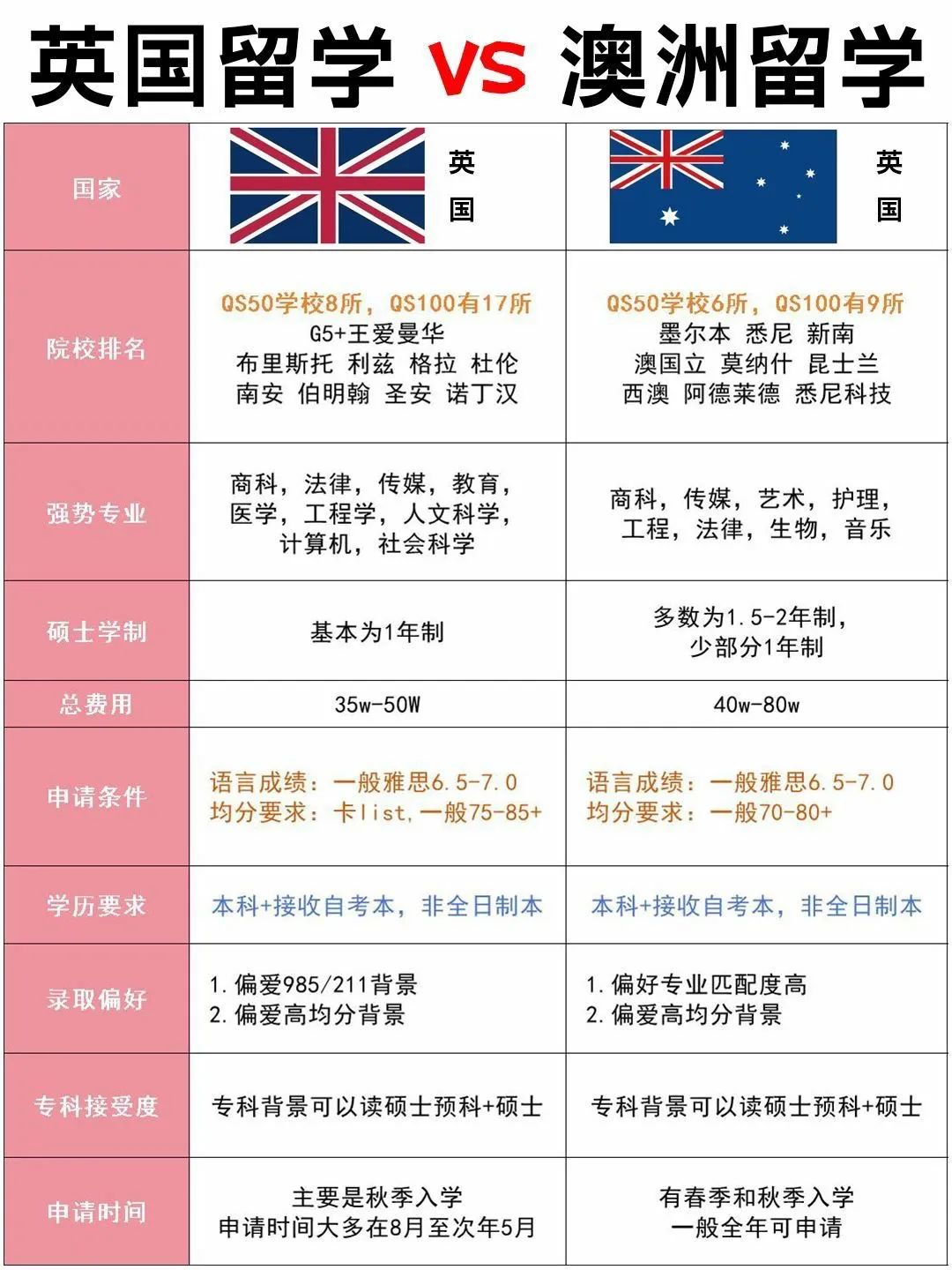 点击蓝色字关注我们! 英国和澳洲留学是不少学生的选择。 但是留学圈传闻的鄙视链,英硕档次要高于澳硕~ 💢那么事情真是如此吗? 看看英国留学vs澳洲留学各方面的对比吧 . 🌟英国硕士留学 ✅院校排名 QS50学校8所,QS100有17所 ✅硕士学制 基本为1年制 ✅申请条件 语言成绩:一般雅思6.5-7.0 均分要求:卡list,一般75-85+ ✅录取偏好 1.偏爱985/211背景 2.偏爱高均分背景 ✅申请时间 主要是秋季入学 申请时间大多在8月至次年5月 . 🌟澳洲硕士留学 ✅院校排名 QS50学校6所,QS100有9所 ✅硕士学制 多数为1.5-2年制,少部分1年制 ✅申请条件 语言成绩:一般雅思6.5-7.0 均分要求:一般70-80+ ✅录取偏好 1.偏好专业匹配度高 2.偏爱高均分背景 ✅申请时间 有春季和秋季入学 一般全年可申请 . 🙋详细信息,小编汇总在了下方表格,大家快来评评理吧~ ![]() ![]() 如果想了解具体学校申请要求,欢迎厚台dd咨询 ![]() ❤❤❤ 更多留学问题 欢迎免费咨询我们的顾问老师~ ![]() 获取更多留学干货、资讯 关注本公众号 ![]() 预约电话:4006-502-908 官网:http://www.unioffer.me http://www.unioffer.org.cn |