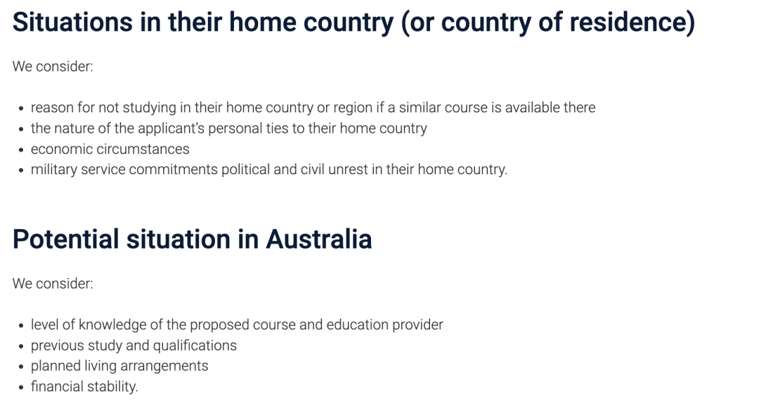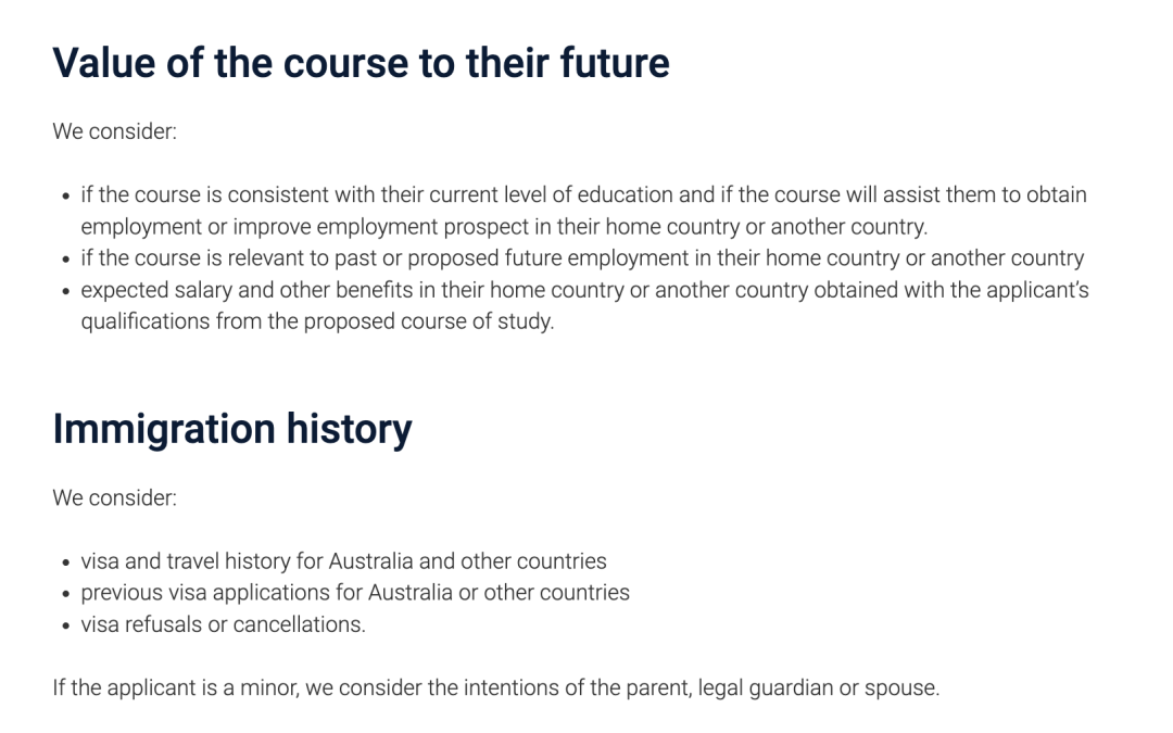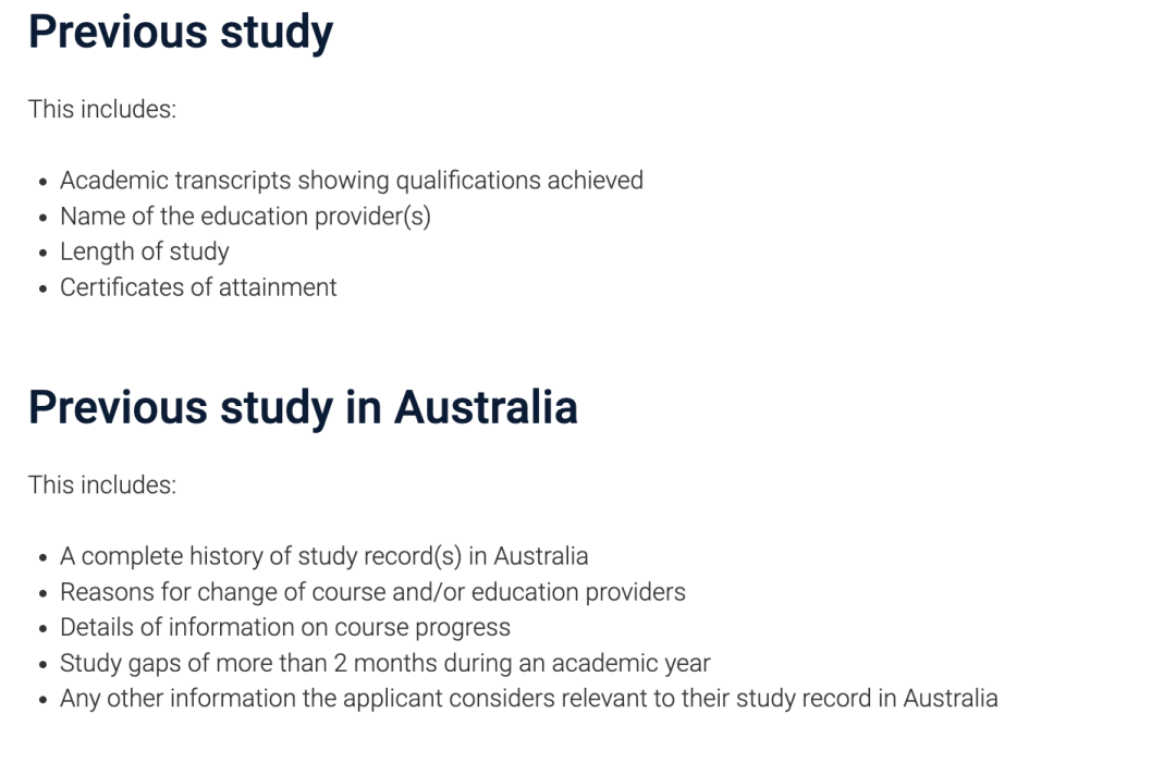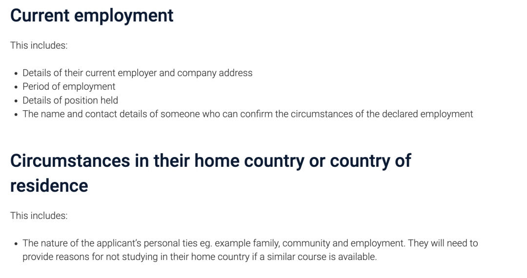 ![]() 图源:澳洲政府官网 对于新的GS要求有些同学可能表示一头雾水,不知道该怎么写?澳洲政府在官网上也提供了一些参考信息👇 Q 此前的学习经历 显示取得学历的成绩单; 教育提供者的名称; 学习时间; 是否达成了一些成就。 Q 此前在澳洲的学习经历(如有) 澳大利亚学习记录的完整历史; 课程和/或教育提供者变更的原因; 课程进度信息的详细信息; 一个学年中gap超过两个月的情况; 申请人认为与其在澳洲的学习记录相关的任何其他信息。 ![]() 图源:澳洲政府官网 Q 当前就业情况(如有) 当前雇主和公司地址的详细信息; 雇佣期限; 当前职位的详细信息; 能够确认该就业情况的人员的姓名和联系方式。 Q 本国的环境或条件 这个问题需申请人回答为什么不选择在本国完成相关专业的学习,也就是要说澳洲大学在这门课上的优势是什么? ![]() 图源:澳洲政府官网 Q 本国的经济环境或条件 提交申请前12个月的就业或商业活动证明文件; 课程结束后的潜在就业机会,包括工资和其他福利; 所得税申报表或银行对账单。 Q 本国的其他情况 不在本国或地区学习的原因(如果有类似的课程); 申请人与其祖国的个人原因; 经济环境;政治问题。 Q 澳洲的情况 课程提供者或课程的水平; 以前的学习和资格; 生活安排;经济稳定性。 ![]() 图源:澳洲政府官网 Q 所学课程对未来的价值