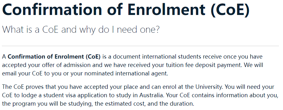 ![]() ![]() 24 fall 已接近尾声,相信准留学生们都拿到了满意的 offer,准备进入梦校深造。 回顾申请之路,由于个人条件和录取要求存在差异,大家的申请过程也会有所不同。 比方说,很多同学发现自己的 offer 怎么和别人不一样,尤其是前往澳洲读书的同学,还会发现一个让人迷惑的入学确认书 CoE。 offer 和 CoE 各有哪些类型,二者的区别又是什么?现在就为大家细细道来。 offer的三种类型 我们常说的 offer,就是留学申请成功后,学校发送的录取通知书。同时,招生院校会针对学生的实际情况发放三种不同的录取通知书:con-offer、full offer 和 packaged offer。 ![]() 条件录取Conditional offer letter 顾名思义,指有条件录取通知书,针对的是那些尚不满足学校入学条件的学生。 比如,高二在读申请预科,高三在读申请快捷课程或本科,大四在读申请硕士,以及在申请时没有合格的雅思成绩等。 ![]() 图源悉尼大学官网 尽管在申请时,学生尚不满足条件,但未来是有可能达到这些要求的。澳洲大学会酌情给予他们有条件录取。 一般条件如下: ✦ 完成当前课程学习,并获得毕业证书; ✦ 提供完整的成绩单,且均分不低于百分之多少; ✦ 达到学校要求的雅思/托福成绩,或通过学校指定的语言课程学习; ✦ GMAT/GRE 成绩(仅适用于墨尔本大学商科,及部分大学的 MBA 专业); ✦ CDGDC 清华认证(适用于个人名义申请悉尼大学,昆士兰大学的学生) 。 “要求怎么这么多”,相信不少同学已经开始挠头了。其实,大家不必过于担心,以上条件不大可能同时出现在一个条件录取中。 此外,申请者收到这样的录取通知书后,不能立马付学费,需要等满足上述要求后才可以。 ![]() 无条件录取Full offer letter 收到 full offer(或 Unconditional offers)的同学,恭喜你,这表明学校无条件地接受你入读他们专业(同时录取上会写明接受 offer 的最晚期限),可以马上支付学费,不出意外很快就能收到 CoE。 ![]() 图源悉尼大学官网 ![]() 打包式录取Packaged offer letters 这个英文直译过来就是“打包录取”,指包含多门课程的录取通知书,一般会包括语言课程,或其它衔接课程,用来连接主课。在对语言和专业性要求比较高的院校专业中,容易出现。 ![]() 图源新南威尔士大学官网 学生只有在读完衔接课程,达到要求,才可以拿到正式的 offer。 关于CoE ![]() 01 CoE是什么? CoE 的英文全称 Overseas Student Confirmation of Enrolment,是澳大利亚大学发给国际学生的官方文件,从字面意思可以看出,拥有此文件,即可证明学生已经确认在学校注册,即将成为该校正式学生。 简单来说,CoE 就是你的入学确认书,也是你申请学签的前提。 ![]() 图源阿德莱德大学官网 而且 CoE 的作用不止于此!作为学生,我们可以在澳洲生活的方方面面享有一定优惠和福利,而 CoE 和 Student Card(学生证)就是证明你身份的重要材料。 比如,在办理银行卡时,我们需要向银行出示 CoE,才能享受银行卡年费的优惠;在办理电话卡的时候,有 CoE 才能购买学生套餐等等,用途多多。 ![]() 02 Con CoE又是什么? 一些同学表示,收到了学校的 Con CoE,这又代表什么意思呢? Con CoE 也就是 Conditional CoE ,即条件 CoE。是针对那些 6 月毕业想衔接 7 月入学的大学学生。因为换取无条件录取需要毕业证明,及完成的成绩单。 通常,当学生能够提供这些材料的时候已是 6 月下旬,距离 7 月中下旬的澳洲开学只有最多 1 个月的时间,签证基本不太可能完成。 所以,很多大学都推出条件 CoE 来帮助应届大学毕业生有更充裕的时间处理他们的签证。 这样一来,学生最晚可以在 5 月份就提交签证申请(从 5 月到 7 月中下旬足足有 2 个多月的时间)。最后,学生在规定的期限内(通常是 7 月初)提供给澳洲学校毕业证,学位证和 8 学期成绩单就可以。 ![]() 03 以下情况,CoE可能被取消 一般 CoE 被取消的主要原因是未达到学校的学术要求,让学校认为你 “没有能力” 继续完成学业。 常见情况如下: ❖ 低于学校规定的出勤率; ❖ 必修科目重复不及格两次及以上; ❖ 连续两个学期超过 50% 以上科目不及格; ❖ 连续两个学期平均分低于及格线 ; ❖ 无法在规定延期的时间内完成课程; ❖ 没有按时缴纳学费; ❖ 没有按照学校要求上课。 offer与CoE之间的关系 我们首先要将二者做下对比。offer 是学校愿意接受学生申请的一个意向,学生向学校递交申请材料后,经过学校审核,符合入学资格者就可获学校的 offer。 CoE 是学生接受学校的 offer 后,向学校交付第一次学费预留学位后,学校发给学生的留学确认书。 而且,获得 CoE 有两个条件需要满足:其一,交付学费时 offer 依然有效;其二,交付学费时所申请专业还有空位。 换言之,拿到澳大利亚大学的 offer 不代表已经确定进入该校,只有缴纳过学费换取CoE 后才算稳了。要知道,校方是有可能在学生获得 offer 但未换取 CoE 前,将机会让给其他学生的。 ![]() ![]() 免责声明 本微信公众平台“澳途易出国留学”所发表内容注明来源的,版权归原出处所有(无法查证版权的或未注明出处的均来源于网络搜集)。转载内容(视频、文章、广告等)只以信息传播、学习交流为目的,仅供参考,不代表本平台认同其观点和立场,不具有任何商业用途,如有侵权问题请告知,我们会立即处理。内容的真实性、准确性和合法性由原作者负责。 |