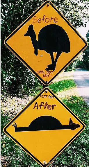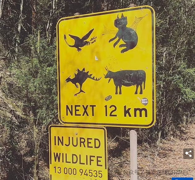 ![]() 从捕猎鸸鹋到巨型螃蟹,再到飞翔的袋獾,澳洲最古怪、最离奇的路标让游客们既困惑又有点害怕。 在澳洲驾车可能特别危险,是在是因为这个国家的野生动物众多,所以路边遍布警示标志,以提醒驾驶员。 有些标志很容易理解,比如经典的袋鼠过路标志。然而其他一些则让旅行者摸不着头脑。 ![]() 澳洲奇葩路牌 圣诞岛(Christmas Island)以其庞大的红蟹种群而闻名,在它们每年的迁徙期间,红蟹会封锁整条道路。 一位游客发现了一个“不寻常”的路标,告诫司机要警惕,不要在旅途中碾死任何一只这种受保护的小动物。 ![]() 小心袋鼠掀车 ![]() “小心袋鼠掀车,黄昏到黎明,限速65km/h!” 没到澳洲之前,大多数人都认为袋鼠蹦蹦跳跳挺可爱的;可到澳洲后,请一定谨记:远离袋鼠!澳洲的袋鼠大都“鼠”高马大,彪悍强壮,掀车砸车都不足为奇。切记切记,在澳洲,一定远离袋鼠! “野兽”出没 ![]() 昆州Cunnamulla的路标:谨防骆驼及其他野兽! 骆驼也算野兽?那其他野兽是什么? 敦促司机 在牧场常见的地区留意游荡的牛群。 一篇帖子展示了一头牛似乎正把一辆车掀翻的路标,并配文称:“澳洲有一些有趣的路标。” 这让一位网友不禁问道:“澳洲的牛很暴躁吗?” ![]() 请减速 ![]() 有时候,图画比文字的指示意义更好。比如在昆州Daintree雨林附近的苦难角(Cape Tribulation),这两幅生动形象的图片就告诉旅客:路上常有食火鸟(当地一种鸟类)出没,如果不减速,原本站立着甚至活蹦乱跳的食火鸟就要死翘翘了。 请减速 ![]() 有时候,图画比文字的指示意义更好。比如在昆州Daintree雨林附近的苦难角(Cape Tribulation),这两幅生动形象的图片就告诉旅客:路上常有食火鸟(当地一种鸟类)出没,如果不减速,原本站立着甚至活蹦乱跳的食火鸟就要死翘翘了。 保护袋狸 在澳洲的一些地区,袋狸也有自己的路标,以确保司机警惕这一濒危物种。 这些微小的有袋类动物常被误认为是啮齿动物,主要在夜间活动,因此鼓励司机放慢速度,以帮助保护这种濒临灭绝的动物。 ![]() 小心大螃蟹 ![]() 路标中这六指怪物是啥?答案是大闸蟹! 在圣诞岛(Christmas Island)上有很多巨型蟹,有些甚至有一米多长。为了避免游客被这些巨型蟹吓到或伤到,政府竖起了这样的路标。 给企鹅让路 ![]() 在澳大利亚部维多利亚湾的花岗岩岛(Granite Island) 随处可见憨态可掬的小企鹅,遇到肥嘟嘟的他们捕鱼后回家,记得给他们让路哦。 Consealed路 ![]() 话说,昆州黄金海岸地区这Consealed路究竟是什么路。按照土澳人民的思维方式来看,这应该是给那些带着大软帽,开拖拉机的人专门铺设的道路。 Coober pedy在这里 ![]() 小镇的路标是一辆挖矿车被架在一个高架板上。因为大家都住在地下嘛,总要有个显眼的标志,让出门的人不至于找不到回村的路。 闪电山脊路口 ![]() 和Coober Pedy一样,Lightining Ridge也是因欧珀闻名于世。它坐落于新南威尔士州内陆,这个地方并不难找,但他的人口数量一直是个未知数。就连这路标都在为人口问题发愁呢。 树杈指路牌 ![]() 按说荒漠中用树杈做路标也不稀奇,但是这么路标颜色这么接近,稍不注意就要错过的呀。这块路标是为了纪念一位充满传奇色彩的探路者-Len Beadell,他发现了西海岸到乌鲁鲁的路。 锡马指路牌 ![]() 这个用锡皮做成的路牌位于澳大利亚西部鲨鱼小镇附近的锡马高速公路边上,指向附近的赛马道。锡马高速全长20千米,路上的路牌都是类似这样,设计成马的形状,由锡皮做成。 该减速了 ![]() 这简单粗暴的路牌,位于北领地,是当地土著人制作的。直截了当的告诉你请把脚才在油门上,该减速了! 加速吧 ![]() 一看就和上面的路标出自以为“设计师”之手对不?同样是北领地的路标,告诉大家该加速了。 此外,在澳洲的一条道路上,一个要求游客不要打扰正在交配的袋鼠的限制级路标,也引发了人们的关注。 它竖立在一个袋鼠“繁殖区”,标志上展示了两只澳洲袋鼠正处于一种非常暗示性的体位。 ![]() 奇葩路牌再遭奇葩涂鸦 淘气的破坏者也喜欢用富有想象力的涂鸦非法改变路标,增添混乱。 Right2Drive也公布了Instagram上“最受欢迎”的澳洲路标,其中袋獾的路标获得了超过2.3万个回应,位居榜首。 袋獾张开嘴露出利齿,这是只能在塔州才能看到的专属标志,鼓励司机留意这种自2008年以来就濒临灭绝的有袋类动物。 ![]() 一位路人甚至在一个标志上加了一对蝙蝠翅膀,让袋獾看起来更加凶猛。 在西澳的Exmouth,鸸鹋到处乱跑,在路上撞上会非常危险。 虽然有许多标志提醒司机注意它们的存在,但有一个标志有个有趣的补充。它看起来像是一个人骑在两米高的鸟背上,但据说这表明该地区正在进行鸸鹋狩猎。 ![]() 昆州Daintree雨林一个路标上的创意涂鸦让许多人捧腹大笑。 一位Instagram网友称:“开车走出澳洲的大城市,你一定会遇到一些奇特而美妙的路标(比如这个来自昆州北部Daintree雨林的路标),展示了食火鸡与超速汽车相撞的命运。” ![]() 一个关于该地区减速带的警告位于通知人们该地区有食火鸡出没的标志的下方,但有人修改了警告上的显示内容。 减速带被画成了一只被压扁的食火鸡,展示了车辆与其中一只食火鸡相撞“之前”和“之后”的情形,并提醒人们“冷静点,不要直接撞上”。 当地议会多次更换了该路标,但最终放弃了,因为涂鸦总是被重新画上。 另一位有艺术天分的涂鸦者对野生动物路