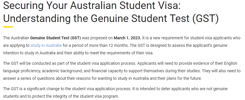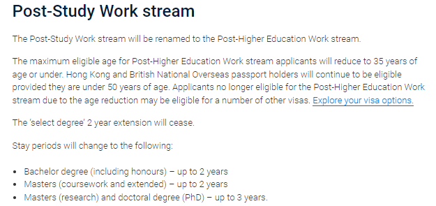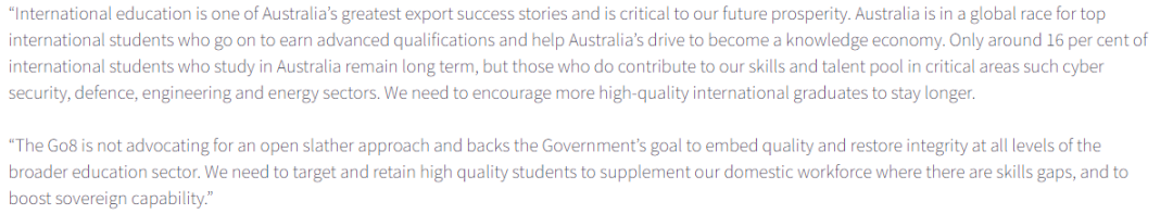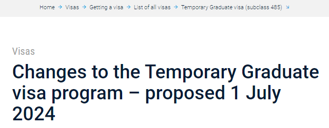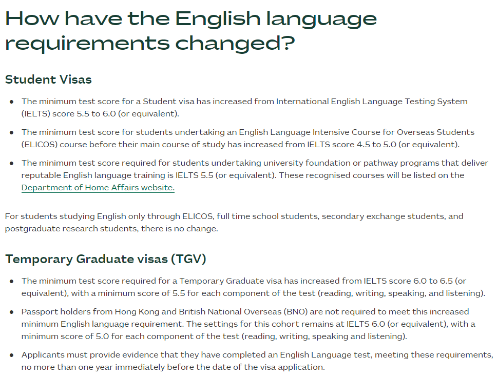 同时,官网上也发布了留学签证的最新要求。 ![]() 主要变动包括:存款证明金额提高17%,从21,041澳元升至24,505澳元;平行coe被取消(不可同时在多个高校注册入学)等等。 当然,对于澳洲对国际留学态度的变化,澳洲八大提出了不一样的观点。 ![]() 链接:澳洲八大联合出手挽留留学生 代表澳大利亚顶尖研究型大学的八校联盟(Go8)近期发布了一份政策文件。 ![]() 文件通过经济分析数据反驳了国际学生数量与澳大利亚当前住房危机存在直接联系的说法。呼吁从供给侧根本解决问题,同时重视国际教育对澳大利亚未来发展的重要性。 文件指出,住房负担能力危机和日常生活成本上涨,根本上是一个供给侧问题,与国际学生入境无直接关联。 数据显示,2023年国际学生对澳大利亚GDP增长的贡献高达0.8%,占经济增长1.5%的一半以上。国际教育已成为澳大利亚最大的出口成功案例之一,对未来繁荣至关重要。 ![]() 八大主张:不要将责任归咎于这群对国家经济做出巨大贡献的学生。相反,应当鼓励更多国际优秀毕业生长期留在澳大利亚,为科技、国防等关键领域输送技能和人才。 ![]() 485毕业生工签改革 根据最新的公告,从7月1日开始,485毕业生工作签证(485 Graduate Work stream)将更名为后职业教育工作签证(Post-Vocational Education Work stream,简称PVEW)。 ![]() 另外,申请人的最高年龄限制将由50岁降低至35岁及以下。 不过,年龄在50岁以下的中国香港地区及英国国民海外护照(BNO)持有人不受该年龄限制,仍可继续申请这项签证。 最后,授课型硕士及博士的485毕业生签证时长均缩短1年,从原来的硕士3年变更为2年,博士4年变更为3年,本科依旧为2年。 ![]() ![]() 签证评估采用真实学生测试 有意留学的学生现在必须通过真实学生测试(GST),这是澳大利亚政府去年11月作为国际学生签证申请过程的一部分引入的措施。 ![]() 这项新测试旨在评估申请人是否真正打算暂时留在澳大利亚学习。GST取代了之前的真实临时入境要求。 它的目的是区分并优先考虑那些最有可能以学习而非工作为主要目的,并为澳大利亚经济贡献所需技能的人。 实际上,那些追求较低级别证书的学生最有可能被拒签。 国际学生在签证申请中如果坦白说出他们希望移民到澳洲,将不再被视为“不良记录”! ![]() 多所大学不再认可online语言成绩 对于语言成绩的认可也发生了变化。包括墨尔本大学、澳国立大学在内的多所澳洲大学都宣布,不再认可online语言成绩。 但对于常规的雅思线下纸笔考试、机考的认可度是不变的! ![]() 此前,澳洲政府还提高了申请澳洲签证所需的英语语言成绩: