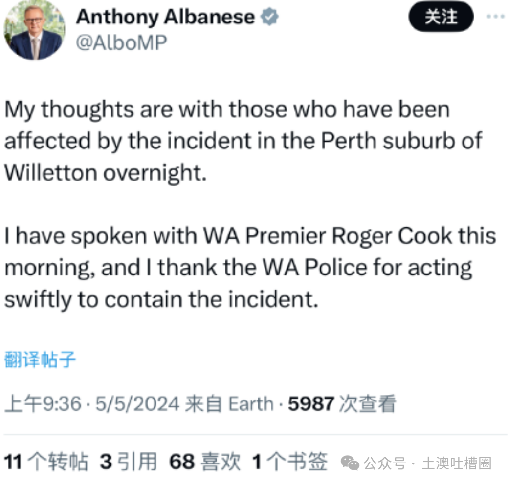 5月4号,Perth华人区一家Bunnings的停车场,发生了砍人事件!![]() 一名才16岁的青少年手持30厘米的大刀当场砍人!还好最后被当场击毙,没有太多人生受伤! 5月4日,一名16岁的青少年在珀斯刺伤了一名受害者,并随后持刀冲向警察,最终被当场击毙。 目击者表示:在Bunnings停车场,当一位女士准备回到自己的车时,突然听到其中一位朋友发出尖叫声,她回头一看,发现一个本地年轻人正从她朋友的背部拔出一把长约30厘米的刀,向他们攻击! ![]() (该停车场的血迹) 华人网友在社交媒体上表示:是一名华人男子受伤,好在不严重。 年仅16岁的青少年当街砍人!此事件甚至都震惊到澳总理那里了! 他也发帖表示关注此事! ![]() 很震惊他表示:我的心与受到该事件影响的人同在。 最近澳洲哪里治安都堪忧!大家多多注意安全! -- END -- 公众号后台回复“ 互助群”,即可进入澳洲互助交友群! 公众号后台回复“ 吃瓜群 ”,即可进入土澳吃瓜群! 更多有趣内容关注土澳吐槽圈 投稿,吐槽,商务合作联系圈圈君(quanquanjun3): ![]() 往期精彩内容:墨尔本deakin普信男,立牌坊人前一套背后一套。 |避雷悉尼老外恶心男:爱钓鱼,抠门,不单身还出去约会。小姐姐冒着大雨赴约被鸽子还被拉黑!|悉尼小哥被美女留学生搭讪后被骗1500刀。| 猫本中年普信油腻男:“搞艺术的多少沾点”|吐槽悉尼某剧本店老板,商业大鳄竟欠2000块拖2个月。|土澳版KCl公主:阿姨天天自诩公主|USYD不刷牙806粉丝网红男:穿fk逛专柜,软饭硬吃,跨年转0.1巨款。| 避雷澳洲坑人租房中介,已被超多人吐槽!|重生之我在墨尔本以骗谋生。|uq 高材生宝格丽慈善款都要据为己有 |