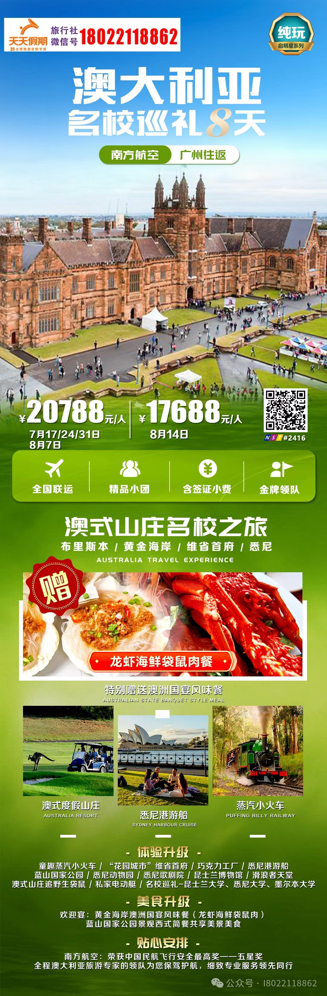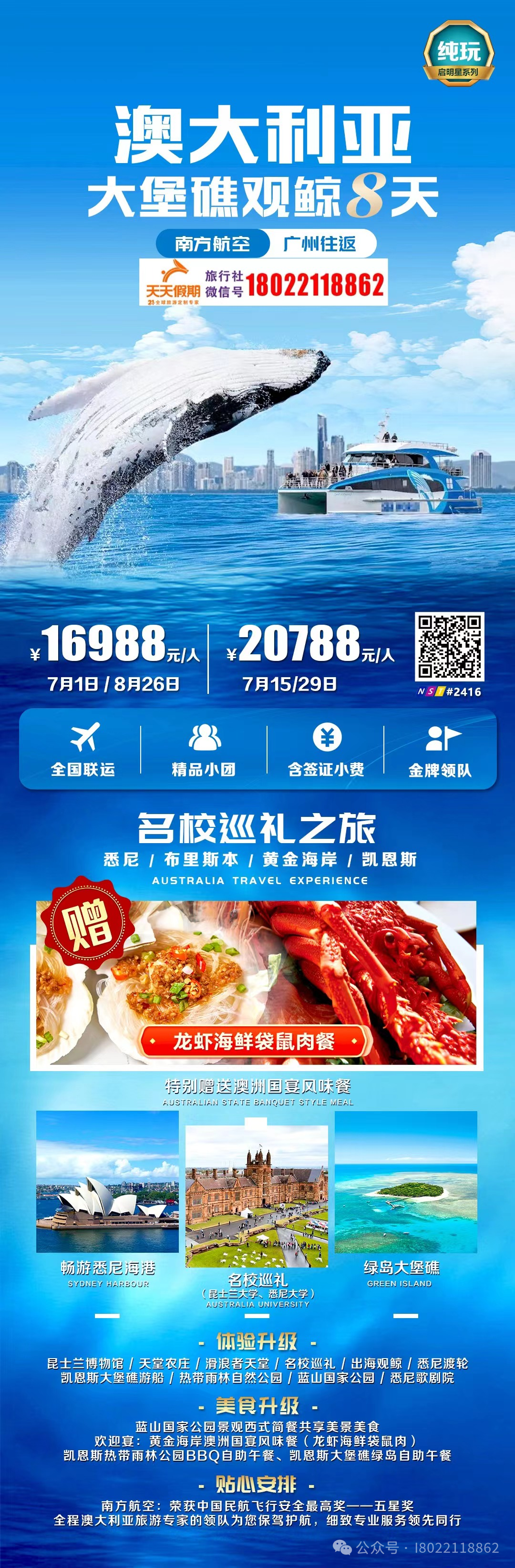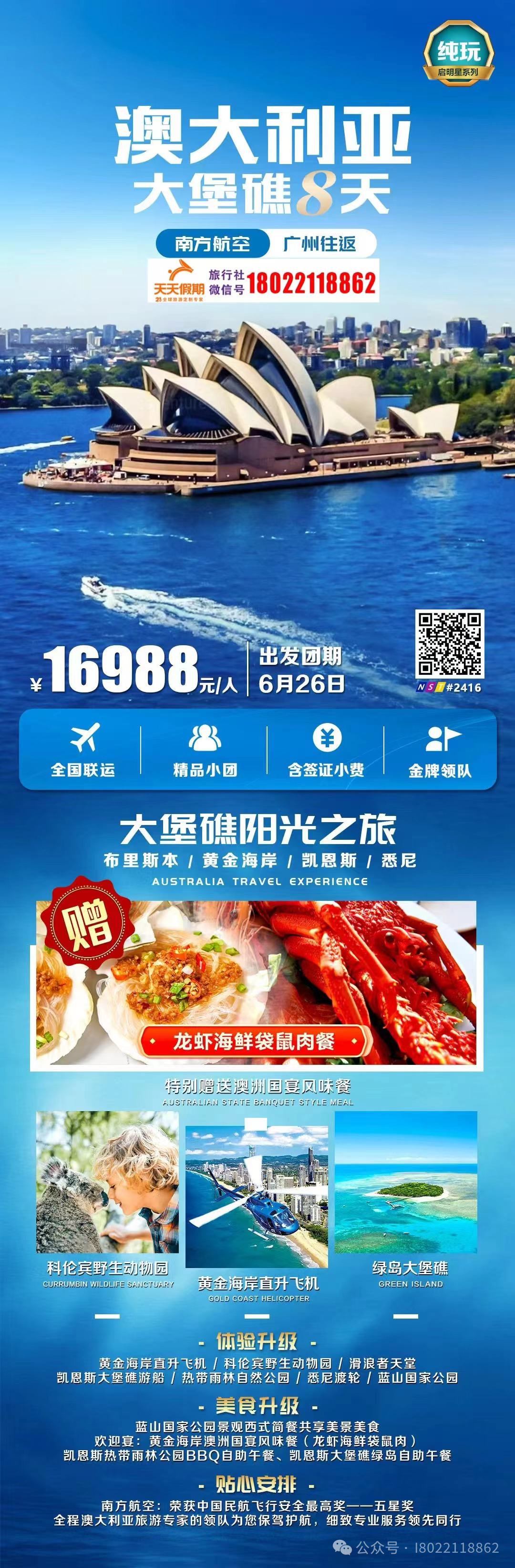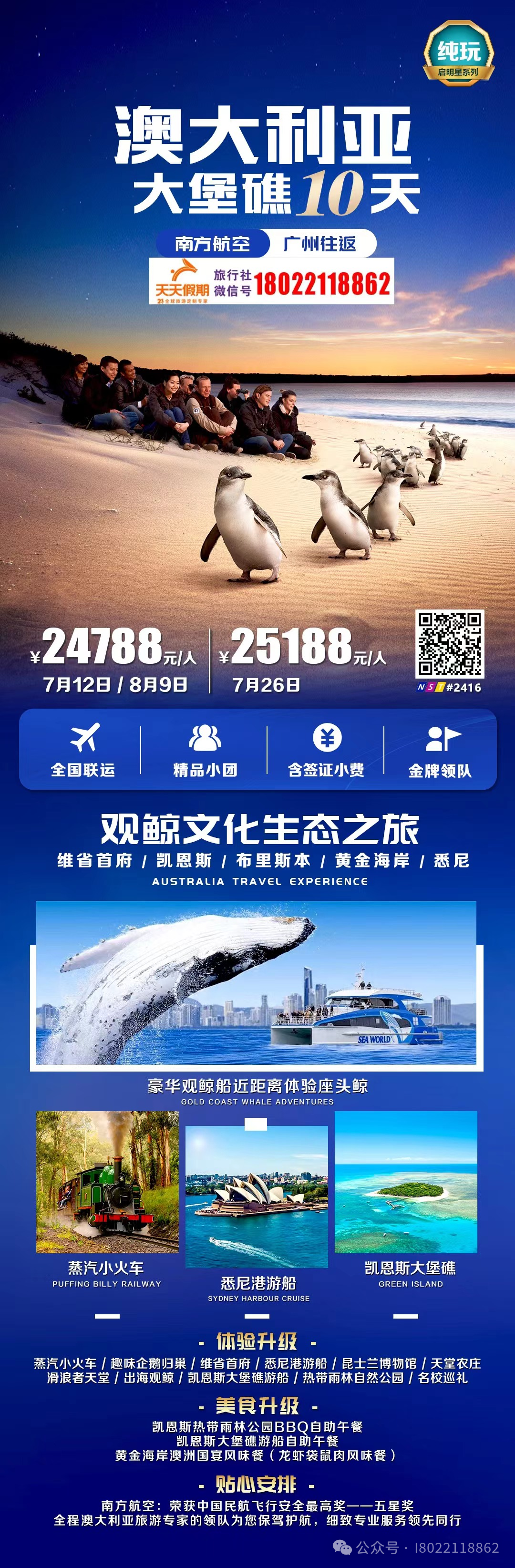 ![]() 在澳洲这边美丽土地的一个小插曲散落着无数的星辰悉尼、墨尔本... 在澳大利亚旅行让你感受不同城市不同的风情。 ![]() 01 悉尼迷人的海港 读小学时候音乐老师就告诉你你,澳大利亚就有个著名的悉尼歌剧院。那地理老师有没有告诉你,还有邦迪海滩、棕榈海滩等。 ![]() ![]() 悉尼的大街小巷不仅遍布各种特色的路边摊,更有世界一流的餐厅,从精致的亚洲美食到充满创意的融合料理应有尽有。而在闻名世界的悉尼鱼市场,你能买到来自澳大利亚各地的最新鲜的海鲜。 去惯了东南亚的炙热阳光,来感受下南半球的和煦阳光的不同。用一天时间漫步在海滩上享受快节奏城市的悠闲。 建议游玩:1-3天 02 饕餮盛宴,饮食男女的墨尔本 对于注重美食的游客来说,墨尔本可以称得上是世界上最好的目的地之一。特别是在阿克兰大街和菲茨罗伊大街,优质餐馆一大把。 ![]() 澳洲盛产优质牛肉,最美味的做法毫无疑问是牛排。不同的餐厅都有各自独特的做法,草养黑安格斯T牛仔骨、干式熟成肉眼骨排、大卫布莱克摩尔全血和牛餐...配上洋葱和西红柿这些简单又经典的配菜...足以让你的味蕾得到满足。 ![]() ![]() 不可错过的还有澳洲龙虾,这是吃货来到墨尔本一定要品尝的美味,肉质鲜嫩,虾肉中凝聚了海洋深处的秘密。 ![]() 03 精致的布里斯班,艺术与极限碰撞 你呀,是自在如风的少年。在布里斯班河的船上哼一首轻快的阳光小调是文艺青年的菜。 ![]() 玻璃屋山脉(Glasshouse Mountains)崖壁上的缘绳速降,这种刺激才能释放我封印千年的本尊~ ![]() 你也可以选择去布里斯班的南岸步行或骑自行车穿过布里斯班河(Brisbane River)的,既能欣赏到城市最美的一面,又能锻炼身体。布里斯班南岸的人工免费供人们使用,洁净细柔的白沙和郁郁葱葱的亚热带植物围绕着一泓波光潋滟的泻湖,每个角落都是风景。 南岸因其多样的娱乐休闲活动而闻名,拥有占地17公顷的公园、餐厅、咖啡馆、酒吧、精品店、博物馆和美术馆。或是坐上布里斯班摩天轮(Brisbane Wheel),从别样的角度领略城市的旖旎风光。 04 完美假期,从阿德莱德的风光大片开始 袋鼠岛一定是要去的地方,南澳大利亚被《Lonely Planet孤独星球》杂志评为2017年“十大最佳旅行地区”。 ![]() 小巧精致的阿德莱德市中心,绿意盎然的公园河流,宽敞的道路,你可以在20分钟之内驾车到达你想去参观的海滩或山脉,当然你也可以选择步行,体验这座城市的魅力。 ![]() 阿德莱德也是一个探索南澳大利亚其他地区的门户城市。无论是去闻名世界的产酒区芭萝莎,风光旖旎的菲尔半岛、拥有‘没有围栏的动物园’之称的袋鼠岛、海鲜前哨艾尔半岛、大自然的神来之笔石灰岩海岸还是古老的内陆,阿德莱德都是最佳的起点,只需最多2个小时的飞行或者驾车。 ![]() 如果你或者有小伙伴对酒文化感兴趣,那闻名世界的产酒区芭萝莎也是必去的旅行地。 05 属于情侣蜜月的珀斯,享受此刻的静谧 澳大利亚保存最好的19世纪街景,让时光静止,你我就沉浸在此刻的美好,就好。 ![]() 蜜月的你们,在科特斯洛海滩游泳、冲浪,或者欣赏夕阳,然后去往北桥物美价廉的食肆和时髦的酒吧。 ![]() 顺便去下国王公园,在那边留下一组漂亮甜蜜的旅行照,漫山的花海在天空下绚烂绽放。 06 透过堪培拉,聆听一个国度的故事 如果不去格里芬湖,不看喷射式喷泉,就不能说到过堪培拉。湖中有为纪念库克船长而建造的喷泉,它从湖底喷出的水柱高达137米,站在全城任何地方,都可以看到高大的白色水柱直刺蓝天。 ![]() 你看到一座城的风景,那你是否知道它背后的故事?这里也是探寻澳大利亚文化的最佳去处,国会大厦、澳大利亚战争纪念碑、澳大利亚国立美术馆等。 ![]() 07 跳动的音符,文艺的达尔文 户外节日、水滨餐厅、热带园林与艺术街区等无一不让人感受到达尔文的温和气候、不拘一格的美食与文化。在明迪尔海滩黄昏市场品尝达尔文的味道; ![]() 乘船游览达尔文港(Darwin Harbour);参观博物馆,追寻当地动人历史。 08 最时髦的凯恩斯 以前读过一本书《世界上最美的100个地方》封面是大堡礁,这是最吸引我,也是我不得不买的理由。 ![]() 从凯恩斯启程,遍游大堡礁和戴恩树热带雨林的美丽角落。 ![]() 经 典 推 荐 ![]() ![]() ▲↑识别上图二维码看详细行程↑▲ ![]() ▲↑识别上图二维码看详细行程↑▲ ![]() ▲↑识别上图二维码看详细行程↑▲ ![]() ▲↑识别上图二维码看详细行程↑▲ ![]() ▲↑识别上图二维码看详细行程↑▲ ![]() ▲↑识别上图二维码看详细行程↑▲ ![]() ▲↑识别上图二维码看详细行程↑▲ ![]() ▲↑识别上图二维码看详细行程↑▲ ![]() ▲↑识别上图二维码看详细行程↑▲ ![]() ▲↑识别上图二维码看详细行程↑▲ ![]() ![]() ![]() 微信咨询报名 微信公众号 关注中山市寰球风光国际旅行社了解更多 、 ![]() ![]() 免责声明: 1、 文章部分文字与图片来源《蓝胖胖儿 稻城亚丁景区》》2、 因编辑需要文字和图片之间亦无必然联系,仅供读者参考。3、 我们所转载的所有文章、图片、音频视频文件等资料版权归版权所有人所有,因非原 创文章及图片等内容,无法一一和版权者联系,如原作者或编辑,认为作品不宜上网 供大家浏览,或不应无偿使用,请及时通知我们,以迅速采取适当措施,避免给双方 造成不必要的经济损失。4、 本网页如无意中侵犯了媒体或