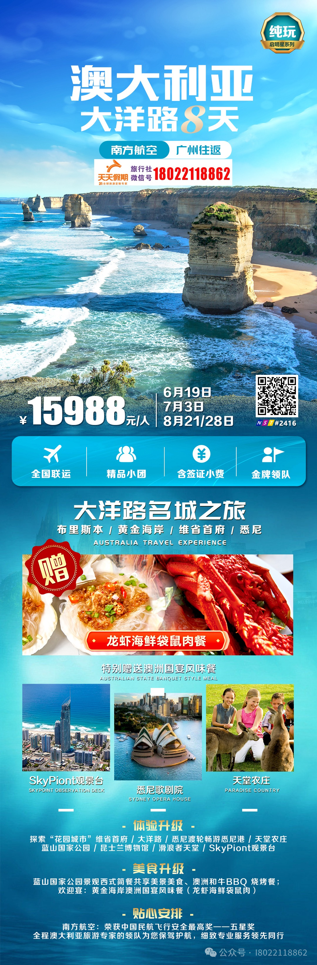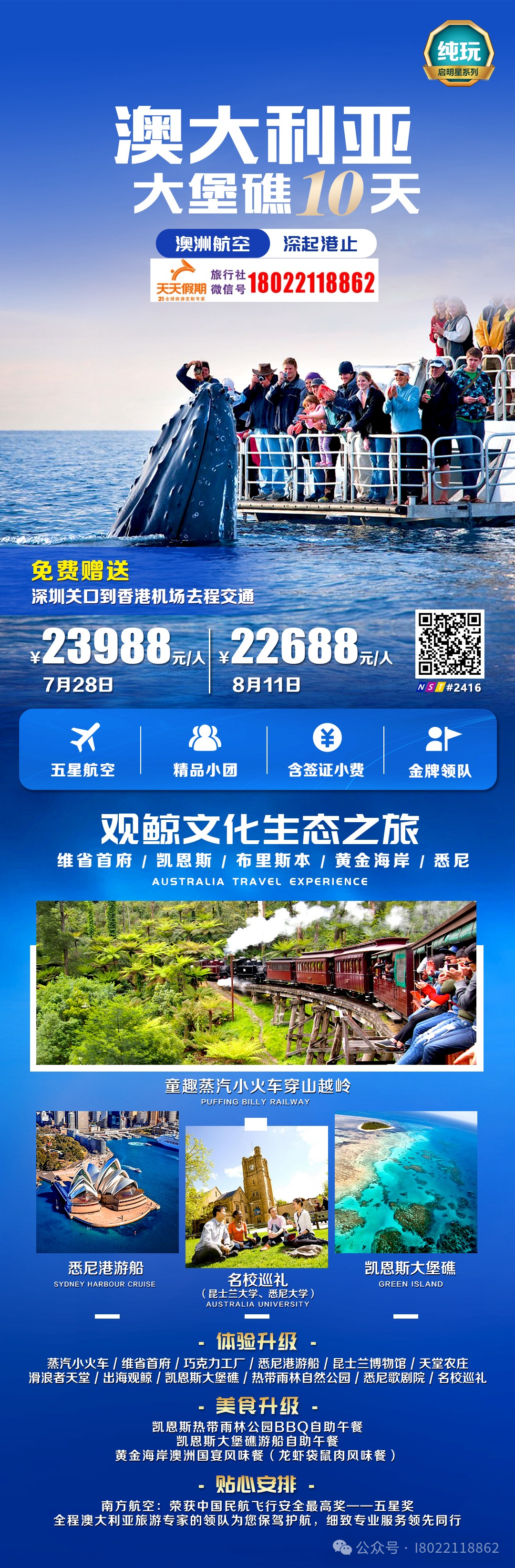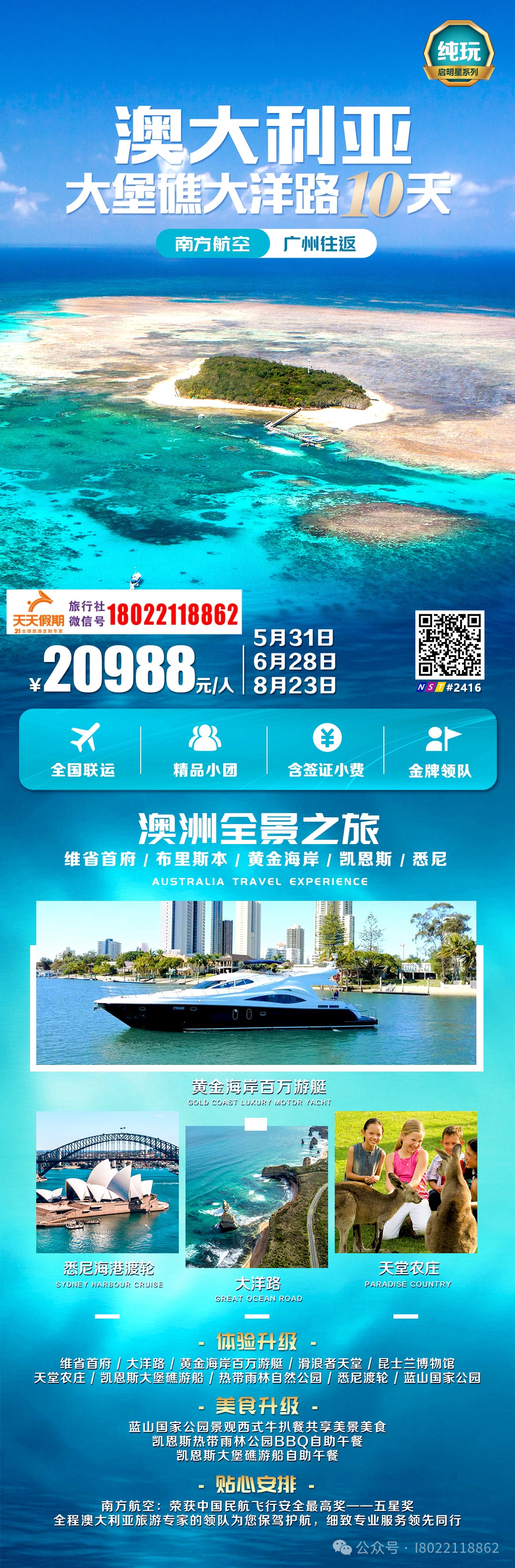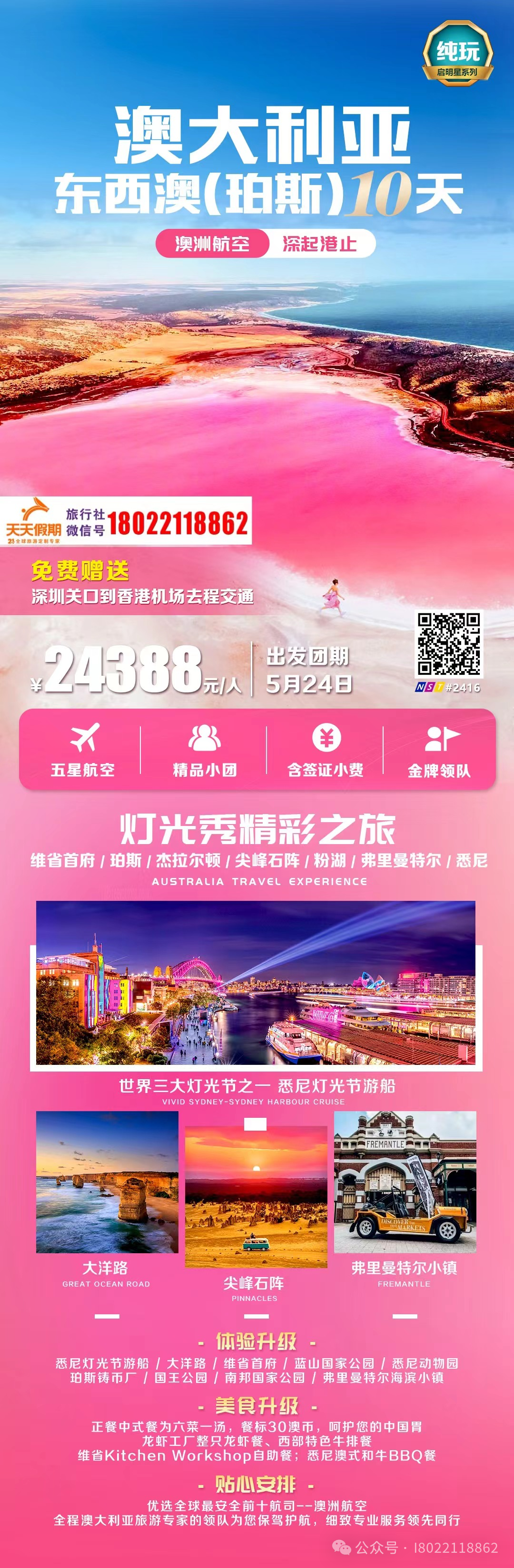 ![]() 在澳洲这边美丽土地的一个小插曲散落着无数的星辰悉尼、墨尔本... 在澳大利亚旅行让你感受不同城市不同的风情。 ![]() 01 悉尼迷人的海港 读小学时候音乐老师就告诉你你,澳大利亚就有个著名的悉尼歌剧院。那地理老师有没有告诉你,还有邦迪海滩、棕榈海滩等。 ![]() ![]() 悉尼的大街小巷不仅遍布各种特色的路边摊,更有世界一流的餐厅,从精致的亚洲美食到充满创意的融合料理应有尽有。而在闻名世界的悉尼鱼市场,你能买到来自澳大利亚各地的最新鲜的海鲜。 去惯了东南亚的炙热阳光,来感受下南半球的和煦阳光的不同。用一天时间漫步在海滩上享受快节奏城市的悠闲。 建议游玩:1-3天 02 饕餮盛宴,饮食男女的墨尔本 对于注重美食的游客来说,墨尔本可以称得上是世界上最好的目的地之一。特别是在阿克兰大街和菲茨罗伊大街,优质餐馆一大把。 ![]() 澳洲盛产优质牛肉,最美味的做法毫无疑问是牛排。不同的餐厅都有各自独特的做法,草养黑安格斯T牛仔骨、干式熟成肉眼骨排、大卫布莱克摩尔全血和牛餐...配上洋葱和西红柿这些简单又经典的配菜...足以让你的味蕾得到满足。 ![]() ![]() 不可错过的还有澳洲龙虾,这是吃货来到墨尔本一定要品尝的美味,肉质鲜嫩,虾肉中凝聚了海洋深处的秘密。 ![]() 03 精致的布里斯班,艺术与极限碰撞 你呀,是自在如风的少年。在布里斯班河的船上哼一首轻快的阳光小调是文艺青年的菜。 ![]() 玻璃屋山脉(Glasshouse Mountains)崖壁上的缘绳速降,这种刺激才能释放我封印千年的本尊~ ![]() 你也可以选择去布里斯班的南岸步行或骑自行车穿过布里斯班河(Brisbane River)的,既能欣赏到城市最美的一面,又能锻炼身体。布里斯班南岸的人工免费供人们使用,洁净细柔的白沙和郁郁葱葱的亚热带植物围绕着一泓波光潋滟的泻湖,每个角落都是风景。 南岸因其多样的娱乐休闲活动而闻名,拥有占地17公顷的公园、餐厅、咖啡馆、酒吧、精品店、博物馆和美术馆。或是坐上布里斯班摩天轮(Brisbane Wheel),从别样的角度领略城市的旖旎风光。 04 完美假期,从阿德莱德的风光大片开始 袋鼠岛一定是要去的地方,南澳大利亚被《Lonely Planet孤独星球》杂志评为2017年“十大最佳旅行地区”。 ![]() 小巧精致的阿德莱德市中心,绿意盎然的公园河流,宽敞的道路,你可以在20分钟之内驾车到达你想去参观的海滩或山脉,当然你也可以选择步行,体验这座城市的魅力。 ![]() 阿德莱德也是一个探索南澳大利亚其他地区的门户城市。无论是去闻名世界的产酒区芭萝莎,风光旖旎的菲尔半岛、拥有‘没有围栏的动物园’之称的袋鼠岛、海鲜前哨艾尔半岛、大自然的神来之笔石灰岩海岸还是古老的内陆,阿德莱德都是最佳的起点,只需最多2个小时的飞行或者驾车。 ![]() 如果你或者有小伙伴对酒文化感兴趣,那闻名世界的产酒区芭萝莎也是必去的旅行地。 05 属于情侣蜜月的珀斯,享受此刻的静谧 澳大利亚保存最好的19世纪街景,让时光静止,你我就沉浸在此刻的美好,就好。 ![]() 蜜月的你们,在科特斯洛海滩游泳、冲浪,或者欣赏夕阳,然后去往北桥物美价廉的食肆和时髦的酒吧。 ![]() 顺便去下国王公园,在那边留下一组漂亮甜蜜的旅行照,漫山的花海在天空下绚烂绽放。 06 透过堪培拉,聆听一个国度的故事 如果不去格里芬湖,不看喷射式喷泉,就不能说到过堪培拉。湖中有为纪念库克船长而建造的喷泉,它从湖底喷出的水柱高达137米,站在全城任何地方,都可以看到高大的白色水柱直刺蓝天。 ![]() 你看到一座城的风景,那你是否知道它背后的故事?这里也是探寻澳大利亚文化的最佳去处,国会大厦、澳大利亚战争纪念碑、澳大利亚国立美术馆等。 ![]() 07 跳动的音符,文艺的达尔文 户外节日、水滨餐厅、热带园林与艺术街区等无一不让人感受到达尔文的温和气候、不拘一格的美食与文化。在明迪尔海滩黄昏市场品尝达尔文的味道; ![]() 乘船游览达尔文港(Darwin Harbour);参观博物馆,追寻当地动人历史。 08 最时髦的凯恩斯 以前读过一本书《世界上最美的100个地方》封面是大堡礁,这是最吸引我,也是我不得不买的理由。 ![]() 从凯恩斯启程,遍游大堡礁和戴恩树热带雨林的美丽角落。 ![]() 经 典 推 荐 ![]() ![]() ▲↑识别上图二维码看详细行程↑▲ ![]() ▲↑识别上图二维码看详细行程↑▲ ![]() ▲↑识别上图二维码看详细行程↑▲ ![]() ▲↑识别上图二维码看详细行程↑▲ ![]() ▲↑识别上图二维码看详细行程↑▲ ![]() ▲↑识别上图二维码看详细行程↑▲ ![]() ▲↑识别上图二维码看详细行程↑▲ ![]() ▲↑识别上图二维码看详细行程↑▲ ![]() ▲↑识别上图二维码看详细行程↑▲ ![]() ▲↑识别上图二维码看详细行程↑▲ ![]() ![]() ![]() 微信咨询报名 微信公众号 关注中山市寰球风光国际旅行社了解更多 、 ![]() ![]() 免责声明: 1、 文章部分文字与图片来源《蓝胖胖儿 稻城亚丁景区》》2、 因编辑需要文字和图片之间亦无必然联系,仅供读者参考。3、 我们所转载的所有文章、图片、音频视频文件等资料版权归版权所有人所有,因非原 创文章及图片等内容,无法一一和版权者联系,如原作者或编辑,认为作品不宜上网 供大家浏览,或不应无偿使用,请及时通知我们,以迅速采取适当措施,避免给双方 造成不必要的经济损失。4、 本网页如无意中侵犯了媒体或