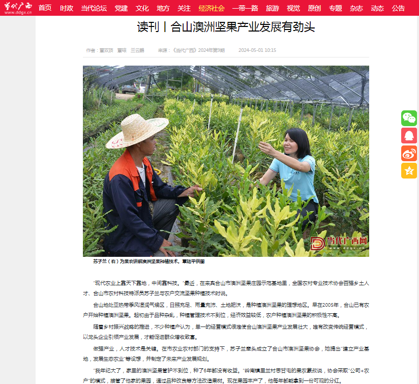 ![]() 2024年第9期出版的《当代广西》刊发:《合山澳洲坚果产业发展有劲头》。全文如下。 ![]() “现代农业上靠天下靠地,中间靠科技。”最近,在来宾合山市澳洲坚果庄园示范基地里,全国农村专业技术协会百强乡土人才、合山市农村科技特派员苏子兰与农户交流坚果种植技术时说。 合山地处亚热带季风湿润气候区,日照充足、雨量充沛、土地肥沃,是种植澳洲坚果的理想地区。早在2005年,合山已有农户开始种植澳洲坚果。起初由于品种杂乱,种植管理技术不到位,经济效益较低,农户种植澳洲坚果的积极性不高。 随着乡村振兴战略的推进,不少种植户认为,单一的经营模式很难使合山澳洲坚果产业发展壮大,唯有改变传统经营模式,以龙头企业引领产业发展,才能促进群众增收致富。 做强产业,人才技术是关键。在市农业农村部门的支持下,苏子兰牵头成立了合山市澳洲坚果协会,她提出“建立产业基地,发展生态农业”等设想,并制定了未来产业发展规划。 “我年纪大了,家里的澳洲坚果管护不到位,种了6年都没有收益。”岭南镇里兰村思甘屯的果农蒙叔说,协会采取“公司+农户”的模式,接管了他家的果园,通过品种改良等方法改造果树。现在果园丰产了,他每年都能拿到一份可观的分红。 能人带动,还需利益联结。“我们建立了‘公司+基地+合作社+村集体+农户’的经营模式,培育新型经营主体,探索建立利益联结机制,将澳洲坚果种植、加工销售、农户增收紧密结合在一起,实现了生产联营、市场联动、效益联赢、风险联控。”合山市基层办常务副主任刘恒恒介绍。 随着澳洲坚果种植户的增多、种植面积的扩大,不少种植户反映,自家种植的澳洲坚果空壳、坏果现象增多,果品不稳定,给销售带来了很大影响。 为此,合山市组织各级农技专家,通过线上理论授课和线下现场教学相结合的方式,指导种植户掌握病虫害防治技术,以“智富”带动种植户增收致富。 “现在每年都有农技专家定期、定时、定点到村里来开展技术指导,我家里种植的澳洲坚果产量和品质都得到了提升。”如今,果农莫大姐种植澳洲坚果更有底气了。 2023年,全市共举办澳洲坚果培训班30余场次,接受培训人数达6000人次,技术咨询8000人次,通过培训辐射带动更多的农户推行科学务农,使澳洲坚果空壳、虫害等问题得到极大改善。 “这几年,合山市的澳洲坚果产量逐年增长,果品稳定,价格自然提了上来。2023年我们的收购价是每斤4.8元左右,比周边城市要高一点,这离不开当地对澳洲坚果产业的重视和科技帮扶。”收购商苏老板说。 近年来,合山市坚持“乡村振兴,产业为先”,将澳洲坚果作为富民产业、生态产业来谋划发展,不断在延伸产业链、提升价值链上做文章,先后与广西林科院、广西大学新农村发展研究院、广西标准化协会等建立科研合作关系,通过各类平台促进科研院所、加工企业、种植户有效融合,着力打造合山“牵果人”等特色品牌,推动合山澳洲坚果向特色化、标准化、现代化、产业化发展。 目前,全市澳洲坚果种植面积达1.58万亩,年产值约1.2亿元;合山澳洲坚果先后获评全国名特优新农产品、中国绿色食品A级产品,合山市澳洲坚果庄园产业示范区获认定为自治区四星级现代特色农业示范区。 产业发展有劲头,群众致富有奔头。“我们今年计划扩种2000亩澳洲坚果,通过技术更新、优化结构等手段,实现企业增效、果农增收,以农业新质生产力引领乡村全面振兴。”合山市农业农村局副局长覃陆平表示。 ![]() |