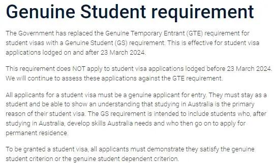 澳洲学签新政 GS要求 澳洲移民局已经在2024年3月23日开始将学生签证的真正临时入境者(GTE)要求替换为真实学生(GS)要求。 500学生签证申请人必须作为一名学生留在澳大利亚,并能够证明在澳大利亚学习是他们获得学生签证的主要原因。GS要求同意符合条件的毕业生毕业后获得澳洲永久居留权。 要获得学生签证,申请人必须证明他们符合真正的学生标准或真正的学生家属标准。 出海行将从以下4点介绍GS新要求: 1.GS标准 2.GS和GTE有什么不同? 3.语言成绩是否为必需材料? 4.陪读签证依然按照GTE要求审理。 01 GS标准 GS表格共有5个问题,用英文回答,每个问题不能超过150字: 1.提供申请人目前的情况,包括:与家庭、社区、就业和经济状况的联系; 2.解释申请人为什么希望在澳大利亚选择的这个机构学习选择的这个专业?此外,申请人必须解释他们对所选课程要求以及在澳大利亚学习和生活的理解; 3.解释所申请的课程对于申请人的价值 4.详细说明申请人希望补充的任何其他相关信息(证明自己是真实学生相关的信息) 5.(曾)持有学签外其他澳洲签证,现在想境内转学生签证,需要解释原因 注:除了字面回答移民局的问题,申请人还需要准备相对应的材料来证明和支持上面的答案,以证明自己是一个真实来澳洲学习的申请人。 02 GS和GTE有什么不同? 本次签证主要有下面变化: 申请材料从以往的300字文章式说明变更为直接针对具体问题进行点对点回答。这一调整更便于等证言审阅,有望加快等证处理速廉。 不再要求明确表明“非移民倾向”或“完成学业后回国贡献”。相反,申请者不被要求否定其对移民的倾向,移民局从多方面确认申请人是一名真正的学生,去澳大利亚主要目的为学习。 持中国护照的申请人,属于Level 1级别,并不强制要求英语成绩和存款证明。 新政下,澳洲境内其他签证持有人转申留学签的审查将更严格。 03 语言成绩是否为必需材料? 澳洲移民局提高了学生签证和485工作签的语言要求,可见对移民局对申请人语言水平的重视。综合实际申请情况来讲,提供了语言成绩的申请人下签率比没有语言成绩下签率高。所以还是有必要提供语言成绩的。具体内容如下: 学生签证500语言成绩: 1、学签英语成绩要求由原来的雅思最低5.5分提升至6分(或同等水平); 2、通过语言课程再入读主课的学生,雅思要求由原来的4.5分涨到5分; 3、通过预科(foundation)或衔接课程(pathway)入读主课的学生,雅思成绩要求达到5.5分; 4、如果只读语言课程(ELICOS),语言成绩要求保持不变 485毕业生临时工作签证语言成绩: 1、雅思或同等语言成绩要求由6分涨到6.5分,且单科不低于5.5分; 2、中国香港护照和BNO持有者申请条件不变,依旧为6分,单科不低于5分; 3、申请485毕业生临时工作签证的语言成绩有效期,由3年缩短为1年改革将从2024年3月23日起生效,也就是说23日后递交的所有新申请都需要按照新规审核。 04 陪读签证依然按照GTE要求审理 澳洲移民局主要通过以下3个方面来审核申请人的GTE: 申请人的情况(自己的国家以及未来在澳洲的情况) 申请人的签证/移民史 其他方面 陪读签证要求家长只能在澳洲陪伴孩子留学到其成年,移民局审核申请人GTE的主要目的是排除陪读签证的申请人未来有转其他签证或者滞留的风险。 澳洲留学签证如何申请?欢迎咨询出海行留学顾问~ 想知道自己是否满足澳洲留学要求,点击下方小程序免费评估~ 【干货】申请澳洲留学签证,如何应对电话调查? 【收藏】原来留学生身份有这么多好处! 澳洲中小学留学面试都会问哪些问题?如何回答? |