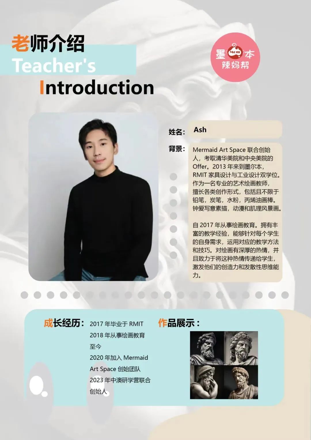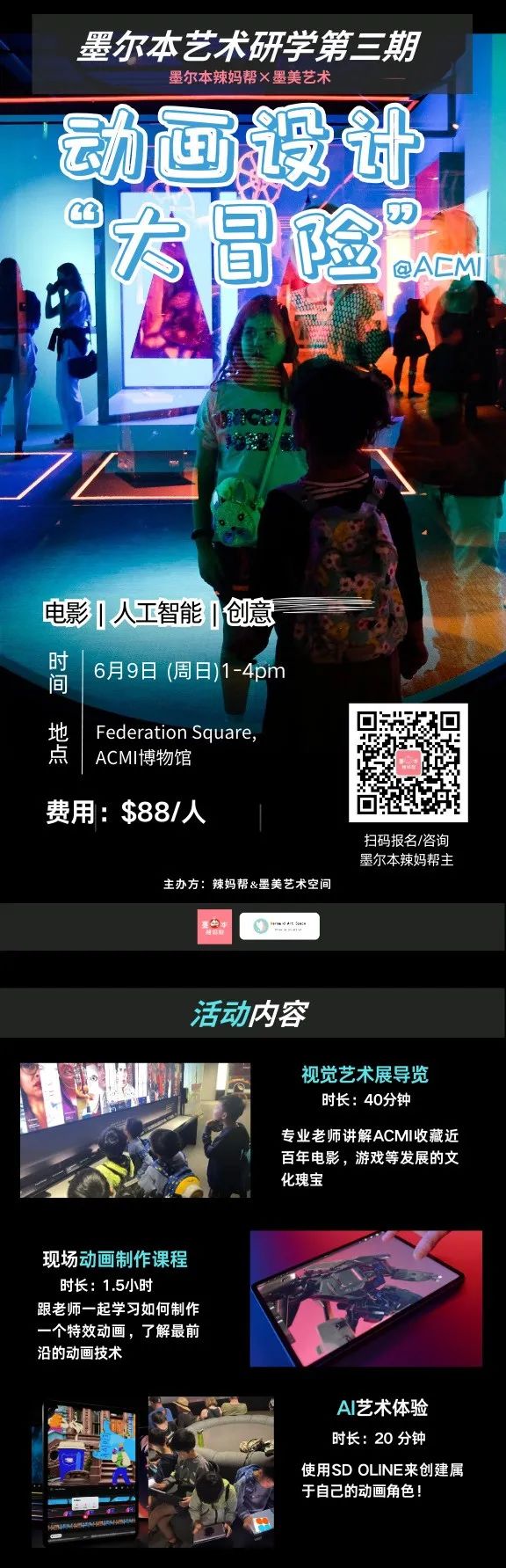 家长可以陪同一起参观,也可把孩子交给老师后自由活动,到点来接送孩子就行。 活动最多仅限20人! 先到先得,报满即止 私信任一帮主【动画创作】,即可咨询/报名 ![]() 帮主给大家组织的活动,在专业和体验上都有保证! 靠谱机构 | 专业师资 | 丰富经验 给你孩子最有意义的游学体验! 这次合作的“墨美艺术空间”是墨尔本专业的美术教学机构,之前就已经组织过多个艺术研学活动: 左右滑动查看 ![]() ![]() ![]() ![]() 本次NGV艺术研学团的带队老师 每一位都有过硬专业背景 中国美院、RMIT等名校设计专业毕业 拥有多年教学经验 左右滑动查看 ![]() ![]() ![]() 以往的活动,也都是好评满满 ![]() 3小时游学 本次活动只需$88/人,性价比超高! 最多仅限20人! 私信任一帮主,即可咨询/报名 ![]() (本文由客户提供,内容和信息仅限澳大利亚,不代表本公众号立场。) |