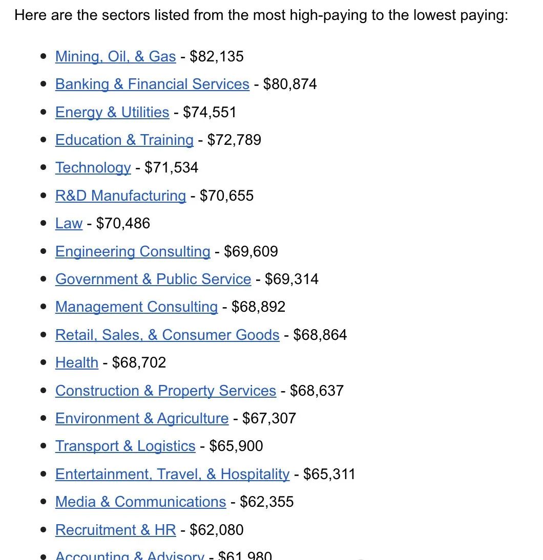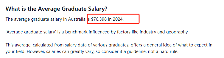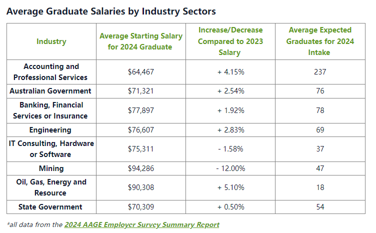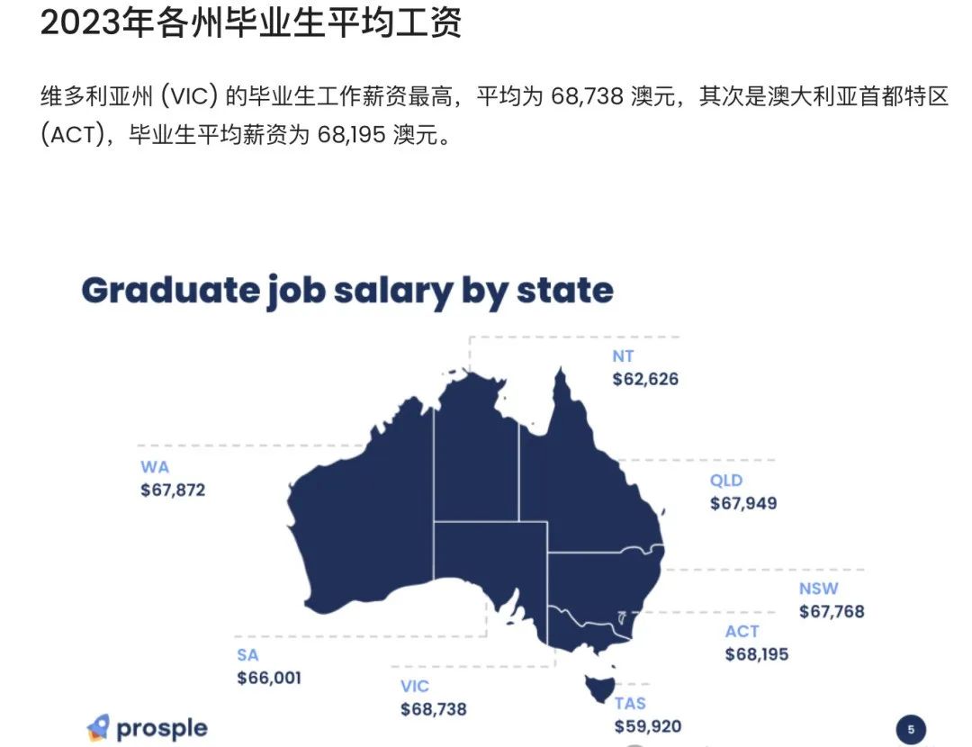 大家都知道澳洲是薪资水平全球最高的国家之一,从 2023 年 7 月 1 日起,全国最低工资目前为每小时 23.23 澳元,折合人民币约 109 元。那么,澳洲毕业生的年收入有多少呢? 今天小霖带大家从两大澳洲求职网站(Seek & Talent)的数据,客观全面的来了解一下澳洲毕业生薪资水平! ![]() Seek网站数据 澳洲最大的招聘网站SEEK在近日公布了2024年毕业生平均薪资水平。 根据SEEK官网统计,2024年澳大利亚平均毕业年薪为$76,398澳币,折合人民币约36万元。但是毕业薪资因行业、地点等因素也会有所差别。 数据来源:https://au.gradconnection.com/career-advice/article/what-salary-can-you-expect-as-a-graduate/ ![]() ![]() 不同行业毕业生平均薪资 SEEK也给出了澳大利亚热门的8大行业的毕业生平均水平,其中薪资最高的为采矿行业,高达$94,286澳币,折合人民币约44万元。各行业的薪资水平具体如下: ![]() ![]() 会计行业 2024年毕业生平均年薪为$64,467澳币,相较于2023年增长4.15% ![]() 澳大利亚政府行业 2024年毕业生平均年薪为$71,321澳币,相较于2023年增长2.54% ![]() 银行、金融和保险行业 2024年毕业生平均年薪为$77,897澳币,相较于2023年增长1.92% ![]() 工程行业 2024年毕业生平均年薪为$76,607澳币,相较于2023年增长2.83% ![]() IT咨询、硬件和软件行业 2024年毕业生平均年薪为$75,311澳币,相较于2023年减少1.58% ![]() 采矿行业 2024年毕业生平均年薪为$94,286澳币,相较于2023年减少12% ![]() 石油、天然气、能源行业 2024年毕业生平均年薪为$90,308澳币,相较于2023年增长5.1% ![]() 州政府行业 2024年毕业生平均年薪为$70,307澳币,相较于2023年增长0.5% ![]() 澳洲各州就业情况数据 澳洲就业与技能部门近日也统计了各州或地区的紧缺行业以及空缺人数,具体数据如下: ![]() 新州 健康护理与社工:654,500个 科学技术服务行业:453,700个 零售业:422,400个 建筑:414,400个 教育与培训:361,800个 ![]() 维州 健康护理与社工:586,500个 科学技术服务行业:383,700个 建筑:359,500个 零售业:353,500个 教育与培训:313,600个 ![]() 昆州 健康护理与社工:465,400个 建筑:280,400个 零售业:278,900个 教育与培训:246,900个 科学技术服务行业:228,800个 ![]() 西澳 健康护理与社工:219,600个 采矿业:153,400个 建筑:144,100个 零售业:134,800个 教育与培训:128,000个 ![]() 南澳 健康护理与社工:168,900个 零售业:93,400个 建筑:78,500个 教育与培训:72,800个 科学技术服务行业:72,000个 ![]() ACT 公共行政与安全:78,100个 科学技术服务行业:37,700个 健康护理与社工:31,500个 教育与培训:22,300个 零售业:17,800个 ![]() 塔州 健康护理与社工:48,000个 零售业:27,800个 教育与培训:25,700个 建筑:24,800个 公共行政与安全:22,200个 ![]() 北领地 健康护理与社工:22,900个 公共行政与安全:22,000个 教育与培训:13,100个 零售业:11,100个 住宿与食物服务:10,100个 ![]() Talent 网站数据 根据Talent.com的数据显示2024澳洲毕业生平均薪资为$74944/每年。合计人民币的话超过35万元/年了。 数据来源:https://au.talent.com/salary?job=graduate ![]() 据统计,澳大利亚毕业生的平均工资为每年$74,944 澳币或每小时38.43 澳币。入门级职位的起薪为每年$65,552 澳币,而大多数经验丰富的员工的年薪高达$95,357澳币。 ![]() 不同行业领域薪资情况: 一起来看一下按照薪资从高到低排列,排名位居前列的行业有哪些吧:(这里指的是行业领域,不是具体的职业哦!比如学IT的也可以在不同领域内工作) 01 矿业!达到了$8.2万的薪资! 02 银行和金融服务类 03 能源和公共事业 04 教师/教育 05 研发制造 06 法律 07 工程咨询 08 政府/公共服务 09 管理咨询 10 零售、销售、消费品行业。 11 健康类。比如护理职业,起薪$6.8万! 12 建筑业 13 环境和农业 14 运输与物流 15 传媒 16 招聘行业/HR 17 会计与咨询 ![]() ![]() 澳洲各州薪资情况: 根据数据显示,维州的毕业生薪资最高!达到$6.87万,其次是堪培拉,$6.81万!昆州、西澳、新州都差不多$6.7万+!南澳$6.6万!北领地和塔州比较少,分别为$6.2万和$5.99万! ![]() ![]() 在澳洲完成学历后,通过合法的工作签证即可留在澳洲进行求职和就业。 总的来说,澳洲的就业大环境和薪资水平都是很不错的,至于能不能被心仪的公司选上,还得看综合看毕业生的学历和个人能力,比如英语是否流畅,专业知识是否储备充分,职业认证等相关流程是否完成。 也有同学反馈,很多澳洲的企业更偏向于有PR身份的求职者,那么毕业之前就应该好好规划如何去进行职业匹配和跟PR有关的身份申请的准备,这也是一个很复杂和需要长期规划的事情。 ![]() 教育部官宣:将进一步扩大留学生回国扶持政策最新|2024QS世界大学学科排名正式发布! 直播预告|一文看懂如何从留学生升级为澳洲PR? 本周六晚,澳洲移民案例分享专场! 2024QS世界大学学科排名 - 澳洲名校世界百强学科 ![]() |