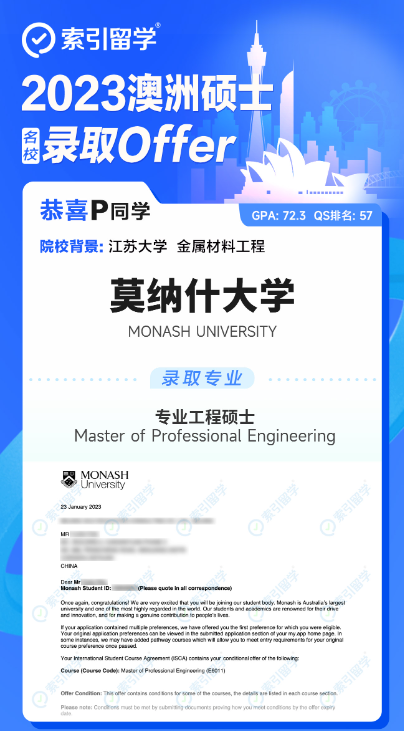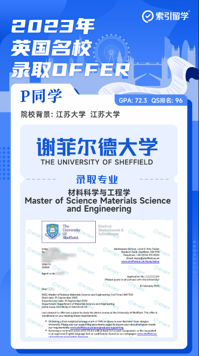 P同学: 本科:江苏大学(金属材料工程) 均分:72.3 硕士offer:谢菲尔德大学(英国)、莫纳什大学(英国)