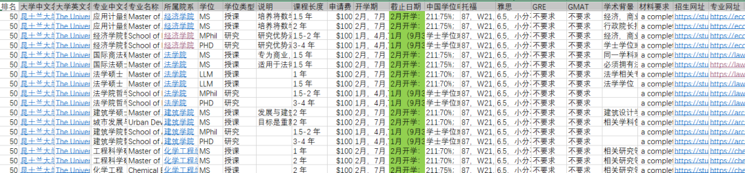 关注“留学资料库”,回复专业名称,如“金融”,可以自由查询相关资料介绍 本篇微信主要包括如下内容: 1、24F 澳洲八大金融专业54个MS+PHD项目查校表2、24F 澳洲八大会计专业49个MS+PHD项目查校表3、24F 澳洲八大商业分析专业14个MS+PHD项目查校表4、24F 澳洲八大金融数学专业5个MS+PHD项目查校表5、24F 澳洲八大精算学专业14个MS+PHD项目查校表6、24F 澳洲八大市场营销专业38个MS+PHD项目查校表7、24F 澳洲八大管理与商务专业42个MS+PHD项目查校表8、24F 澳洲八大创新与创业专业19个MS+PHD项目查校表9、24F 澳洲八大风险管理专业6个MS+PHD项目查校表10、24F 澳洲八大物流与供应链管理专业13个MS+PHD项目查校表11、24F 澳洲八大信息系统管理专业23个MS+PHD项目查校表12、24F 澳洲八大人力资源专业16个MS+PHD项目查校表13、24F 澳洲八大艺术管理与策展专业13个MS+PHD项目查校表14、24F 澳洲八大房地产专业12个MS+PHD项目查校表15、24F 3澳洲八大旅游与酒店管理专业5个MS+PHD项目查校表16、24F 澳洲八大国际商务专业25个MS+PHD项目查校表17、24F 澳洲八大工商管理硕士14个MBA项目查校表 特别说明: 1、澳研专业查校工作量巨大,如果其中有些问题和错误,欢迎指正,同时也请谅解。 2、资料以Excel电子文档的形式发送,发出后无法退换,请确定资料是自己需要的再获取。 3、澳研专业查校每年12月更新,更新后均需重新付费获取。 ![]() 最新!根据机构和学生个人申请人的反馈,留学资料库完成了24F 澳洲八大的查校工作,并特别整理出了澳洲八大热门专业的查校表,以下是澳洲八大的商科类专业的查校介绍:■ 这套资料查询了哪些澳洲大学? 根据机构和学生的反馈,本轮澳洲大学查校锁定了澳洲八大,也是2024年QS世界大学排名中澳洲大学排名最前面的八所大学:澳洲国立大学、墨尔本大学、悉尼大学、新南威尔士大学、昆士兰大学、莫纳什大学、西澳大学、阿德雷德大学。 ■ 查校时间:2023年11月-12月 ■ 这套资料怎么用 (划重点! )解决问题:快速直达相关各个研究生项目的介绍页面和申请要求页面,节省选校时间,快速选定目标院校!这套资料同时也包含澳洲大学相关专业所属院系的链接、项目介绍链接、申请要求页面链接 ■ 这套资料都有什么信息?解决问题:澳洲大学相关研究生项目的分类、开学期、英语成绩(雅思或托福)、GRE/GMAT的要求、申请文书材料需要哪些? 资料包介绍: 24F 澳洲八大商科类17个热门专业授课类+研究类硕博项目查校表格式如下: ![]() (本图片仅做资料格式的展示,非资料本身内容,点击图片可以放大预览) 资料说明:1、这套资料仅供初步选校用,选定目标院校后,一定要在官网做最后的核对。2、项目汇总列表中,每个项目包括两个重要连接:项目链接、项目申请说明链接。因为官网更新的原因,部分链接可能会失效,但是大学官网在失效页面都会找到本专业所在院系的链接,可以很快找到对应的项目的新链接。 3、列表中的大学排名来自2024QS世界大学综合排名4、关于查校文档内颜色标注的说明: 例:1月15日 :这类的绿色标注仅限于官网明确说明的截止日期中有2024年字样的,其他截止日期如果没有年份,不做标注,建议大家在选定目标专业后,一定要点击资料内的申请链接查看最新截止日期说明。 例:商业分析专业 :在专业名称上做黄色背景的专业,一般是是提醒特别注意的专业,有的是新设专业,有的专业可能是包含线上课程的混合模式授课,总之就是提醒多关注一下。 例:公共教育管理 :专业名标注红色,说明这个专业暂停招生,或者不招收国际学生。 5、特别提醒:由于官网更新的原因,利用这套资料进行初步选校后,最终的申请信息,请在官网做最终的核对,以官网的最新信息为准! ■ 澳洲八大专业查校感悟及申请建议: 1、申请人均分要求:澳洲大学的官网对国际申请人的成绩没有非常明确的均分要求,除了昆士兰大学、新南威尔士大学针对中国申请人有211和非211申请人的均分差别要求外,其余六所大学的官网并没有针对中国申请人本科院校背景的特殊要求。划重点:澳洲大学之所以在官网上对国际学生的均分没有明确的要求,主要原因在于,澳洲大学都比较依赖于代理机构的招生,也鼓励申请人寻求代理机构的帮助。事实上,澳洲大学招生有两种方式:直接申请和通过代理机构申请,直接申请的国际学生可以通过官网在线咨询或发送邮件询问自己的均分是否符合学校要求。通过代理机构(中介)申请,代理机构会评估申请人的资格,并协助申请人完成申请。2、申请人英语成绩要求:无论授课类项目和研究类项目,澳洲大学的要求不尽相同,有的大学一视同仁,有的大学会针对授课类项目和研究类项目设置了不同的英语要求。此外,澳洲大学可以接受的英语测试成绩比较多,这套资料里收录了中国申请人常见的雅思和托福考试成绩要求。3、GRE、GMAT成绩:澳洲八大大多数专业是不需要提交GRE和GMAT成绩的,除了个别商科类的专业会有相关的要求。4、申请材料:学历证明、成绩单、护照是所有大学需要提交的,此外Personal Statement、references、CV/Resume等在研究类项目大多会要求提交. 研究类项目除此之外,很多学校要求提交RP(Research Proposal),这是研究类项目申请最重要的申请材料。5、开学期和申请截止日期:针对国际学生,澳洲大学大多会设置两个开学期:2月、7月,申请一般是滚动录取,国际学生一般要
