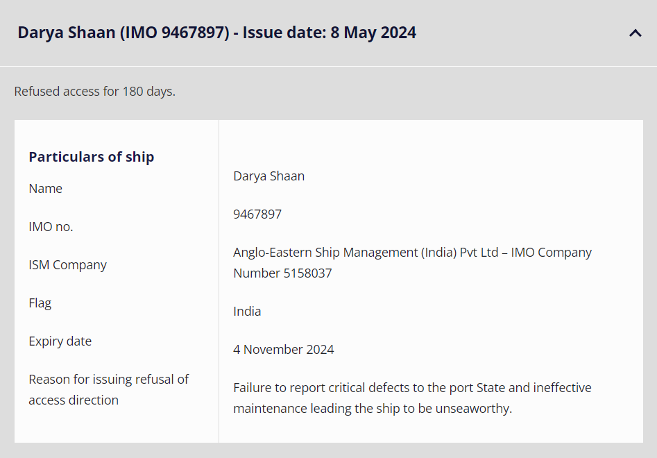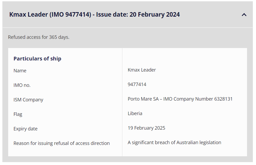 日期|5月 这艘船被AMSA开出半年‘罚单’! 澳大利亚海事安全局(AMSA) ![]() 近日,一艘由全球最大船管公司Anglo Eastern管理的散货船因其主机和机械存在"严重缺陷"而被禁止进入澳大利亚水域。 根据澳大利亚海事安全局(AMSA)官网的数据,5月8日,ASMA对载重27000吨的散货船“Darya Shaan”号(建于2009 年)开出了180天内拒绝访问的禁令。 ![]() ![]() Darya Shaan ”号是一艘水泥船,悬挂印度国旗,船东是Dry Bulk Services Ltd,由ANGLO-EASTERN进行运营管理。 ![]() AMSA称,“Darya Shaan ”号散货船因未报告缺陷而"一再危及船员安全"。 AMSA检查员于2024年4月26日在墨尔本港检查了这艘悬挂印度国旗的船舶,发现“船上存在多个维护问题”。 据说这些问题包括主机控制和监测系统、机房警报监测系统和两台发电机的启动安排的缺陷。检验后也未对船舶进行维护。 ![]() 美国海事安全局进一步指出,该船的安全管理系统存在疏漏,未能充分保障船只的维护工作,也未能适时报告存在的缺陷。澳大利亚海事安全局表示,该局了解到运营方Anglo-Eastern Ship Management(印度)公司在抵达澳大利亚前就被告知存在"严重的安全隐患"。 AMSA运营执行董事迈克尔·德雷克(Michael Drake)表示:“当船舶运营商忽视发动机的维护时,后果将会不堪设想。” “这些缺陷可能导致船舶在狭窄航道等关键的航行过程中失去动力,造成搁浅,或与其他船舶或建筑物相撞。” "运营商明知这些缺陷,却不向AMSA 报告。这种行为令人震惊,他们理应受到180天的禁止挂靠处罚"。 ![]() 德雷克称,运营商此举就是向澳大利亚当局隐瞒严重缺陷的"明显企图",表明该船是"无视船舶、船员和海洋环境的安全"。 海事监管机构称,近年来主机缺陷有所增加,该机构一直在对不合格的船舶采取行动,以确保船舶运营商"知道自己的责任"。 德雷克表示:“如果Anglo Eastern履行义务并报告缺陷,AMSA就不会根据港口国的控制程序扣留该船。” “我们会以建设性和务实的态度与运营商合作,确保船舶安全并符合公约要求。” 澳大利亚对其认为不符合标准的船舶一直采取强硬立场。自2020年7月以来,已有22艘船舶被发布禁令,禁航时间从三个月到三年不等。 第一张全年禁令 从澳大利亚海事安全局(AMSA)的官网可以看出,这是AMSA发出的第二张罚单。第一张罚单在2月开出,禁令时长长达一年。 ![]() 被罚的船舶是91800-dwt的散货船“KMAX Leader”轮,由菲律宾的Cyprus Sea Line运营。 据该公司,导致澳大利亚对“KMAX Leader”轮实施禁令的关键因素在于渔网问题。由于渔网缠绕螺旋桨和尾轴,引发了机械故障。同时,该公司还将与当局沟通的问题归咎于时差差异。 ![]() 2023年10月26日,“KMAX Leader”轮在驶近澳大利亚Gladstone港时,首次报告称机舱内出现不明振动,疑似机械故障。接到报告后,该船的澳洲代理迅速作出响应,并于10月28日启动维修工作,初步估计需费时8至10天。然而,根据AMSA的后续报告,维修工作并未在预期时间内完成。 对此,Cyprus Sea Lines公司解释称,该轮机械故障的原因是在接近澳大利亚海域时,螺旋桨和尾轴不幸被渔网缠绕。这一意外情况对螺旋桨轴的尾部密封造成了影响。为保障航行安全,船东在发现此情况后报告了事故,并选择在澳洲港口停靠,以便进行详细的检查与维修工作。 德雷克表示,他对散货船“KMAX Leader”轮所有者缺乏合作意识感到十分失望。 他补充道:“AMSA希望所有船舶运营商和船长能够迅速、透明和有意义地参与到船舶维护工作中。” “国际标准的存在是为了更好地保护海员的生命与安全,以及我们宝贵的海洋资源和沿海环境状况。它们不是‘可逆的’。” 来源:海事服务网 联系我们 谢先生 13916166925 李女士 18500030210 PC端地址 https://www.myvessel.cn/ 微信小程序 关注“船视宝Express”获取更多 ![]() ![]() |