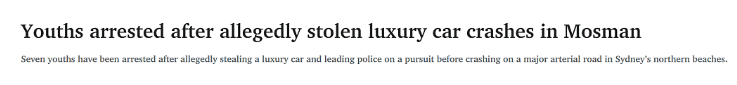 《每日电讯报》5月10日报道,七名青年涉嫌偷窃一辆豪华轿车并在警方的追捕下逃逸,随后在悉尼北部海滩的一条主干道上发生车祸,最终被警方逮捕。 ![]() 在Spit Bridge附近发生车祸后,六名女孩和一名男孩被送往Manly和Chatswood警察局,他们的年龄不详,但据信都是未成年人。 据报道,警方在大约凌晨4点40分接到报警,称有人闯入位于Curl Curl区Lalchere St的一户民宅,并被告知一辆保时捷SUV被盗。 ![]() (图片来源:《每日电讯报》) 不久后,警方发现该车在Balgowlah附近行驶。该车没有停车接受警方检查,于是警方展开追捕行动。 追捕行动持续了10分钟,途经Balgowlah Heights和Seaforth,最后因该辆SUV在Mosman的Spit Rd上撞上混凝土护栏而结束。 ![]() ![]() (图片来源:《每日电讯报》) 据了解,无人在这起事故中受伤。 警方正在对这七名青年进行讯问。 周五上午,该大桥上前往市区的交通十分缓慢,两条南行车道被关闭。 早上7点前,这些车道重新开放,交通恢复正常。 针对这起事件的调查仍在进行中。 🐝小蜜蜂互助,昆士兰最大的免费生活服务平台 🇦🇺一站式解决你在布里斯班所有烦恼 闲置二手转卖,美食好物推荐 租房清洁求职,买车维护勘验 一手新闻资讯,本地热门八卦 全年无休,随时响应 扫码即可拥有,畅享所有服务! ![]() |