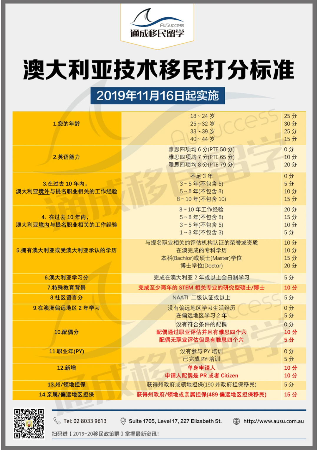 国内申请人 案例详解 真实案例1: 职位:Conference and event organiser 149311 VETASSESS刘同学本科毕业于普通院校的电子商务专业,毕业后就职于国内一家中型私企,主要的工作内容是类似于总经理助理和秘书,工作职责较杂。经过我们分析刘同学的本科专业和工作履历之后,我们向刘同学介绍了Conference and event organiser 149311会议和活动组织者这个澳洲短期紧缺移民职位。虽然这个职业走不了189独立技术移民,但是至少燃起了190/491移民的希望!这个职位对于学历的相关性要求较低,主要评估难点在于工作职责要高度相关。因此,像是刘同学的情况,虽然学历不是非常相关,但是工作职责繁多杂乱,能粘上边的,就有机会可以做下来!但是,一定需要在递交前仔细审视VETASSESS的要求,稍加‘’美化包装‘’‘精心修改’,才不容易在审理阶段被拒或是补充材料说明。在成功拿到了职业评估后,刘同学在2023年的9月15日以非常低的80分matrix分数捡漏获得了堪培拉州政府发放的190移民邀请,并最终成功移民澳洲! 真实案例2: 职位:University lecturer 242111 VETASSESS张老师年龄已经40+了,本硕毕业后继续读的博士,博士毕业后就在校任职大学老师。虽然,主要的教学方向是政治和马克思理论,看似澳洲完全不需要,但是这并不影响其申请澳洲中长期紧缺移民职位中的 University lecturer 大学讲师这一职位。这个职位并不审核主要的教学或研究方向,只是相比其他VETASSESS职位需额外提供一个过去五年内发表的学术成果文章清单。但是大家需要分清,如果仅仅是助教或者辅导员则是不符合这个职位的要求的。另外,由于国内的学历需要办理中国学历认证,往往需要三个月多的时间,因此一定要提早办理。189/190的签证申请的年龄限制为45岁,以及稍纵即逝的年龄加分,都对这类年龄往往偏大的职位不太友好,更加需要争分夺秒,提早规划办理。 真实案例3: 职位:Management consultant 管理顾问 224711梁同学在国内的四大会计事务所之一的安永从事了两年有关企业管理顾问岗位的工作,合作的客户涉及诸多国内大厂,为其提供企业发展&管理方面的咨询建议。VETASSESS对该职位的要求是本科以上高度相关的学历以及一年以上高度相关工作经验。这对于本科和硕士都是商科方向的L同学来说,完全符合要求。此案件的难点在于,虽然L同学的经历符合要求,但是VETASSESS对该职位的审核材料要求非常繁琐严格,稍有不慎就非常容易被质疑补材料或是直接被拒。但是在我们的协助下,L同学顺利拿到了该职位的职业评估,并且以90分的高分获得了澳洲189的移民邀请! 真实案例4: 职位:Graphic designer 平面设计师 232411黄同学本科设计专业毕业后,在读研的同时,任职于一家普通的小型公司从事平面设计师的工作。该公司出于市场营销宣传的目的,经常需要制作海报,设计宣传册等,但由于工作量不大,因此只是每周三天的兼职。但是尽管如此,在我们精心的材料整理‘包装’之下,H同学也顺利的拿到了VETASSESS的平面设计师职业评估!平面设计师职评的要求也是本科以上相关学历+一年相关工作。但此案件的难点在于,VETASSESS对于平面设计师就职的工作场合要求非常严格,一般只认可政府机构、专门的广告设计公司或是大型的企业,对于小型公司的认可程度非常不友好。因此,在递交职业评估的时候切不可轻易准备,一定要联系我们评估方案后对症修缮材料后方可递交!另外,平面设计师并不属于澳洲中长期紧缺职位,只可以申请州担保技术移民,因此我们也是为其定制了专属方案,同时多个州申请,最终顺利拿下新州的190邀请! 澳洲移民分数计算 ![]() 移民流程是怎么样的? 对于大部分国内学历和国内工作的申请人,其实有非常多的职位,都是需要通过VETASSESS这家评估机构来做职业评估,拿到移民澳洲的入场券,进入EOI池子等待移民局发放邀请。当然,也有职位是需要在其他职业评估机构来做认证的,我们以VETASSESS相关职位为例来阐述移民流程: 第一步:国内的学历先做VETASSESS学历认证第二步:VETASSESS职业评估第三步:递交EOI第四步:获得邀请第五步:递交正式移民签证申请第六步:下签:拿到永居绿卡,获得澳洲的永久居住权(之后也可以选择换成澳洲护照) VETASSESS学历认证怎么做? 基本材料:第一部分:个人信息