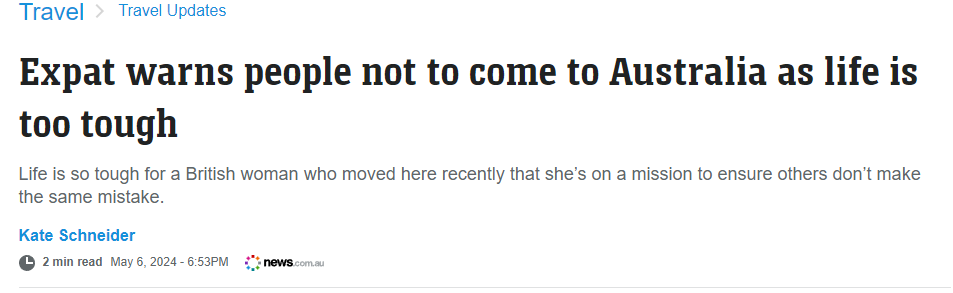 ![]() //前言// 都说澳洲是移民的天堂, 很多人在澳洲开启了新生活, 但是, 有的新移民却表示, 澳洲太让自己失望, 千万别来这! #01: 新移民吐槽 后悔来澳洲 作为一个移民大国,澳洲让全世界范围内很多人趋之若鹜,都想要拿到澳洲的合法身份。 但是,有移民在进入澳洲以后却直呼后悔,并且喊话其他人: 千万别来澳洲! ![]() 图片来来源:news Hannah现在居住在珀斯,3个月前她从英国移民而来,来之前对澳洲充满期待,来了以后只用3个月就对澳洲全是失望。 让她最失望的一点就是澳洲的工作非常难找,本来听说澳洲遍地都是工作机会,来了以后才发现根本不是这样,几个月时间里,她根本找不到合适的工作。 眼看着自己的存款越来越少,她的压力倍增,无数次后悔自己来到澳洲生活。 ![]() 图片来源:news 她将自己的想法发在了网上,目前浏览量已经有数十万。 她很真诚的表示,澳洲让人期待过高了,社交媒体上的视频里,新移民过着令人羡慕的生活,早上可以在沙滩上跑步,然后享用巴西果莓碗,欣赏日出,之后可以在优美的环境里面肆意游玩。 但这只是网络,这是生活并非如此。 她表示,自己从来没有为了找工作付出过这么大努力,哪怕是在工作竞争压力更大的英国他也没有如此无力。 ![]() 图片来源:news 对于她而言,澳洲更适合旅行而不是生活,这里景观顶级环境优美,但是找不到工作这一点却让人望而却步。 在没有一份适合的工作之前,她完全无法放松下来,可偏偏工作不好找。 #02: 网友神评论 有人支持有人反对 她的帖子引起了很多人关注,不少人在帖子下方留言,评论区内支持和否定的声音都有。 正 找工作容易 有人表示,在澳洲找工作根本不困难。 一位移民表示:自己到了墨尔本,只花了3个星期就找到了还算一份满意的工作,想要达到这个目标,多尝试是必然的。 还有网友表示:找工作真的太容易了,满大街都是工作机会,这取决于你想要从事什么行业,如果短时间内找不到满意的工作完全可以尝试先找一份兼职,至少有部分稳定收入。 ![]() 图片来源:news 还有人表示,吐槽澳洲工作难找的人,可能根本没有用心准备简历,现在澳洲依然有大把工作机会。 反 找工作困难 但是也有人反对,一位移民留言:“这就是我从澳洲搬回爱尔兰的原因,与那里相比,我会毫不犹豫地搬回英国/爱尔兰。” 有网友表示赞同:“我百分之百同意你的看法!我在这里已经11个月了,我还是讨厌这里,哈哈哈哈!我们只是从新西兰过了一片海过来的,可以说新西兰要好得多!” 最后 现在的澳洲,确实不缺工作机会,可问题是并不是每一份工作都适合自己。 想要找到自己喜欢又擅长的工作,可能真的需要运气和机会。 而且刚来澳洲的几个月,受到文化冲击感到不适应也非常正常,习惯了澳洲的生活或许就会爱上这里了。 Reference https://www.news.com.au/travel/travel-updates/expat-warns-people-not-to-come-to-australia-as-life-is-too-tough/news-story/6200e7d157708219db596614b37328c2 “澳微”视频号上线了! 半分钟纵览奇闻异事、新闻资讯、美食美景, 还有各种你不知道的澳洲冷知识。 移民 要闻 ☆澳配偶移民签证或新增英语要求!审理时间更长,花费更多! ☆史上最全!澳投资移民最新变革细节出炉:配额大增,审理时间缩短! ☆新州491大赦!无需本地工作即可获邀,会计等职业起死回生 ☆疫情之下这个签证开绿灯!独占一半配额,海外也下签,入境不受限 更多好文 点击图片即可查看 ![]() ![]() ![]() ![]() ![]() ![]() ![]() |