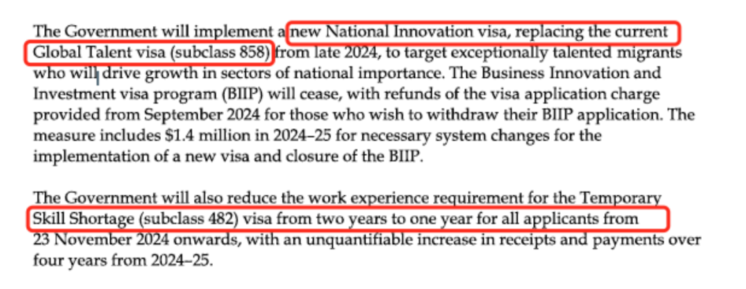 该类签证属于临时居留签证类别,也被称为“482工作签证”。 签证有效期通常为1-4年,具体取决于职位和雇主提名情况,旨在以一种灵活的方式填补了短期技术工人短缺,满足本地劳动力市场需求。 2023年年底,澳洲出台了482签证的新政要求,对比以往需要区分长短期的职业列表、需要为雇主工作满3年才能申请永居; 新政下的482的签证优势在于:职业列表不区分长短期,没有地域限制;且工作时长由3年减少至2年(预计缩短至1年);最重要的是还没有配额限制。 申请人仅需专注当下,留意中意的城市,重心放在找到合适的工作上,或者找我们对接到合适的雇主担保,即可申请转为永居。 申请要求: ·年龄:最好不大于43岁(适合年龄偏大工作经验丰富的人群) ·EOI打分:不需要 ·短期签证:雅思总分5分,单科4.5分 ·中长期签证:雅思总分4个5,单科5分 ·2年相关工作经验(以前是3年,2024年11月23日起预计减少至1年) ·从事的职业需在相应职业清单中