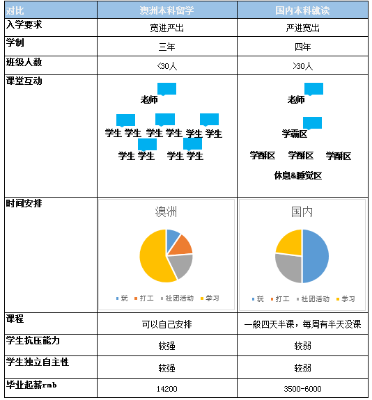 ![]() ![]() ![]() 现在这一批准留学生纷纷启程远赴海外 下一批的同学们是不是正在努力地备考雅思? 或者还在犹豫要不要出国? 就拿澳洲来说,那么留学澳洲值不值呢? 去澳洲留学和国内就读有什么区别? 这也是所有想要去澳洲留学的同学们非常关心的问题,今天我们就来说一说~ 澳洲留学VS国内就读 哥为同学们列举了一些澳洲留学和国内就读的不同点: ![]() 当然,澳洲留学和国内就读的区别不仅仅在于以上几点,但是这也是我们比较直观可以感受到的,下面咱们就一起仔细分析下。 宽进严出VS严进宽出 ![]() 我们从小就会听到身边人说:考上大学就好了!考上大学就解放了!国内大学是需要同学们闯过要命的高考关的,大部分同学进入大学后瞬间就会感到”无所事事“,再也没有繁重的作业和学业压力。 澳洲大学恰恰相反,如果同学们了解过多个国家的留学要求的话,你们会发现澳洲的留学政策算是非常的宽了,不仅是学术成绩上包括在语言上,语言不够可以配语言课,无需考GMAT和GRE就可以入读澳洲世界名校,那么是否意味着澳洲的大学非常容易读呢?答案是否定的。 澳洲大学采取的是宽进严出,也许入学并不难,但是想要毕业,混日子绝对不行! 学费和学制 ![]() 澳洲的大学本科是三年,无疑澳洲留学的学费费用会比国内多出不少,如果说是家庭条件实在不允许,那么建议同学们在国内选择一所不错的大学,通过四年的努力你同样会取得不错的成绩。 如果家庭条件可以承担得起这部分费用,那么相信我,选择留学绝对会比在国内就读收获的更多一些,在思维上,在独立性上,在语言能力等方面你都会和在国内就读大有不同。 澳洲的班级一般不会超过30人,课程是自由安排的,你可以一周只上两天课,你也可以一周上四天课,只要保证课时你可以自己安排。同时,在教学方面,澳洲的很多专业都会请到对应行业的大咖或专家来为同学们定期讲课,教师和学生处于平等的地位,你可以直呼老师的名字,有什么问题也可以随时和教师沟通。 学习时间 ![]() 虽然说澳洲的课程安排的非常自由,但是,你需要学习的时间却非常多! 不知道已经上过大学的同学们是怎么过的,至少我的大学时光大部分时间都在玩,玩,玩。好不容易从高中毕业了,没有人在背后逼着我们学习了,所以完全玩疯了,现在回头看,也是悔得一把鼻涕一把泪啊! 而澳洲的大学,如果你想要像在国内那样混日子,那么等待你的便是挂科,签证被取消,遣返! No zuo No die!一不注意签证分分钟取消!4件小事会让你告别签证 毕业起薪 ![]() 之前我们介绍过,随着新财年的来临,澳洲的最低起薪已经增长到了17.7澳元每小时,简单换算下,每个月在澳洲的最低月薪可以达到14,200人民币左右,而国内的毕业生起薪一般在每月3500到6000人民币之间。 至于“去澳洲留学到底值不值?”这个问题,人生每一次尝试都是值得的,如果你选择了远方,那么便只顾风雨兼程吧!点击下方“阅读原文”,留学澳洲,助力起行! 世界那么大,你想出去看看? 哥助你启程! 快戳原文参加抢OFFER活动 迈出留学英澳第一步! (是的,现在想留学英国的小伙伴也可以去抢offer啦~) ![]() |