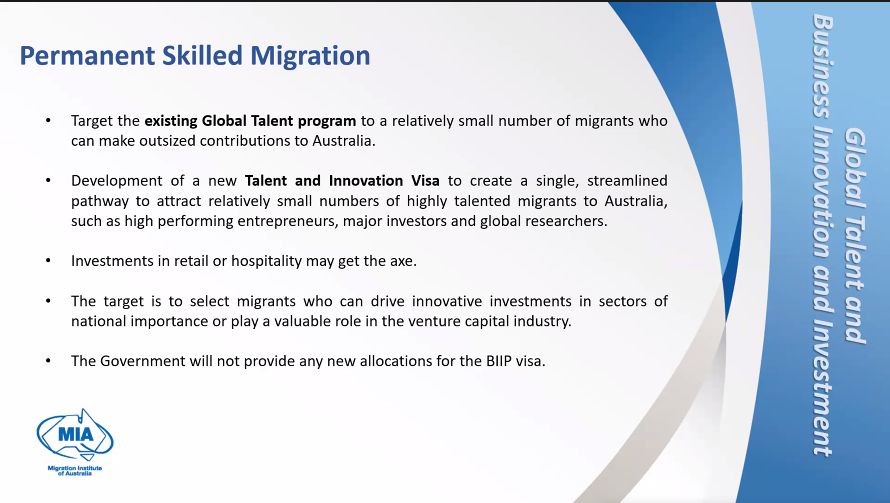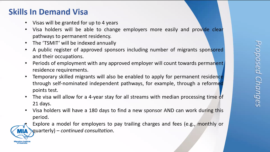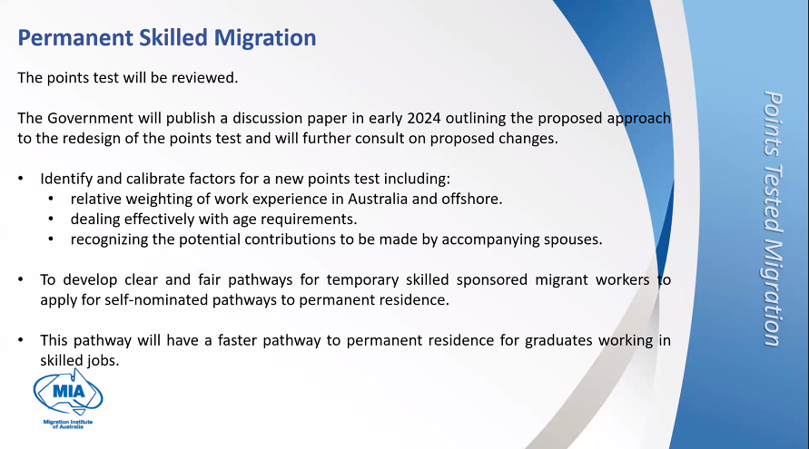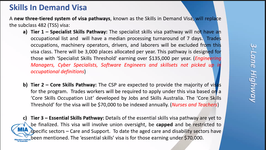 ![]() 研讨会形式也是展示了MIA提炼出的重点PPT内容,内容比较多,JCG嘉诚今天将相关信息做了总结,就重要信息给大家分享一下。 ![]() 会议开始MIA回顾了此前移民局提出的8个措施,需要回顾的可以看: 重磅!澳洲新移民战略公布8项措施!学签,485签证英文要求将提高!技术移民新打分系统提上日程! 工作签证 ![]() 一种新的三层次签证途径系统,被称为需求技能签证,将取代482类(TSS)签证: a) 第一层 - 专业技能途径: 专业技能签证途径将不设职业列表,处理时间中位数为7天。此签证类别将排除工艺、机械操作员、司机等。每年将分配3,000个名额。 此途径设计用于那些年收入超过135,000澳币的人,他们具有“专业技能门槛”(工程经理、网络专家、软件工程师以及职业定义中未涵盖的技能集)。 b) 第二层 - 核心技能途径: 核心技能途径预计将提供该计划大部分签证。工人将需要根据由澳大利亚就业和技能局制定的“核心技能职业列表”申请此签证。签证的“核心技能门槛”将为每年调整的70,000澳币。(护士和教师) c) 第三层 - 基本技能途径: 基本技能签证途径的详细信息尚未最终确定。此签证将涉及工会监督,设有上限,并仅限于特定行业 - 护理等。到目前为止,提到了老年护理和残疾行业。"基本技能" 签证适用于那些年收入低于70,000澳币的人。 ![]() ![]() 永居签证 ![]() 永久技术移民包括四个部分: 1. 分数测试的技能移民: