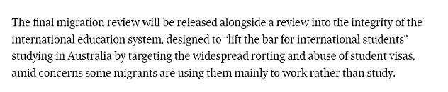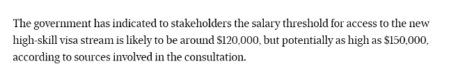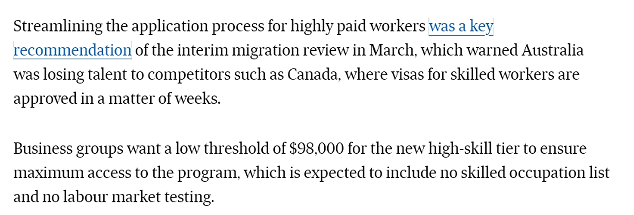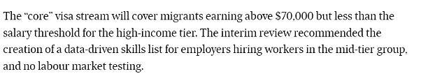![]() ![]() //前言// 澳媒刚刚曝出重磅消息, 内政部长透露最新移民细节, 政府要发210万个PR, 技术移民最受益, 大批临时移民有望成永居! #01: 210万PR要发放 更多改革内容流出 日前,澳洲内政部长Clare O'Neil对澳洲的移民系统进行了修改,进一步放宽了移民,而这个修改还没有结束,澳洲内政部仍在针对移民系统进行调整。 就在近日,更多针对移民系统改革的内容流出,其中最吸引人的就是澳洲政府计划为210万临时签证持有者发放PR。 ![]() ▲图片来源:The Australian 澳媒在报道这些改革详细消息的时候给出了一个分析:最新的移民改革将进一步利好技术移民,同时也会引发雇主之间的人才争夺战。 根本原因是澳洲政府正在改革流动性规定,简单来说,雇主担保中的雇主和工人可能不再是挂钩的,而是可以分割。 ![]() ▲图片来源:The Australian 看一下最新透露出的移民系统的改革内容: 1.增加新的短期签证选项; 2.临时签证持有者拥有提出向雇主进行拖欠工资或损害个人利益索赔调查的权利; 3.可以加入到工会的介绍会议中,了解更多行业内幕; 4.签证将不再与雇主绑定,并将提供更长的签证有效期,签证申请要求也即将简化。 第四条也是大家最关注的一条,被担保的工人未来可能只需要在新的技能评估时提交新的签证申请,确保自己从事的是移民职业清单上的工作且收入达到要求门槛,就可以转移到任何行业的任何经批准的担保人那里。 5. 流动性变化考虑将雇主担保改为按月收费。根据目前的安排,雇主担保人需要预先支付一系列费用,包括担保费、提名费和培训费。 ![]() 图片来源:网络 #02: 更换工作更容易 引发雇主人才争夺战 如果透露出的这些移民系统改革能够执行,对于技术移民而言将会是又一大利好,特别是对于雇主担保签证申请者来说更是如此。 以目前雇主和被担保人必须挂钩的情况分析,部分被担保人会为了稳定获取身份,遭受雇主的剥削又无法更换工作,但是如果两者可以分割,被担保人将会有更多的工作选择。 而且在更换雇主的期间,也拥有正常工作的权利,可以给无数人减轻压力。 ![]() 图片来源:网络 虽然对于被担保人来说这些改变有很大利好,也给大家提供了更多保障,但是对于雇主来说,他们可能会为争夺人才付出更大代价。 首先,在最新的技术移民门槛之中,澳洲政府提高了薪资限制,将最低工资从53900澳元提高到了70000澳元,目前能够豁免这个薪资待遇的只有澳洲最急缺的养老护理人才。 因此雇主想要担保员工,需要支付更高的薪资,与此同时,雇主认为当被担保的员工可以自由跳槽后,为员工支付的担保金应该如何计算? 同时,一些专家也认为,这个政策之下,会有大批在偏远地区申请雇主担保的签证持有者第一时间转投大城市,因为大城市有更多的工作机会和更高的薪资待遇。 所以,这个政策不仅会给雇主带来冲击,也会给偏远地区造成影响。 ![]() 图片来源:the guardian #03: 雇主担保未来整体框架, $12万年薪或成分水岭 除此之外,澳媒Financial Review还发布了未来澳洲各类签证的变化和趋势。其中包括雇主担保的框架,学生签证继续收紧,签证的审批时间将得到更明确的指标。 根据这篇报道中的内容,未来雇主担保的框架将调整为: 1. High-skill Tier高收入高技能群体: 最低年薪或定在12万澳元(最低不会低于9.8万),这类群体有望可以豁免LMT劳动力市场测试以及职业清单的限制。并且享有优先审理的福利。 ![]() ![]() 2. Mid Tier中层群体:最低年薪高于7万低于高收入群体,这类群体建议修改目前的职业清单,提倡采用a data-driven skills list,猜测可能是按照以往的数据统计担保哪类职业的比较多,同样豁免LMT劳动力市场测试。 ![]() 3. Low-tier低于年薪7万的群体,目前来看只能走labour agreement劳工协议类的雇主担保,能拿到LA的公司大多数都是具有一定规模才能满足移民局要求,要找到这类雇主对于学生还是有非常高的难度。 基于以上框架,像厨师,餐厅经理,理发师等等这样的岗位可能很难满足要求,因为工资达不到7万,又没有相关的Labour Agreement劳工协议,所以可能还会进一步讨论新的政策规定。 从上个财年起澳洲移民局改革考虑的重点都是不希望签证系统被滥用或利用。 就像学生签被滥用,挂名学校作为延长工作权利的途径,这次又再次被提及,明确指出要提高学生签证的难度,阻拦以工作为目的的学生签证。 ![]() 针对这次新指出的High-skill tier,重点可能在in-demand skills,也就是紧缺的职业技能。那么针对行业、岗位需求性、申请人资质等这些问题,可能都要在雇主提名申请这里进行自证,或者给予一个框架作为参考。对于高收入人群-降低监管要求的同时,加速审理时间。按照目前公布的各个消息来看,未来高收入‘’高税收‘’人群将会更容易通过雇主担保的形式移民。 针对以下的5大问题,在下周一将会有更多的细节出台,敬请期待: 1. Delivering sustained and inclusive full employment; 实现稳定持续的就业 2. Promoting job security and strong, sustainable wage growth; 促进职位稳定和可持续的工资增长 3. Reigniting productivity growth; 重启生产率的增长 4. Filling skills needs and building our future workforce; 满足技能需求符合未来劳工市场 5. Overcoming barriers to employment and broadening opportunity. 克服就业困难,拓展职场机会 最后 目前,这也只是透露出的移民系统改革相关内容,并不是官宣确认的消息。 澳洲的确在