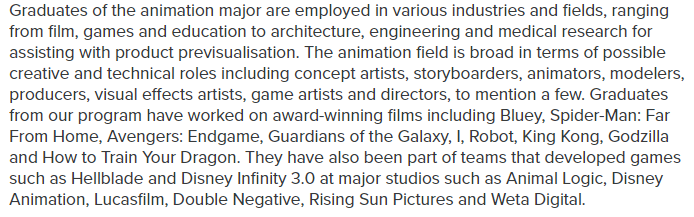![]() 对动画专业感兴趣的同学应该知道,澳洲动画其实也蛮出圈的。 ![]() 24QS艺术与设计专排 其凭借精妙的教育模式,将前沿技术、创新思维和国际化视野进行深度融合,塑造了一片孕育未来动画艺术大师与先锋技术的沃土。 与英国注重对学生个人的艺术培养不同,与美国注重对学生商业化的培养也不同。澳洲的培养方式重在让学生全面发展,既要根据时代进步掌握一定的动画新技术,也要将理论与实践相结合。 因此,澳洲的动画专业无论是从世界排名的角度看,还是从未来就业需求度的角度看,都为大家提供了一个很好的留学选项。 详细情况,请大家下滑解锁。 ![]() |本期分享导师| ![]() Barry -工作经历-美国广告公司 MAKE 三维通才萨凡纳艺术与设计学院 教研助理南京新蜂数字科技有限公司 三维模型师 丰富的软件应用经验,包括但不限于Nuke、MAYA、ZBrush、UE4、3D Max、Arnold Render、Marmoset Toolbag4、Ps、Ae、Pr等 #1 澳洲动画的专排高,其实有据可依 24QS艺术与设计榜单中,皇家墨尔本理工大学(RMIT)排在第18,悉尼科技大学(UTS)排在第46, 还有几所动画强势院校的排名也都非常不错。 究其原因,大家能发现澳洲动画的课程设置一直走在世界前沿。咱们将其简单概括后,从两个方面说明: ![]() 一是,课程设置将艺术创意与技术表现进行了深度融合。 比如RMIT的动画、游戏和互动硕士,虽然侧重工作室的学习方式,但通过角色、地点和模拟;动画叙事;设计与数字媒体的研究方法等课,致力于培养学生的先进数字技术、艺术感知与叙事技巧,引领学生挖掘个性化艺术语言。 ![]() 图源:RMIT官网 并且该项目中还有一门名为“生命幻觉”的课程,其实就是让学生通过研究线性动画、交互媒体和游戏领域的新兴批判性话语后,再来研究动画实践的历史和理论背景。最终实现创造既富视觉震撼又蕴含深远意义的动画作品。 二是,课程设置重视尖端技术的内生整合与应用。 比如UTS与昆士兰科技大学的动画课程,不仅精讲Maya、Unity及Houdini等业界标准软件的应用,更前瞻地探索实时渲染、AI辅助动画生产等新兴科技的实践边界。通过实战导向的教学策略,在模拟真实行业场景下,促进理论向解决复杂动画难题能力的高效转化。 ![]() 图源:昆士兰科技大学官网 这些高校深谙技术革新在动画行业的重要性,不仅将其视为教学的附加项,而是嵌入课程架构的核心。 为此,这样的综合教育框架,必能雕琢出技术娴熟且创意无限的全能型人才。 #2 澳洲院校早就为动画生就业,做好了铺垫 澳洲动画教育的一大亮点,在于其紧密的行业联系与丰富的实践机会。 比如昆士兰科技大学与迪士尼、皮克斯等动画巨擘都有合作,不仅为学生开辟了参与实战项目、与业界精英直接对话的独特通道,还依托定期工作坊、专题讲座及职业发展服务,搭建起从学术到职场的无缝过渡桥梁,显著提升了学生的就业市场适应力。 ![]() ![]() 图源:昆士兰科技大学官网 再比如RMIT与ACMI和Film Victoria等知名组织开展校企合作;UTS与悉尼当地的动画工作室建立长期合作关系,还有合作公司Flying Bark Productions、Mighty Nice、Cheeky Little Media、Dave Enterprises 和 Animal Logic 等等。 总之在澳洲各校的动画生,只要你想,都能一手掌握多项实践机会。 ![]() 汉艺学员Phyllis同学 获 RMIT 传播设计MDes、Pratt 传播设计 MFA offer 除此之外,澳洲动画的就业优势还在于学校为大家提供的优质展示平台和多元学习渠道。 像是RMIT动画节、悉尼动画节、墨尔本国际动画节等这些高端展示平台,都是澳洲在读学生有机会接触到的。 学校提供的这些窗口,鼓励学生将个人动画短片推向公众,不仅锻炼了学生的项目管理和市场推广技能,也为其作品赢得了国际舞台的认可。在此过程中,大家将切实体验和掌握从创意构思到成品发布的每一步,为成为独立动画制作者铺设道路。 ![]() 而多元的学习渠道则是,还有像格里菲斯大学的动画课程一类,他们通过与国际学生交流活动、跨国项目合作及邀请国际动画界名师进行讲座等,促进学生对多元文化动画风格的理解与尊重,推动大家跨文化协作与国际视野的拓宽,为大家在全球动画市场中独树一帜奠定基石。 #3 感兴趣的同学可以选择: 综上,可以看出澳洲的动画专业不仅质优,院校可选择性也大。我们为大家总结出几所非常值得选择的院校,分别是: ![]() 图源:皇家墨尔本理工大学官网 🏫 皇家墨尔本理工大学 RMIT是澳洲历史最悠久的高等学府之一,也是澳大利亚唯一一所被英国皇室授予皇家衔称的大学机构。其毕业生在广告,艺术,通讯,设计,工程,商科和技术学科等学科中,都获得了国际公认的美誉。 ![]() 汉艺学员T同学 获 皇家墨尔本理工大学 设计创新与技术 MDes offer 其动画、游戏和互动硕士学制2年,在申请上,语言要求雅思6.5,或托福79。作品集要求展示你的兴趣和创造性思维,以及设计概念,技巧和沟通能力。作品的形式可以是素描、绘画、平面设计、照片、互动媒体,包括动画或互动作品的链接。 ![]() 图源:悉尼科技大学 🏫 悉尼科技大学 UTS是一所充满活力并注重创新的著名公立研究型大学,为澳大利亚科技大学联盟(ATN)、中澳工科大学联盟(SAEUC)、英联邦大学协会(ACU)的重要成员,也是经AACSB认证的一流高校。 其动画制作学士课程同样以工作室为主导,并与与另外一门课程“创意智能与创新学士”设置联合学位。 ![]() 汉艺学员z