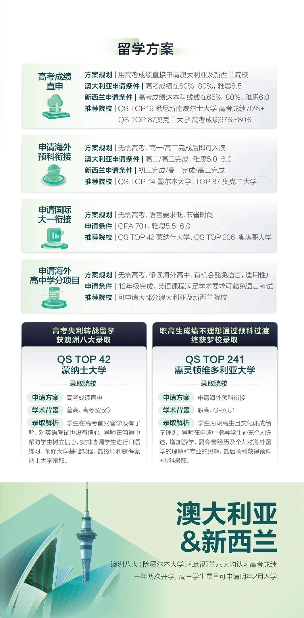 ![]() 高考后留学-澳洲篇 ![]() ![]() ![]() 高考刚落下帷幕,无数家庭和学生都在为未来的求学之路而忙碌。 如今,越来越多的家庭选择将孩子的教育目光投向海外,寻求更广阔的学术视野和人生舞台。 对于那些高中成绩不错,但又想避免国内高考激烈竞争的学生来说,澳洲的本科桥梁课程无疑是一个绝佳的选择。 一 Australia 什么是澳洲本科桥梁课程? ![]() 特别 关注 澳洲本科桥梁课程是一种为国际学生设计的,旨在帮助他们顺利过渡到澳洲大学本科学位课程的预备课程。 学生无需提供高考成绩,只需提供高三平时成绩和相应的英语成绩,即可申请。 通过桥梁课程的学习,学生可以提前适应澳洲的学习环境,为将来的本科学习打下坚实基础。 ![]() ![]() 二 Australia 哪些学生适合申请? 包含以下: • 高中成绩一般,但希望申请澳洲名校的学生。 • 想提前适应澳洲学习环境和文化氛围的学生。 • 希望避免国内高考激烈竞争的学生。 ![]() ![]() ![]() 三 Australia 推荐院校及入学要求 科廷学院 衔接科廷大学主流本科专业 入学要求: 高二或高三毕业,4门学术科目均分达到70%(部分课程需达到75%)。 悉尼泰勒学院 衔接悉尼大学主流本科专业 入学要求: 高二完成,4门学术科目均分70%起;雅思5.5起。 伊迪斯科文学院 衔接伊迪斯科文大学主流本科专业 入学要求: 高二完成,平均成绩50%起;雅思5.5起。 安斯伯利学院 衔接阿德莱德大学、弗林德斯大学、南澳大学主流本科专业 入学要求: 高二或高三毕业,4门学术课程平均成绩70%起;雅思5.5起。 注意 以上仅为部分推荐院校及入学要求,具体要求和课程安排请以各院校官网为准。 ![]() 四 Australia 申请流程 1 选择合适的院校和专业 2 准备申请材料,包括高中成绩单、英语成绩单等。 3 提交申请并等待录取通知。 4 获得录取后,办理签证和入学手续。 澳洲本科桥梁课程为广大高中生提供了一条通往澳洲名校的捷径。 无需高考成绩,只需凭借平时的努力和成绩,就有机会实现海外留学的梦想。 如果你对澳洲的教育和文化感兴趣,不妨考虑一下这条升学之路吧! 下期精彩继续 ![]() ![]() *图片仅展示部分内容 小编还给大家整理了热门国家高考后的留学方案,简单列举了各个国家不同途径留学的要求➕规划(可参考配图☝🏻) 💥感兴趣的同学可以扫描二维码,预约专业规划老师进行咨询哦~ ![]() 扫描二维码提交信息,即可获取 ![]() XDFQTCG ![]() 关注我们 获取更多留学资讯 ![]() ![]() |