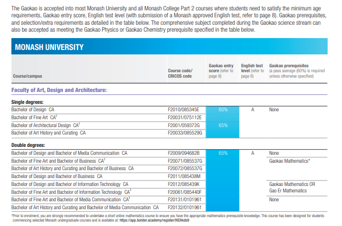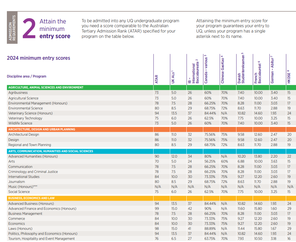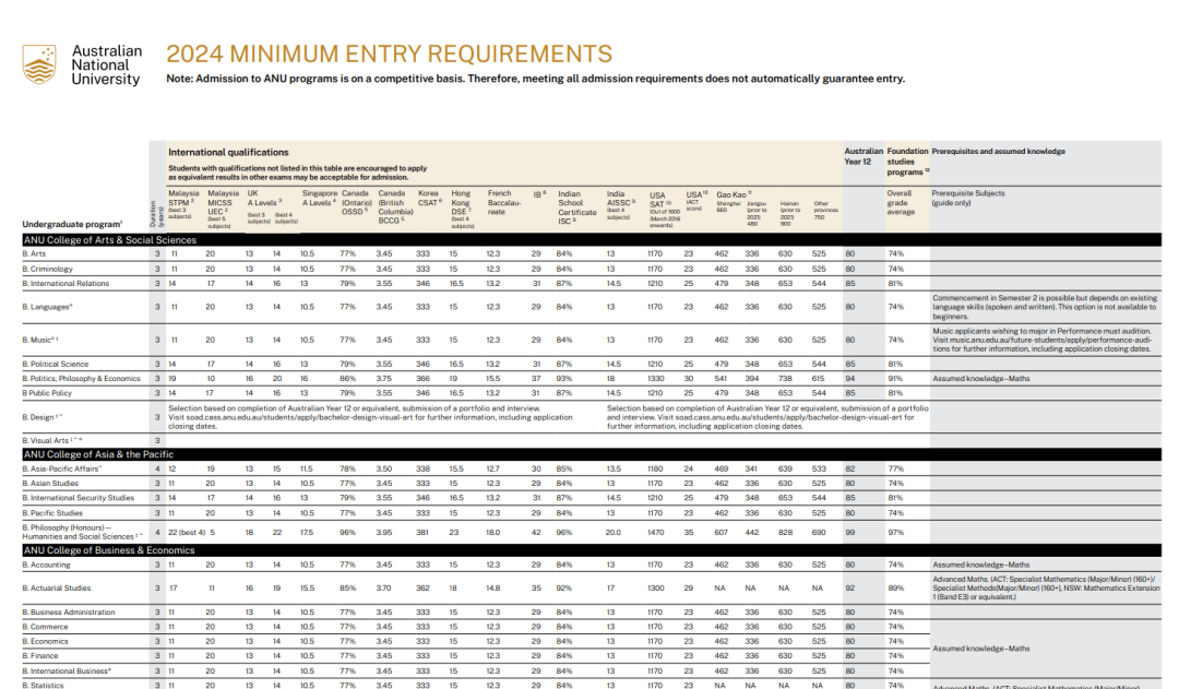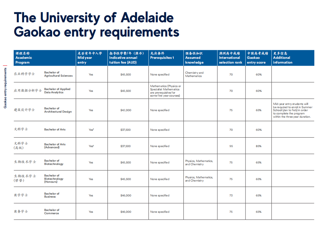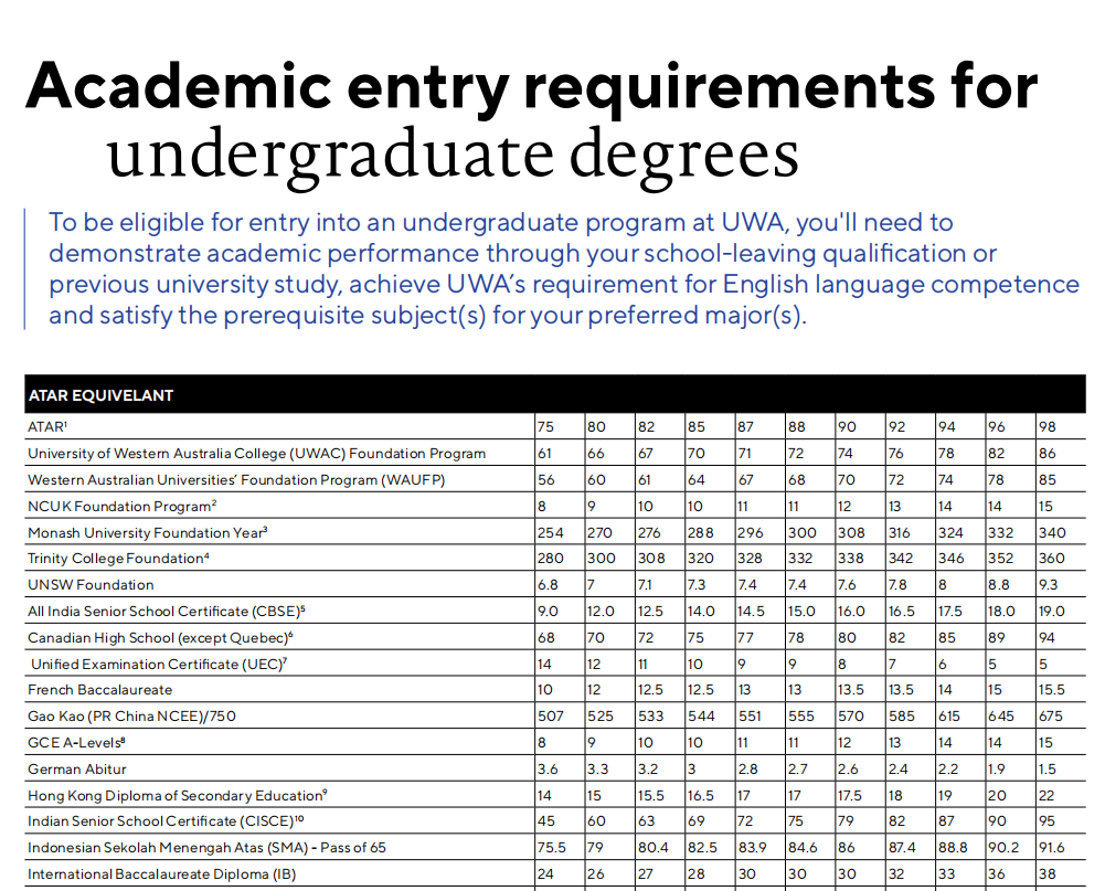 相信每一位高考学子都已经在刚刚结束的高考战场上拼尽全力,为自己交上了一份满意的答卷。但人生的舞台不止于此,你是否想过,在高考之后,踏上一段全新的留学之旅,开启你的人生新旅程?![]() 2024 年,教育部官宣,将进一步扩大留学生回国扶持政策,中国(教育部)留学服务中心主任王大泉表示,我国出国留学的形势在疫情之后正在强劲地复苏、平稳地增长。同时指出留学是国际化人才培养的重要途径和国家扩大教育对外活动交流的方针路线。 ![]() 中国(教育部)留学服务中心主任王大泉图源 | 中国留学服务中心发布会 澳洲八大名校无疑是众多学子的梦想之地。在最新的QS世界大学排名中,墨大悉大新南更是力压清华,稳居世界前20名校席位。举个栗子,某同学高考一本分数线刚达标,在国内可能只能上个普通一批高校,但是在澳洲你可以尝试申请世界前20的顶尖学府,换个赛道,前途不可限量! 澳洲院校&中国院校 世界排名对比一览 ![]() 想知道如何用中国高考成绩申请到这些顶尖学府吗?今天小A就为大家盘点一下高考后如何进行澳洲留学的规划。 首先大家要知道的是,有三种方案可以让你入读澳洲学校。如果你成绩达标,是可以直接用高考成绩申请澳洲本科直录(墨大除外,墨大必须搭配预科)!当然如果成绩距离本科直录有一定差距,你可以选择搭配预科或者国际大一课程。 今天主要为大家介绍本科直录的要求,预科和国际大一课程的留学方案 澳洲八大是指哪几所? 澳洲八大,是指澳大利亚八所历史悠久、享誉国际的一流研究型大学,它们分别是:澳大利亚国立大学、墨尔本大学、悉尼大学、新南威尔士大学、昆士兰大学、蒙纳士大学、西澳大学和阿德莱德大学。这些学校不仅在澳洲本土享有盛誉,更在全球范围内有着很高的学术声誉和影响力。 ![]() 澳洲八录取要求 悉尼大学(世界第 18) 此次悉尼大学有两个学科列入全球前 10 名,其中:解剖学与生理学全球第 6 位;体育相关学科全球第 4 位。进入全球前 20 名的还有:护理学(并列第 14 位);法学与法律研究(第 16 位);英语语言与文学(并列第 19 位);药学与药理学(第 20 位)。 高考成绩要求: 商科要求达到高考总分的75%-85%,计算机要求80-85% 语言要求: 大部分专业要求雅思6.5(商科/建筑7.0;法律/教育 7.5) ![]() 新南威尔士大学(世界第 19 ) 在最新学科排名中,UNSW共有47个学科上榜,跻身世界顶尖学科之列。并有19个学科名列世界50强,6个世界20强。其中,排名最高的是矿物与采矿工程,位至全球第三,而且已连续第八年跻身世界10强,蝉联UNSW表现最佳学科。全澳第一学科有10个,分别为:土木与结构工程、电气与电子工程、机械、航空与制造工程、材料科学、数学、会计与金融、商务与管理学、市场营销、统计与运筹学、表演艺术。此外,UNSW的心理学和法律也双双高居全澳第二。 高考成绩要求: 商科要求达到高考总分的72%-84%;工程/计算机75%;医学类要求75-90%; 语言要求: 大部分专业要求雅思6.5(商科/教育/法律/医学7.0) ![]() 澳国立大学(世界第30) 澳国立世界排名前20的学科有:考古学 第8名、政治学 第8名、哲学 第9名、人类学 第9名、发展研究 第10名、地理 第11名、地质学 第12名、地球与海洋科学 第12名、地球物理学 第13名、历史学 第13名、社会政策与管理 第14名、社会学 第19名。 高考成绩要求: 商科要求达到高考总分的70%,计算机专业70-90% 语言要求: 语言要求:大部分专业要求雅思6.5 ![]() 蒙纳士大学(世界第 37) 蒙纳士大学是澳大利亚规模最大的密集研究型大学,在四大洲的多个国家设有校区和科研中心,如果不想离家太远的同学,也可以考虑蒙纳士大学马来西亚校区,不仅距离中国地理位置更近,学费以及生活费成本也更加优惠,性价比非常高!马来西亚校区开设的课程较澳洲本土校区要少一些。 高考成绩要求: 商科一般要求达到高考总分的60%-80%;计算机65%-75% 语言要求: 大部分专业要求雅思6.5(法律/医学/理学/荣誉学位7.0) 注:学生在高考中取得的总分,除以考生所在省份2024高考的满分,并转换为百分比。例如:如果考生来自广东省,高考分数为 555 分,而广东省高考满分为 750 分,蒙纳士大学/蒙纳士学院转换的百分比则为 555/750 x 100% =74% ![]() 昆士兰大学(世界第 40) 在最新的学科排名中,4 个学科摘得全澳第一,分别为体育相关学科、环境科学、农业&林业、化学工程。 高考成绩要求: 商科要求达到高考总分的70%-75%,工程/计算机75% 语言要求: 大部分专业要求雅思6.5(法律/教育/商科/荣誉学位7.0) ![]() 西澳大学(世界第 77) 在最新学科排名中,西澳大学8门学科跻身世界前50,分别是采矿工程排名第7、解剖学与生理学排名第19、体育相关学科排名第20、地质学排名第42、地球与海洋科学排名第45、农业学与林业学排名第46、石油工程排名第46、地球物理学排名第47。 高考成绩要求: 商科要求达到高考总分的67-72%;计算机要求达到高考总分的达到78% 语言要求: 大部分专业要求雅思6.5(医学/教育7.0) ![]() 阿德莱德大学(世界第 82) 在最新的学科排名中,石油工程学科摘得全澳第一,矿物与采矿工程、牙科也是世界前50的优势学科。 高考成绩要求: 商科要求达到高考总分的65-70%;医学:60-80% 语言要求: 大部分专业要求雅思6.5(教育/医学/法律7.0) ![]() 以上就是今天的内容啦,对澳洲留学申请还有不清楚的小伙伴可以私信小A哦 ~ 热门阅读: 澳洲留学最难