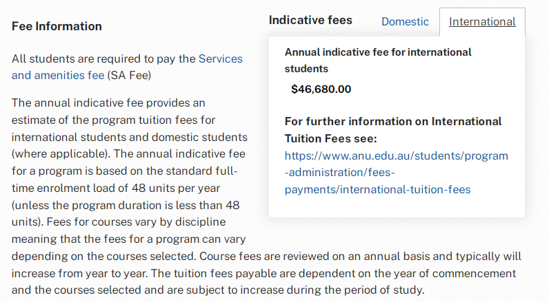 “ 不同专业学费有所差异,详情请参考链接(点开 International 可查看最新的 Postgraduate Indicative fees 即所有项目的学费):