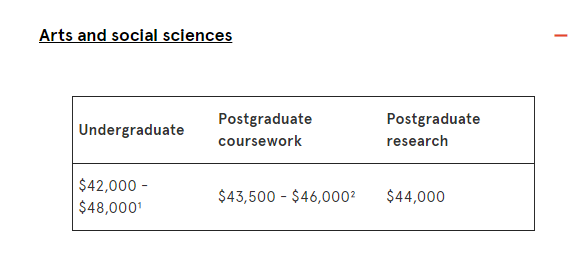 ● 艺术与社科类专业国际学生学费:约 45,000 澳元(约 21.3 万人民币)