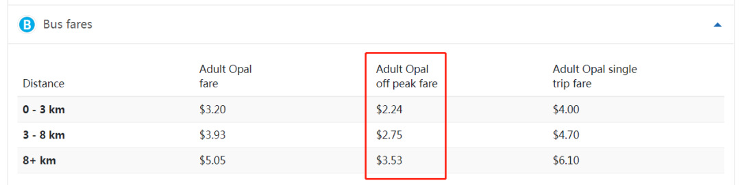 每个区的GO卡成人票价为3.55澳元,优惠票价为1.78澳元。考虑到不同乘客的优惠后价格可能不同,单程价格区间在1.78-10.74澳元之间(约合8.4-50.8人民币)。