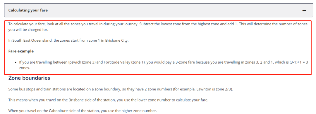 举例来说,如果乘客乘坐的区域是 Ipswich(第 3 区)和 Fortitude Valley(第 1 区)之间,那么就需要支付 3 个区的车费(3-1+1=3)。