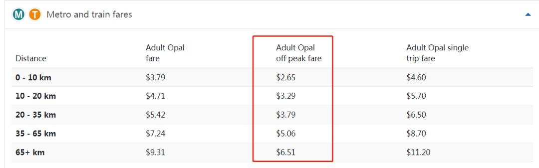 公交和轻轨的单程票价在 2.24-3.53 澳元之间,而地铁和火车的单程票价则在 2.65-6.51 澳元之间。按照每日往返一次的标准计算,一周的公共交通费用约在 31.36-49.42 澳元之间(约合 148-234 人民币),一年的交通费用大约在 7,700-12,000 人民币之间(按照一年 52 周计算)。