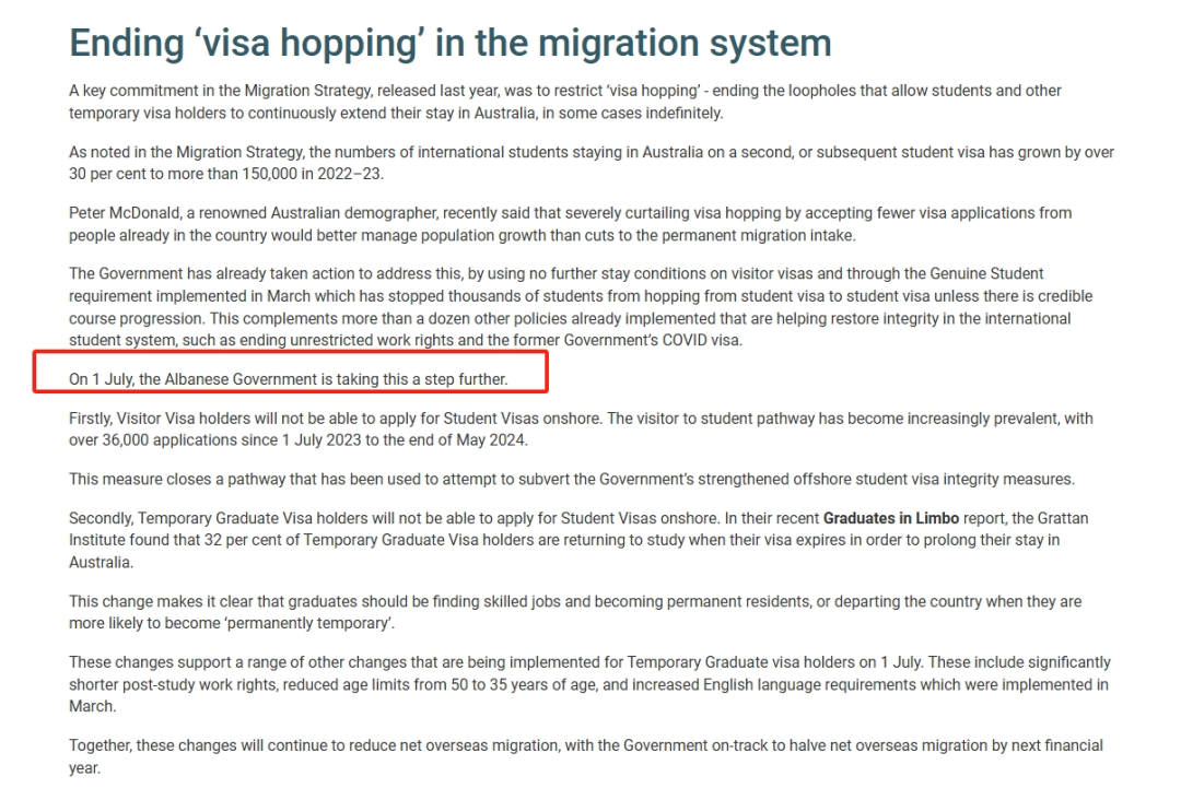 | 拿着这两种签证在澳洲境内是不可以转学签了,澳洲这次把这两类人想变向移民澳洲的路彻底堵死。 扫描下面二维码免费定制移民方案! ![]() ![]() 内政部长Clare O'Neil 在6月12日官方发布:从7月1日起,联邦政府将进一步加强措施——访客签证(600签证)持有人将无法在境内申请学生签证,临时毕业签证持有人(485签证)将无法在境内申请学生签证。内政部长Clare O'Neil一再强调:我们的目标是建立一个更小、更有规划、更具战略性的适合澳大利亚的移民系统。 根据澳大利亚政府在去年底发布的移民战略中就提到过将对学生和其他临时签证持有者不断延长在澳大利亚逗留的漏洞做出应对。 ![]() 政府已经对此实施了一些新政,比如更多旅游签证将被加上no further stay的限制条款,这意味着带有该限制条款的600签证持有者在其600签证到期后,不能在澳大利亚境内申请绝大多数的实质签证(包括学生签证);再比如学生签的GTE(真实短期入境)要求正式更改为GS(真实学生)要求等等,这些都是为了阻止在没有合理的课程的情况下,从一个签证“跳转”到学生签证,继续逗留澳洲的情况。 ![]() 下面来看看澳洲近期公布的学签获批数据,学签各个分支获批数据