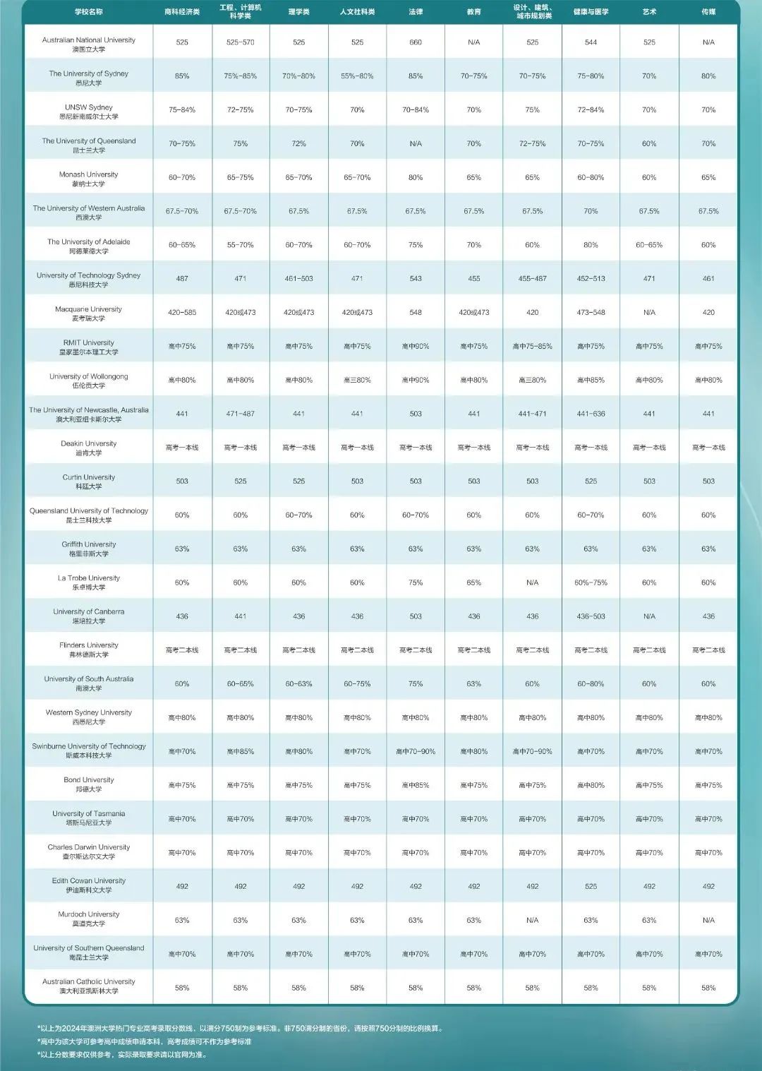 关注并星标🌟公众号🔍获取最新考情资讯 回复关键词,免费领取福利📍 回复“真题”: 领取环球教育5-8月雅思口语题库 回复“试听”: 预约免费雅思/托福/KET等试听课 回复“真题”: 领取完整版剑桥雅思真题 回复“课程”: 预约1V1语言考试规划服务 高考落幕,最近各地陆续开始志愿填报工作。除了选择国内大学,也可以考虑升读澳洲本科。同样水平的成绩,申请澳洲本科,可能会被更好的院校和专业录取! 如何利用高考分数来选择相对应的升学方式呢? 下面,就为大家分享澳洲的留学优势、本科学制和高考后澳洲八大本科申请途径,记得收藏喔~ ![]() 澳洲留学优势 ✔ 世界顶尖的教育质量 澳大利亚教育系统名列世界第三,仅次于美、英。大学提供广泛的专业领域和课程选择,包括科学、工程、医学、艺术、商科、社会科学等多个领域。学生可以根据自己的兴趣和目标选择适合自己的专业。 ✔ 认可中国高考成绩 “八大”中除墨尔本大学以外,其余学校均认可中国高考成绩。只要学生的高考水平达到国内当地一本线或二本线以上,就可以直接入读澳大利亚大学本科,或申请一年预科课程。 ✔ 学制专业变通灵活 澳洲高校的学制一般分为3年、2年、1.5年和1年制,国际学生可以根据自身实际情况选择合适的学制。 同时,澳洲部分院校的专业设置也比较灵活,对本科背景的要求相对宽松,无论是否跨专业都有一定的选择空间,校方也有相应的基础课程衔接主课。 ✔ 允许留学生合法打工 留学生可以合法兼职打工。按照7月1日颁布的最新条例,只要持有合法学生签证,每两周最多可以合法打工48小时,假期可做全日制工作。 ✔ 毕业后可获两年工签 澳大利亚政府没有海外学生配额限制,政策宽松,成功率也极高,而且只要留学生在澳大利亚全日制学习满两年,毕业后即可申请两年的工作签证。 ✔ 相对宽松的移民政策 自2023年7月1日起,对于符合指定专业的国际留学生,澳洲政府给予延长其PSW工签时长: 本科毕业生工签由2年变更为4年; 硕士毕业生工签由3年变更为5年; 博士毕业生工签由4年变更为6年。 ![]() 澳大利亚本科学制 澳大利亚有 42 所大学及 230 多所专科技术学院,学历资格被世界各国广泛承认,先后有13位科学家获得过诺贝尔奖,教育质量有目共睹。 本科课程专业可分成6个大类,30个小类。6个大类分别是文科、商科、法律、理科、工科和医学。澳大利亚大学本科专业学制分成3年、4年、5年和6年四种。 澳大利亚的教育承袭了英国的体制形式,小学6年(1-6年级);中学6年(7-12年级,不分初中高中);专科2-3年;大多数专业本科3年。然而依据专业的不同,本科的学制年限有所差异,例如: 大部分文商理科专业普遍为3年; 4年制本科专业包括教育、心理学、社会工作、法律、工程、测量和药学等; 5年制本科专业包括牙医学和兽医学;临床医学为6年制专业。 澳大利亚大学的教育是根据学生个体的需要、能力与兴趣而设,鼓励每个学生都能完全发挥自己在各个方面的潜能,并运用于各行各业。 ![]() 澳大利亚本科申请途径 ✔ 高考成绩直申本科大一 澳大利亚的大学均可以接受国内的高考成绩作为学术成绩来审核是否达到本科入学标准(墨尔本大学除外,只能从预科读起),并每年给出对应的录取分数要求。 ![]() 除此以外,相当一部分澳大利亚院校甚至可把高中平时成绩作为审核是否达到本科要求的标准,免除对于高考分数线的要求,搭配英文成绩作为评估,发放录取。 所以英语成绩非常重要!其中雅思成绩是出国留学的必要条件,2024暑假雅思班开始招生了!我们将为你提供专业的指导和支持,入学测试,学管全程跟进,学习群答疑解惑,以及国际升学指导等一系列服务,详情可以扫描二维码联系我们。 ![]() 扫码咨询,免费领取 雅思/托福/SAT/LGCSE GRE/GMAT/A-level 试听课 ✦ ✔ 本科预科 本科预科:是本科前的一种过渡性课程,课程时长一般在半年到一年,能帮助国际学生在熟悉教学模式、学习方法以及英语能力的同时,积累一定的专业知识。课程考试成绩满足要求后,同样可以直升当地本科。 适合对象:本科预科适合国内高二毕业或高三毕业生,想去澳洲读大学本科的学生或者刚上大一但是觉得学校不合适想转去留学的大学生。 01 悉尼大学 ▪ 标准预科:高中毕业,四门相关科目70%以上,雅思5.5,各单项5.5 ▪ 强化预科:高中毕业,四门相关科目80%以上,雅思6.0,各单项5.5 墨尔本大学 ▪ 综合课程:高二最好五门75%以上,雅思6.0,各单项5.5 ▪ 标准课程:高三最好五门80%以上,高二最好五门85%以上,雅思6.0,各单项5.5 ▪ 快捷课程:高三最好五门90%以上,雅思6.0,各单项6.0 昆士兰大学 ▪ 扩展预科:高三四门成绩65%以上,雅思5.0,各单项5.0 ▪ 标准预科:高二四门成绩70%以上,雅思5.5,各单项5.0 ▪ 加速预科:高三四门成绩80%以上,雅思6.0,写作6.0,其他单项不低于5.5 ✔ 大一文凭 ◆ 八大中只有Foundation 预科(没有Diploma)的学校:悉尼大学、墨尔本大学、昆士兰大学 ◆ 八大中有大一文凭的学校:新南威尔士大学、蒙纳士大学、西澳大学 、阿德莱德大学 01 悉尼新南威尔士大学 ▪ 工程/计算机科学文凭:高三90%,或高考60%,雅思6.0,写作6.0,其他单项5.5 ▪ 商科文凭:高三90%,或高考60%,雅思6.5,写作6.0,各单项6.0 ▪ 理科文凭:高三85%,或高考60%,雅思6.0,写作6.0,各单项5.5 ▪ 媒体与传播文凭:高三80%,或高考60%,雅思6.0,写作6.0,各单项5.5 ▪ 建筑
