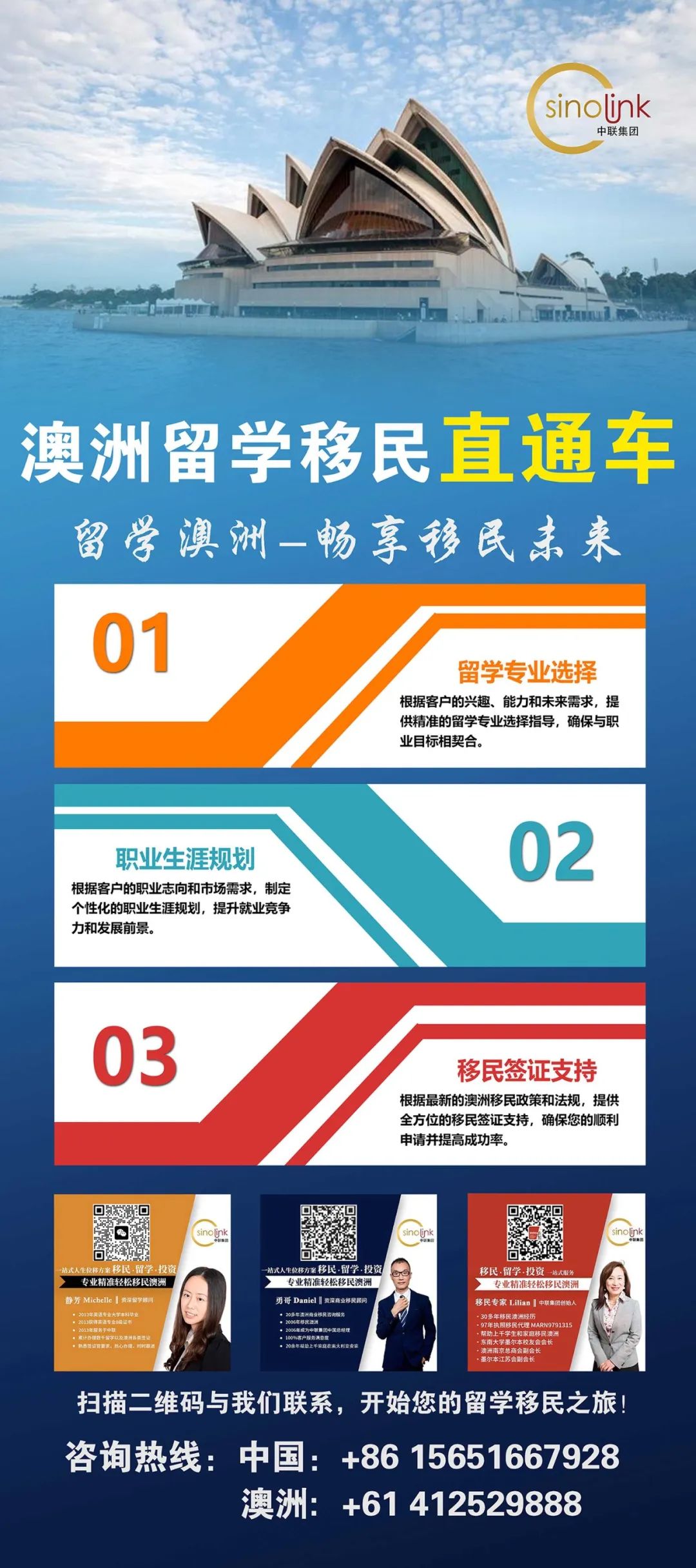如果您想了解更详细的内容,请关注我们中联,可私信,可电话!我们的“留学移民直通车”将为您提供多方位的支持和建议,帮助您顺利实现留学和移民目标! ![]() 总经理:刘琳(Lilian)手机:+61 412 529 888 (澳洲)邮箱:Sinolink.lilian@gmail.com ![]() ![]() (中联移民微信公众号) |