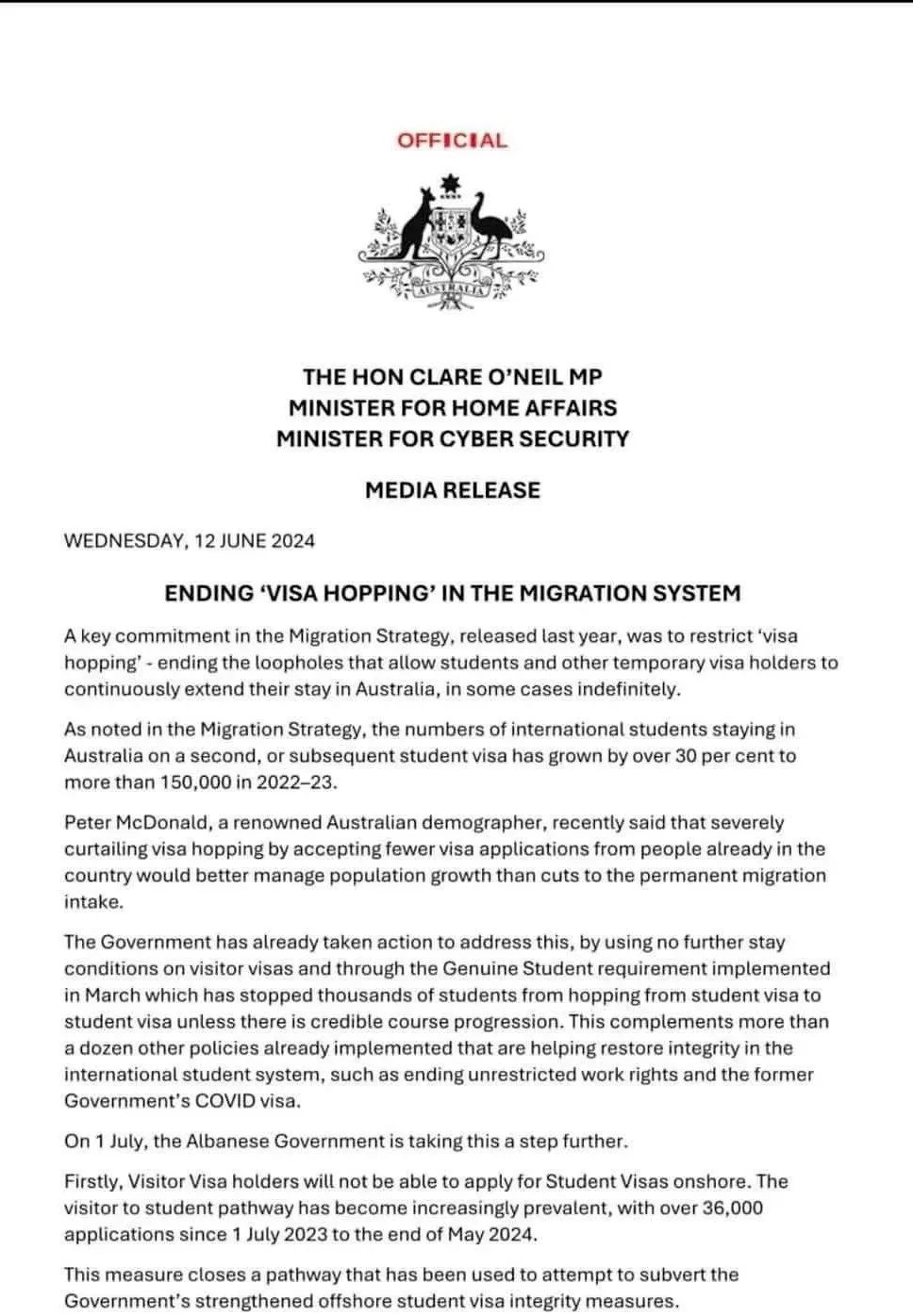 1. 全面禁止旅转学+485毕业工签转学签! 继缩短毕业后工作时间、限制申请签证年龄至 35 岁及提高语言要求后,澳洲又有新规出炉! ![]() 01 2024 年 6 月 12 日,当地移民局重申限制境内“跳签”,并宣布自 7 月 1 日起,全面禁止访客签证持有人(子类 600)和 PSW 毕业工签持有人(子类 485)在澳洲境内转申学生签证(子类 500)。 去年公布的移民战略的一个关键性文件是限制"跳签"——取消允许学生和其他临时签证持有者持续延长在澳大利亚逗留的时间、甚至在某些情况下可以无限期延长的漏洞。 本次文件中更是指出:近几年持旅游签入境澳洲,并在澳洲境内从旅游签证转到学生的签证申请,已变得越来越普遍。 同时,持第二次或学生配偶签证留在澳大利亚的留学生人数增长了 30% 以上,2022-23年间甚至超过 15 万人。 ![]() ![]() 02 为了防止越来越多的“跳签”现象,澳洲移民局将采取以下措施: ✍在学生签证申请中实施GS(真正的学生)标准,强调学签申请人的留学真实目的。 —— 已于今年3月开始执行。 ✍在600访问签证中,设置“no further stay”条款,禁止逾期滞留及境内转申学签。 ✍禁止485签证持有者重新申请500学生签证。 ![]() ![]() 03 7月1日起,澳洲政府将进一步采取以下步骤: 第一,游客签证持有者不能在国内申请学生签证。在澳洲境内从旅游签证转到学生的签证申请,已变得越来越普遍,自 2023 年 7 月 1 日至 2024 年 5 月底,已有超过 3.6 万份旅转学申请。 这项措施关闭了一条试图颠覆政府强化的海外学生签证诚信措施的途径。 第二,临时的毕业生签证持有者将无法申请学生签证在岸。在最近,格拉坦研究所的报告发现,32%的临时毕业签证持有者在签证到期后重返校园,以延长在澳大利亚的逗留时间。 这一变化清楚地表明,毕业生应该找到技术熟练的工作,成为永久居民。或者在更有可能成为"永久临时"的情况下离境出国。 这些变化支持7月1日对临时研究生签证持有人正在实施的一系列其他变化。这些措施包括大大缩短学习后的工作权利,将年龄限制从50岁降至35岁,以及在3月份实施的英语要求增加。 这些变化将继续减少海外净移民,政府将在下一财政年度前将海外净移民减少一半。 ![]() ![]() 04 温馨提示: 2024年6月12日,澳洲移民局再发文限制境内跳签,全面禁止境内旅转学及毕业工签重转学签。在此,我们特别提醒: ✍如果您持有澳洲600旅游签证,并要申请澳洲500学生签证,请在境外耐心等待500学生签证结果。 ✍切勿擅自用旅游签先行入境澳洲,境内转学签或等待学签结果。 ✍对于500续签的学生,也要留意后续课程的合理性,尽量避免倒读或重读现象。 ![]() ![]() 2. 更新体检要求! 澳大利亚政府已经发布了移民(所需的医疗评估)修订文件(LIN 24/032)2024,定于2024年7月1日生效。这一修正案对特定的签证申请人引入了强制性乙肝检测,并明确了临时签证的要求。这一更新对于RMA和签证申请人了解新的健康评估要求并确保合规至关重要。 主要亮点 1 强制性乙型肝炎检测:在乙肝高危国家出生的15岁以上的申请人,必须进行强制性乙肝检测,作为其医疗评估要求的一部分。 2 临时签证澄清:修正案将"临时签证"定义为包括临时签证,这些签证是获得永久居留权的两阶段程序的一部分。临时签证申请人的体检要求现在与永久签证申请人的要求一致。 3 现行规定的延续性:IMMI 15/144继续受理2018年3月18日之前提交的申请,并保持公共利益标准(PIC)4006A的要求。 体检要求