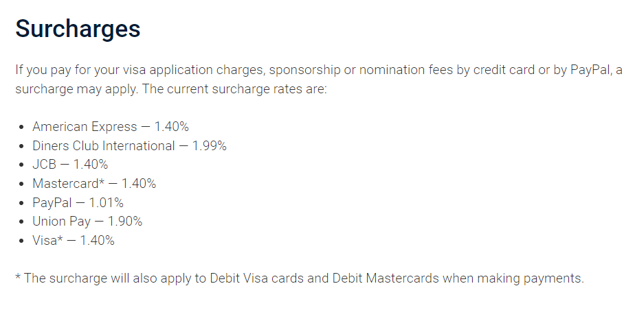 3. 签证费上调! 2024年7月1日起澳洲学生签证费上调至1,600澳币。 如在澳洲境内申请两次以上的签证,从第二次起,将加收700澳币的STAC费用,即2,300澳币。 ![]() 此外,使用如下方式支付,将产生额外的手续费,具体费用如下: