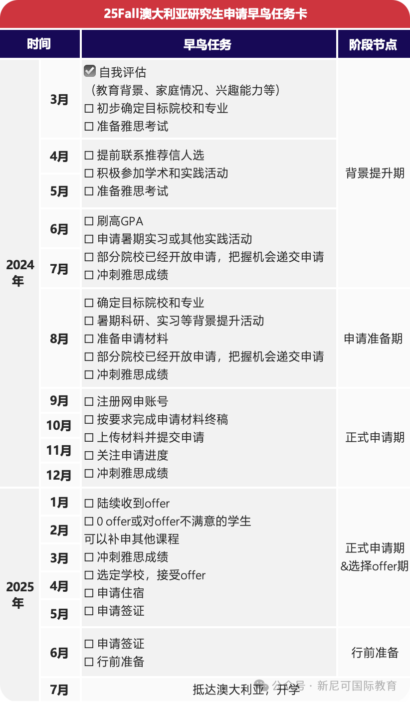 随着澳洲新财年的钟声在7月1日敲响,澳洲政府对签证政策进行了大刀阔斧的调整。这一变动,无疑为众多计划留学澳洲的同学们带来了全新的机遇与挑战! 与此同时,7月也是澳大利亚S2入学季的开学月,众多学子都怀揣着梦想,期待着踏入这片充满机遇的土地。 ![]() 今天,就来为大家揭秘澳洲留学申请的时间线和那些不可不知的注意事项!赶紧收下这份澳洲留学指南,让你的留学之路更加顺畅无阻吧! 1 澳洲留学优势 在全球教育版图中,澳大利亚凭借其卓越的教育质量和创新的教育体系,正迅速成为留学生的首选目的地。 政府对教育质量的高标准要求,使得各个教育层次均能提供高品质的教学,让“高质量教育”成为澳大利亚的代名词。 在2025年QS世界大学排名中,澳洲的大学表现出色,多所学校荣登世界前100强榜单。这些学府不仅学术实力强大,更注重实践与理论的结合,为学生提供了全面的学术支持和创新环境。 ✅学制灵活 澳洲学制一般分为3年,2年,1.5年和1年制,灵活的学制也是很多国际留学生的主要考量因素。 ✅学制跨专业申请较容易 澳洲部分院校的专业设置较为灵活,对于本科背景的要求相对宽松,无论你本科是否攻读或涉及过目标专业的学习,澳洲大学都会给你一个重新开始的机会。学校也会在前期安排一些基础课程帮你衔接上主课。 ✅利好的留学政策 澳洲从2023年7月1日起,便对符合指定专业的国际留学生,延长其PSW工签时长: 本科毕业生工签---2年变为4年; 硕士毕业生工签---3年变为5年; 所有专业的博士毕业生工签---4年变为6年。 此外留学生打工时长限制由40小时延长至48小时。 2 澳洲留学重要时间点 澳大利亚留学申请时间节点一般在每年的1月和6月,因为澳大利亚大学一年有两个开学时间,分别是S1(2月开学)和S2(7月开学),学生至少要提前半年准备申请。 澳大利亚留学申请也是遵循早申请早录取原则,而且有些热门专业,会因为申请人数过多而提前结束,所以打算留学澳大利亚,就要详细规划好时间,一般都是建议尽早申请。 💡什么时候开始申请? ✅预科 Foundation: 👉🏻高二上学期或大一上学期着手准备,直接申请名校预科国际大一Diploma: 👉🏻高三在读时就可以申请 ✅本科直录: 👉🏻已参加中国高考并取得当地一本或二本分数线,可直接申请入读澳洲大学大一课程 ✅硕士课程: 👉🏻建议学生在本科阶段毕业之前的一两个学期提交申请,拿到有条件录取通知书(Conditional Offer Letter),等毕业之后提交毕业证书和完整的成绩单以及语言成绩换取无条件录取通知Full Offer Letter。 💡计划2025年7月入学的同学可以参考: ![]() 3 澳洲留学需要准备的申请材料 💡澳洲留学申请材料 ✅申请表:务必提供学生正确个人邮箱,用于接收申请进度反馈、特殊专业面试通知、个人系统接受offer, enrol注册选课等。 ✅成绩单:如果分数中出现优良中差, 或ABCD,需提供中英文评分体系;如果科目有标注特殊符号(如:*/△),需确定是否选修课,或是重修或补考,如为后者,需开具相关科目原始分数证明,同时加盖教务处章。 ✅毕业证和学位证:官方英文版需为可接受的英文翻译件。 ✅语言成绩:除澳大利亚国立大学(ANU),以及大学特殊专业申请时必须提供语言成绩,或提供了才能审理,其他均可先申后补,不影响出具有条件offer。 另外,各大学和预科也可以通过内测搭配语言班。 还有,澳洲各大学已经取消或正计划取消在线语言类型,如多邻国、托福家考、PTE Online以及IELTS indicator,所以建议同学们选择传统的线下语言考试。 ✅护照:大部分学校申请时非必须,但如果没提供,部分院校要求提供学生身份证中英件,如UQ College, UOW。 💡澳洲留学申请其他材料 ✅CV和PS:澳洲高校录取学生主要看院校背景和个人成绩,因此申请很多专业并不需要CV和PS,不过对于有工作经验的学生,尤其是毕业后有较长全职工作经验的学生,澳洲相关院校会要求留学申请提供CV和PS来做补充说明。 ✅GAMT或GRE:商科专业可能需要提供GAMT或GRE成绩,EMBA还需要参加面试,设计类专业还需要提供作品集等。 ✅工作证明:有正式工作经验的申请学生还要提供工作证明。另外部分研究生课程有工作经验要求,同样需要提供工作证明。 ✅其他:推荐信、个人简历、研究计划书、挑选研究课题等资料也很重要,尤其是申读研究型课程的学生,必须要看重研究计划,研究计划可说明申请人的研究方向、研究方法、选择本项目的原因等,要尽可能的突出个人对项目的一些实质性想法。 4 澳洲留学费用 近年来澳洲院校QS排名一路的水涨船高,八大院校25年更是全部进入QS前100名。 澳洲虽然留学费用高,但学校排名、教育质量、优质的生活环境等因素吸引了大批学生前往求学。 在澳大利亚读本科,学费一年约12万-20万人民币;读硕士的学费一年为10万-25万元;生活费在12万-20万人民币左右 ![]() ![]() 在留学的道路上,每一步都至关重要。越早开始申请,越能按照时间线有条不紊地推进各项事宜,这无疑将大大增加你留学申请的成功机率。但别忘了,除了时间的把控,细节的打磨同样不可或缺! ![]() |