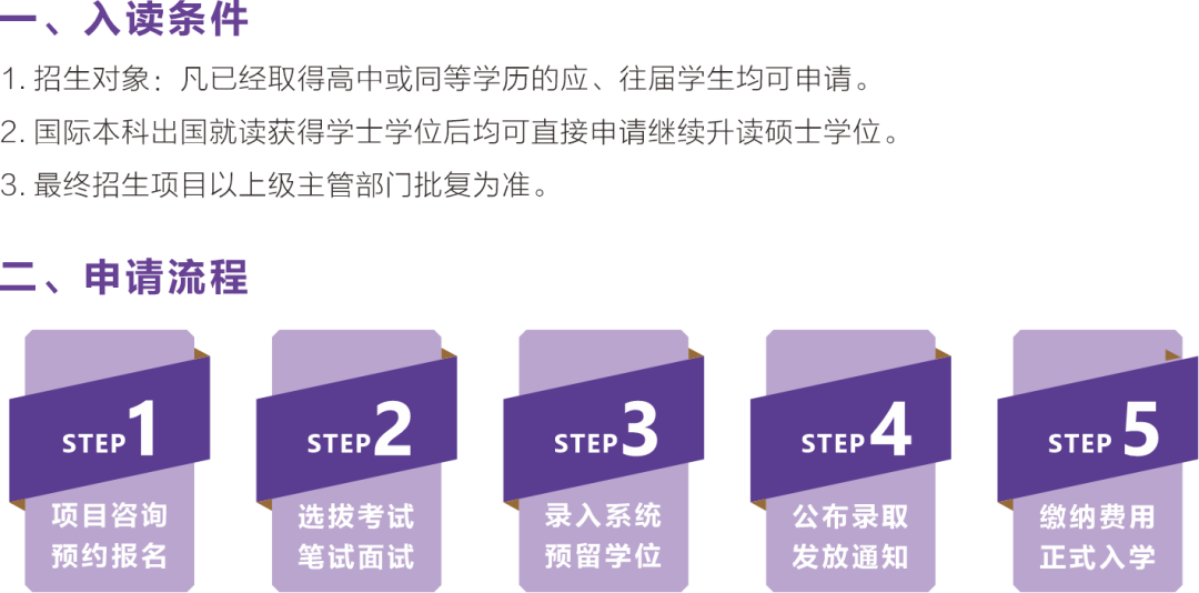 ![]() 东北州立联合科技学院简介 “4+0”不出国的留学 新工科领域 ▪ 全球化师资 中美双学位 ▪ 本硕双offer 广州工商学院东北州立联合科技学院(GCTB-NSU Joint Instituteof Technology at Guangzhou College of Technalogy andBusiness)是广州工商学院与美国东北州立大学通过优势资源整合,合作共建的非独立法人中外合作办学机构(学院),于2022年4月正式获得国家教育部批复设立,许可证编号MOE44USA02DNR20222301N。全面实施立德树人,以学生为中心建设质量保障体系,打造专业教育、创新创业教育课程平台,深化新工科理实互融、中外交融、工商融通改革,成立学生创新创业指导中心,营造良好人才培养生态,培养具有家国情怀、国际视野、能够全球择业的国际化优秀应用型人才。引进美方优质教育资源,超过三分之一专业核心课程由美方授课,组建国际化师资队伍,结合书院学习模式,培养扎实专业知识的人才,让学生体验不出国门享受留学。学院实验室建设实景模拟综合创新实验,结合产教融合,培养有突出的实践能力的人才。学院为学生继续进入全球优秀大学深造打基础,让学生能够从中国走向世界,把世界带到中国。Step into the world from China. Bring theworld back to China. ![]() video: https://mp.weixin.qq.com/mp/readtemplate?t=pages/video_player_tmpl&action=mpvideo&auto=0&vid=wxv_3518028196396728320 创新培养模式 ●“双学籍”——同时拥有广州工商学院、东北州立大学的学籍●“4+0”——4年都在广州工商学院佛山校区就读●本硕“双offer”——获得美方本科录取同时可获得硕士预录取●“双文凭”——符合双方毕业条件,可获得与两国本土一致的文凭 左右滑动查看更多 ![]() ![]() ![]() ![]() 一文读懂中外合作办学 点击图片查看更多内容 ![]() 东北州立联合科技学院招生手册 (点击图片查看项目招生手册) ![]() 联系我们 电话:0757-87888989/87888898 褚老师:18126857860 王老师:13049579933 王老师:19076053807 ![]() 联合科技学院官方微信公众号 国际教育学院简介 广州工商学院国际教育学院成立于2016年,积极推进国际交流与合作,与英国、澳大利亚、美国等国家30余所优秀大学建立深度合作关系,建立健全的国际教育教学运行机制和管理体系,探索国际化人才培养模式,旨在为学生打造良好的国际化学习环境和提供一流的出国留学服务。 ![]() video: https://mp.weixin.qq.com/mp/readtemplate?t=pages/video_player_tmpl&action=mpvideo&auto=0&vid=wxv_2436616267379179521 高考统招特色培养模式 国内外双学位 ▪ 本硕提升计划 名校联合培养 ▪ 双语国际证书 广州工商学院国际教育学院成立于2016年,积极推进国际交流与合作,与英国、澳大利亚、美国等国家30余所优秀大学建立深度合作关系,建立健全的国际教育教学运行机制和管理体系,探索国际化人才培养模式,旨在为学生打造良好的国际化学习环境和提供一流的出国留学服务。 ![]() 国际教育学院I招生手册 (点击图片查看项目招生手册) ![]() 更多信息,欢迎来电咨询 电话:0757-87333822/87888898 陈老师:15363407887 吴老师:17724039022 苏老师:19120644590 ![]() 国际教育学院I官方微信公众号 自主招生国际本硕项目 无需高考 ▪ 全程服务 本硕直通 ▪ 多国留学 广州工商学院国际本硕项目是广州工商学院与国外高校合作开展联合培养,面向高中(职中)起点毕业生计划外招生,为更多学生提供继续学习和出国深造的机会。 学生第一阶段在广州工商学院全日制学习专业学分课程、语言课程,第二阶段可前往韩国、香港、俄罗斯、英国、美国、新加坡等国家和地区的合作院校继续修读国际本科课程,达到毕业条件获得海外合作院校学士学位。所获学位受中国(教育部)留学服务中心认证,学生归国享受留学生相关政策待遇。 多元化升学项目 ![]() 一站式留学服务 ![]() 申请流程 ![]() 更多信息,欢迎来电咨询 电话:0757-87888898 黄老师:132 5021 0400 褚老师:181 2685 7860 谭老师:132 4389 9798 王老师:150 1182 9941 刘老师:135 6024 1213 ![]() 留学项目官方微信公众号 招生监督(投诉)电话:020-8692 8207东北州立联合科技学院官网:https://nsu.gzgs.edu.cn国际教育学院官网:https://www.gzgs.edu.cn/ies1地址:佛山市三水区乐平镇三花路166号 广州市花都区狮岭镇狮岭南环路28号 ![]() 供稿 | 张语灵 排版丨潘维梅 校对 | 彭倩菁 初审 | 聂 琴 复审 | 曾春龙 终审丨刘 鑫 1.同学们可关注广州工商学院国际教育学院官方微信公众号,我们会通过微信公众平台推送最新通知和招生资讯。 2.也可通过学校招生信息网http://ies.gzgs.edu.cn了解更多招生资讯。 3.如有任何疑惑,欢迎随时致电我校招生办公室咨询0757-88313138 4.地址: 佛山校区:广东省佛山市三水区乐平镇三花路166号 广州校区:广东省广州市花都区狮岭镇狮岭南环路28号 ![]() |