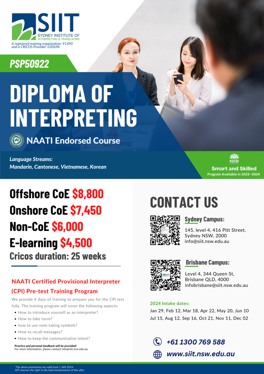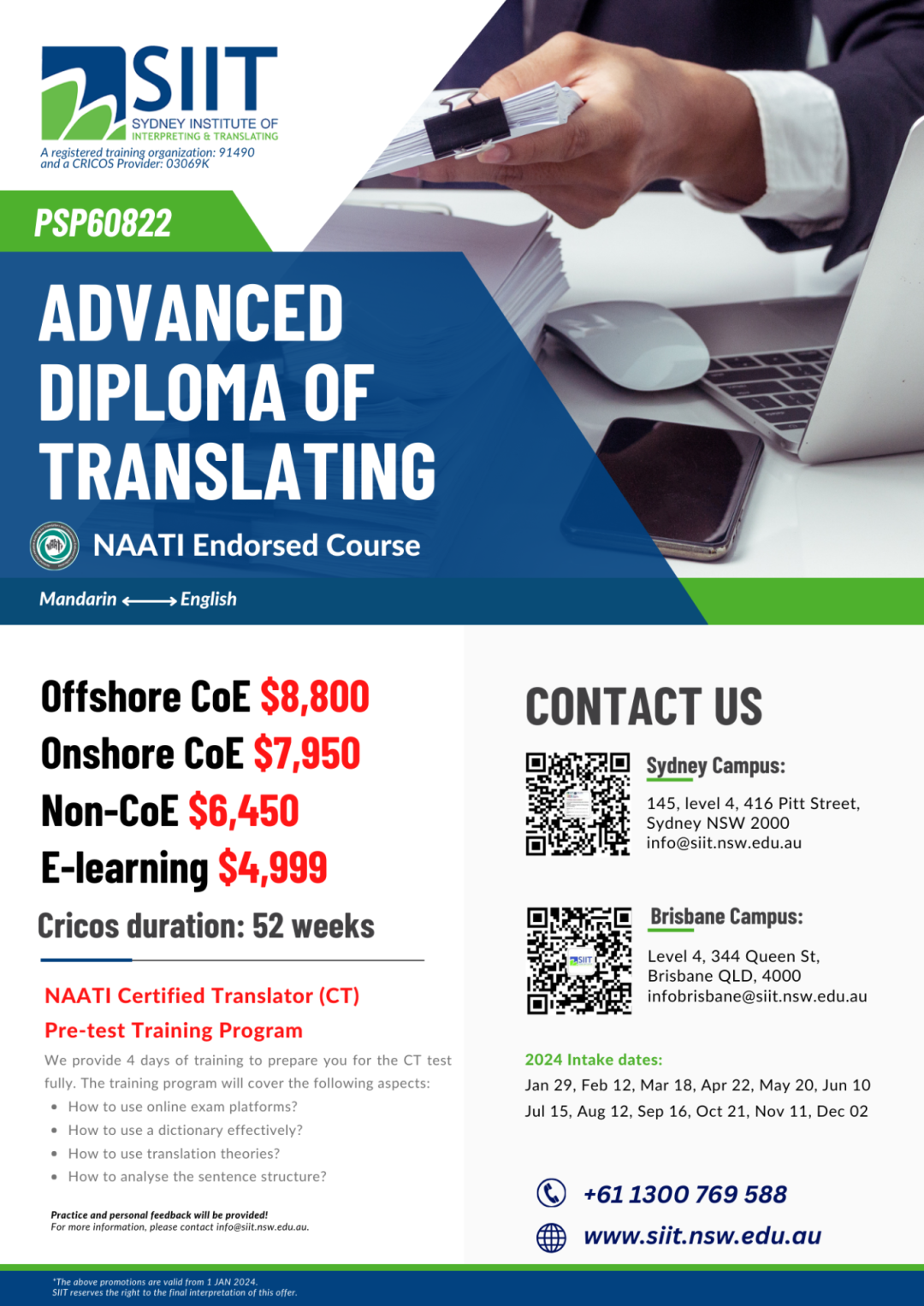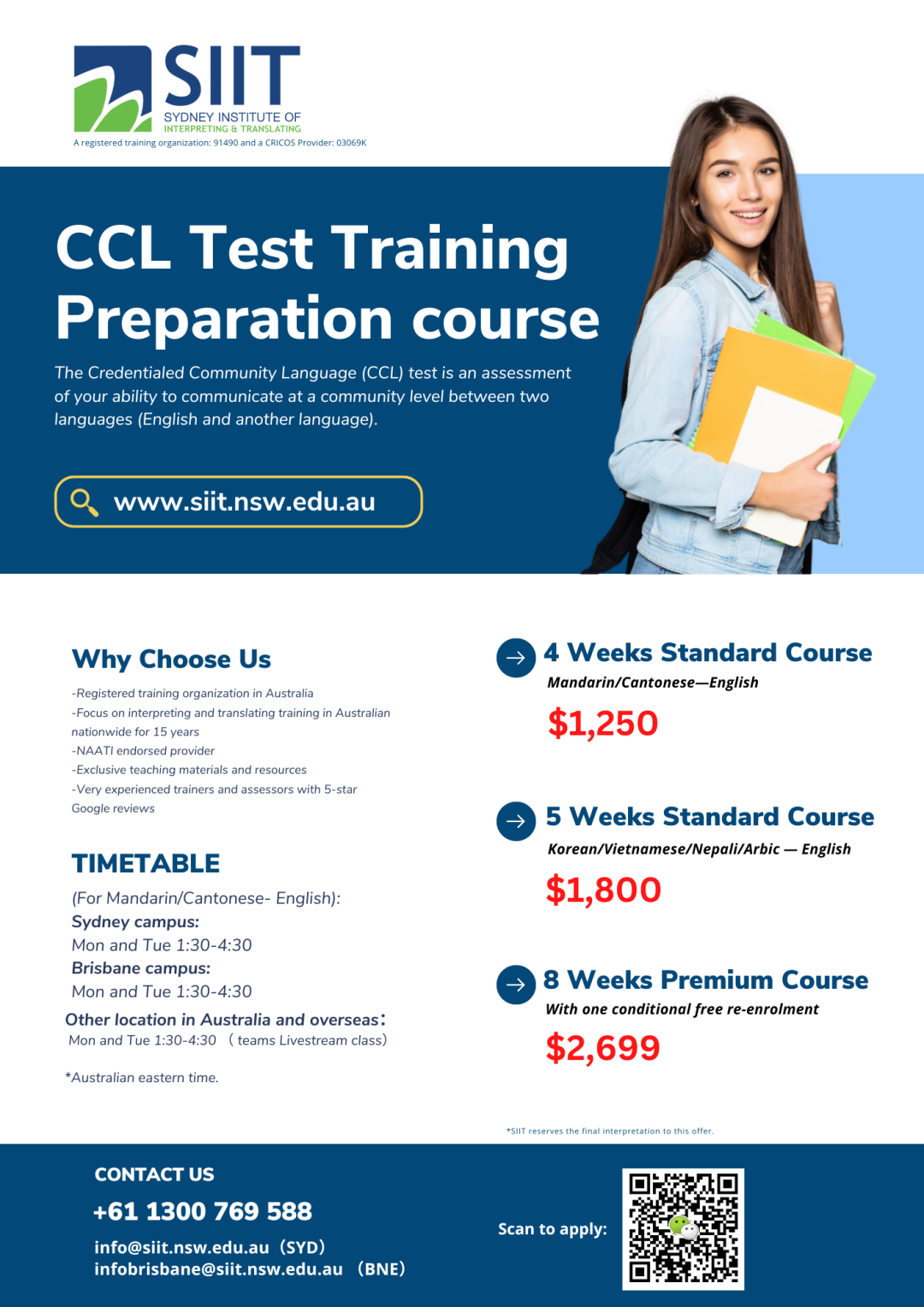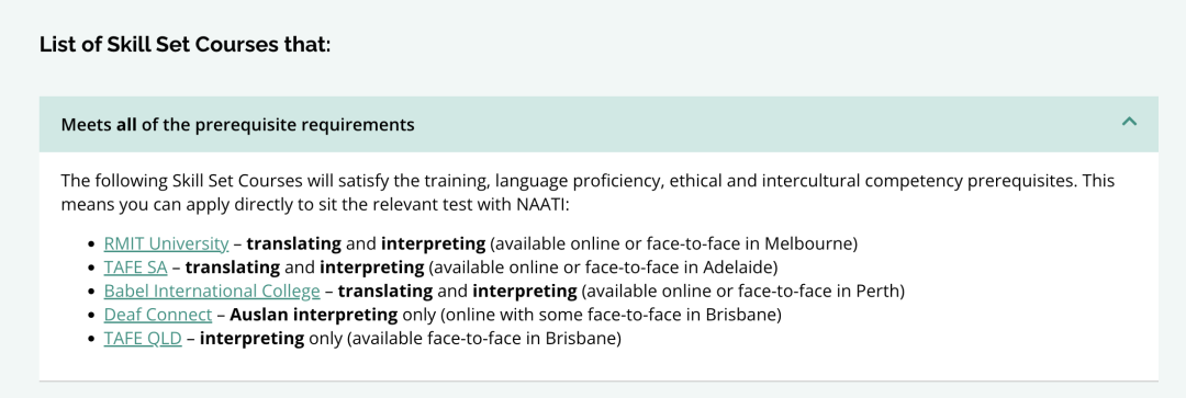 根据澳洲SEEK平台的数据,持有NAATI翻译资格的翻译人员通常可以获得相对较高的薪资。具体的薪资水平取决于工作地点、行业和经验。 总的来说,拥有NAATI翻译资格证书对于移民澳大利亚和在澳大利亚就业都有着显著的好处。它不仅可以增加移民申请的成功机会,还可以让您在澳大利亚的翻译行业中脱颖而出,获得更好的工作机会和薪资待遇。同时,持有这一资格证书还代表着专业水准和行业认可度,使您在澳大利亚的职业发展更加稳固和可靠! ![]() 扫一扫了解更多... Tracy老师(SIIT布里斯班校区负责人) 深耕澳洲移民就业市场,带你一站式了解移民留学就业... 如何获得NAATI翻译证书 要获得NAATI(澳大利亚国家翻译与口译认证局)的翻译资格证书 需要完成NAATI Endorsed qualifications or 完成过translating and interpreting 学历课程(包括境外学历),同时通过NAATI 道德,文化和 跨文化能力测试。 ![]() 注意啦如果你没有翻译学历背景,是不能只通过“NAATI 道德,文化和 跨文化能力测试” 而获得考试资格。 但是,对于小语种澳洲没有Endorsed 学历课程的要求,学生需要通过NAATI 前置课程学习( RMIT和南澳 TAFE 有资格提供)+NAATI 道德,文化和 跨文化能力测试 才能报名NAATI 相应级别的考试 ![]() (目前可以提供前置课程的学校) 通常大家都会选择第一种方法,不仅免了道德、语言、文化的测试,还能帮助大家系统的学习,了解考试内容... 报考NAATI翻译证书 一旦确定符合资格要求,您可以准备参加NAATI的翻译认证考试。 NAATI为不同的翻译和口译资格证书提供了不同类别的考试,基础的可以分为三大类,小编也给大家整理了考试对应的课程,方便大家报考! 1. Diploma of Interpreting (口译文凭) Diploma of Interpreting课程对应的NAATI考试是 Certified Provisional Interpreters 这个考试主要评估候选人在口译方面的能力。 考试包括模拟真实场景的口译任务,例如在法庭、医院、会议等情境下的口译。 2. Advanced Diploma of Translating (高级翻译文凭) Advanced Diploma of Translating 对应的NAATI考试是 Certified Translators 这个考试主要评估候选人在翻译方面的能力。 考试要求候选人翻译各种主题和领域的文本,如法律、医学、商业、技术等。 3. Advanced Diploma of Interpreting (高级口译文凭) Advanced Diploma of Interpreting 对应的NAATI考试是 Certified Interpreters 这个考试同样主要评估候选人在口译方面的能力,但是会更深入和高级。 考试要求候选人在复杂和专业性的场景中进行口译,例如在法庭的诉讼中、医院的手术室中、高级会议等。 ![]() ![]() ![]() 左右滑动查看更多 ![]() 这些课程是为了帮助准备参加相应的NAATI考试,提高候选人在翻译和口译方面的能力和水平。如果您想获得口译资格,可以考虑参加 Diploma of Interpreting 或者 Advanced Diploma of Interpreting 课程,并准备相应的NAATI口译考试。如果您想获得笔译资格,可以参加 Advanced Diploma of Translating 课程,并准备相应的NAATI笔译考试。 ![]() 扫一扫了解更多... Tracy老师(SIIT布里斯班校区负责人) 深耕澳洲移民就业市场,带你一站式了解移民留学就业... 快速加分还有CCL 当然如果你的目标不在于成为翻译员,而是想通过翻译移民加分,这里还有一个更快的渠道那就是NAATI CCL语言能力测试! CCL考试的全称是NAATI 社区语言认证考试(Credentialed Community Language Test)。CCL作为向澳大利亚内政事务部(Department of Home Affairs)递交的移民加分签证申请系统的一部分,凡通过通过该考试即可获得5分移民加分。 ![]() 当然CCL和NAATI翻译资格证书还是有区别的,我也给大家做了一个表格方便大家选择现阶段适合自己的考试!
