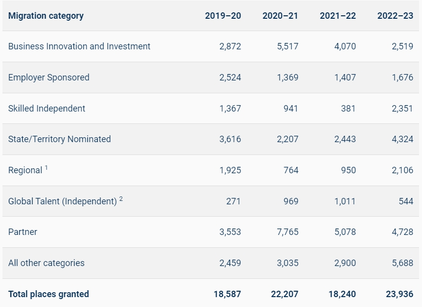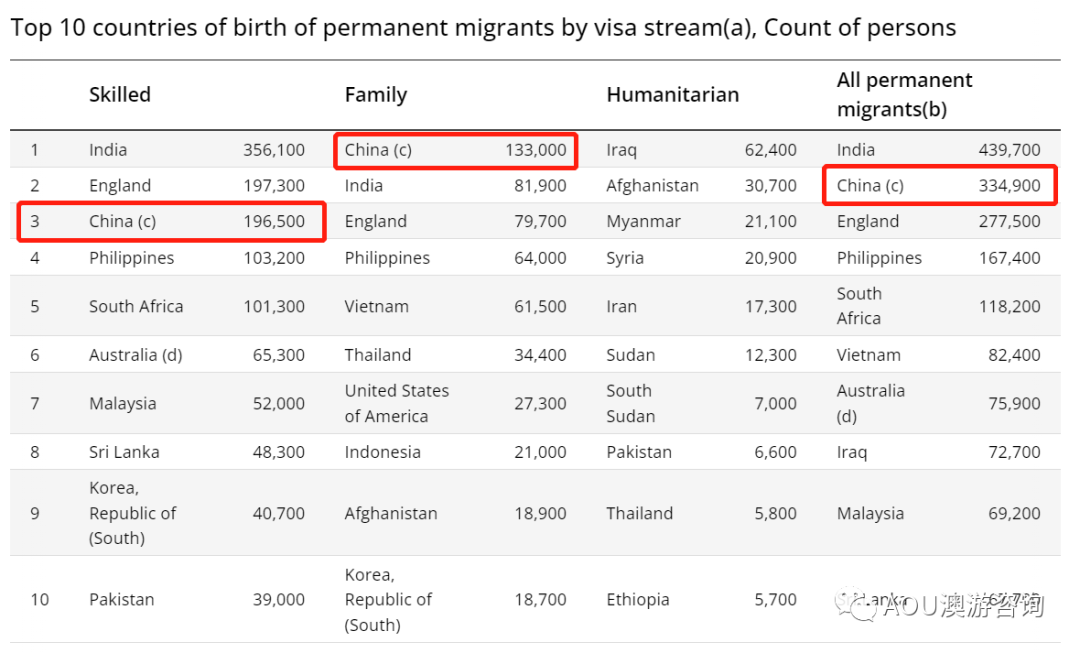 对于传统的移民目的国澳大利亚来说,中国向来是一个重要的移民来源国。中国人移民澳洲的历史,最早可以追朔到上百年前的清代。这种趋势一直延续到现在,澳大利亚依然对华人有着不凡的吸引力。要么留学,工作,要么亲友来澳团聚,或是定居,澳大利亚一向不乏华人身影。本文通过澳大利亚相关机构近期发布的官方数据,对中国人的澳洲移民途径做一下梳理和介绍。![]() 首先,从宏观和历史上看,澳大利亚每年对外国人颁发的永居签证(PR)数量,以年为单位,过去10年间基本在16-19万之间浮动,例如当前财年是18.5万个配额。 具体到获得PR的中国人数量,如下表所示,2019/20至2022/23的四个财年中,分别有1.86万,2.22万,1.82万,2.39万中国公民获得PR。抛开中间疫情的影响,总的来说,数量趋势是逐渐走高的。22/23财年中国人的2.39万的PR数量,仅次于印度的4.11万,是澳大利亚的第二大移民来源国。 ![]() 我们还可以从这个统计中看出,中国人获得澳洲PR的途径,人数最多的一类是配偶担保,其次是州担保技术移民,投资移民,以及偏远地区技术移民。 从另一个维度,也可以看出类似的趋势。根据2021年最近一次澳大利亚人口普查数据,移民来源国前十的国家分别是: ![]() 有19.65万中国人走的是技术移民,排第三;13.3万走的是家庭移民,为第一,意味着中国人的家庭纽带感更强;通过难民途径移民的前十国家中没有中国(所以中国人办难民成功率极低)。 在具体的技术移民类别中,中国人获得PR最多的专业,前几位依次是:会计,护士,幼教老师,软件工程师和程序员。 再来看非PR类签证,下表是非永居类签证中,中国人获批的数量统计,其中学生签和旅游签是主要部分。 ![]() 可以看出,疫情对中国人来澳还是有明显影响的,那两年留学签,旅游签,工作签的下签量都剧降。不过在疫情后已明显改善,尤其是学生签,已经超过了疫情前的水平。 ![]() 在澳洲居住地方面,华人更倾向居住在大城市,以下是出生于中国的移民在澳不同州的分布,可以看出悉尼(45%)和墨尔本(31%)明显比其他地方更吸引中国移民。 ![]() 总之,不同的移民方式适合不同人的情况。看懂了大数据,才会对自己的办理途径有参考和启发。如果需要咨询或办理,欢迎随时联系我们 ![]() ![]() ![]() 微信:16811527 电话:0420890711 ![]() ![]() |
