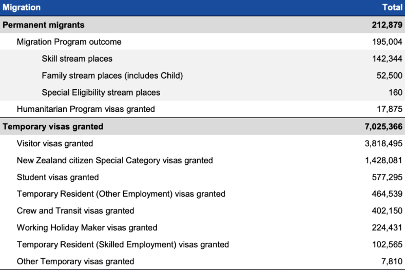 ![]() 澳洲移民局最新公布的数据显示,在2022至2023财政年,澳大利亚的永久移民人数达到了212,879人。这一数字反映了澳洲对移民的持续欢迎,尤其是在技术类移民方面,142,344人成功获得了技术移民或雇主担保移民签证。此外,家庭类移民也占据了52,500人的比例,显示出家庭团聚的重要性。 ![]() 值得注意的是,临时签证的批签量同样令人瞩目,达到了惊人的702万人次。其中,旅游签证申请人数达到381万,学生签证则为57.7万,而打工度假签证也有22万人。这些数据表明,澳大利亚依然是一个吸引全球游客和学生的热门目的地。 在获得永久居留权的移民中,近三分之二(61.8%)是已经持有临时签证并在澳大利亚的人。这意味着,许多临时签证持有者在澳洲生活了一段时间后,成功转为永久居民。特别是这些原临时签证持有者中,有65.1%获得了技术移民签证,而四分之一(25.6%)则是直接从临时工作(技能就业)签证转为永久签证。 技术移民类别签证在2022-23年度,澳大利亚的技术移民类别签证名额达到了142,344个,比2021-22年度增加了53,281个名额。这一增长体现了澳洲对技术移民的重视和需求。具体的名额分配如下: