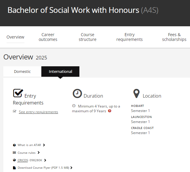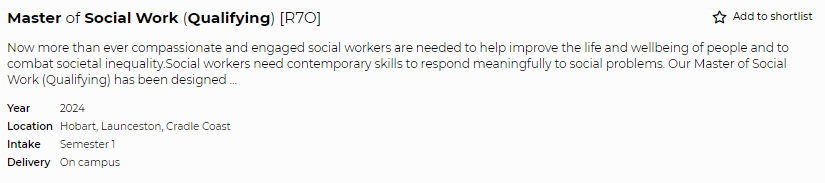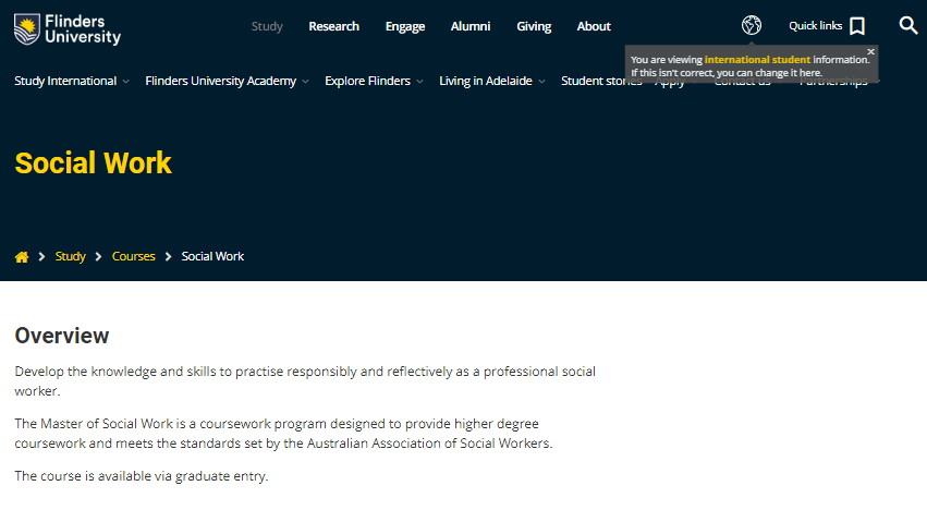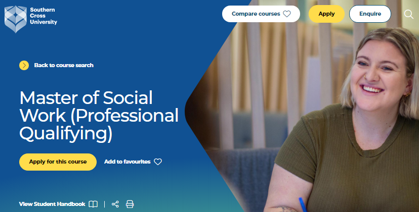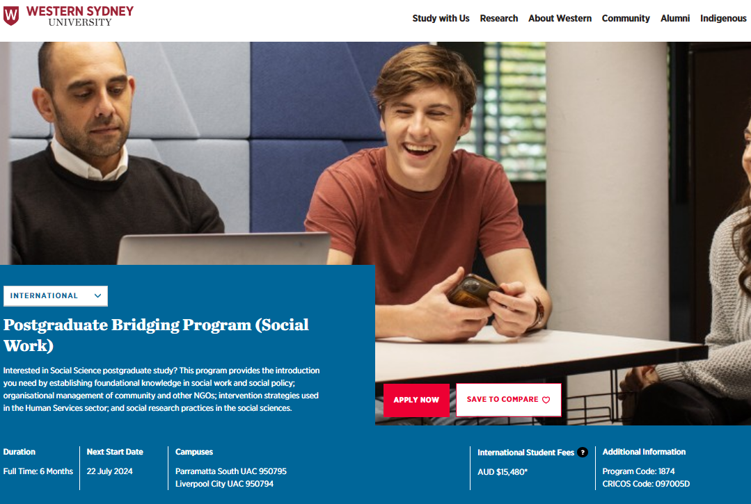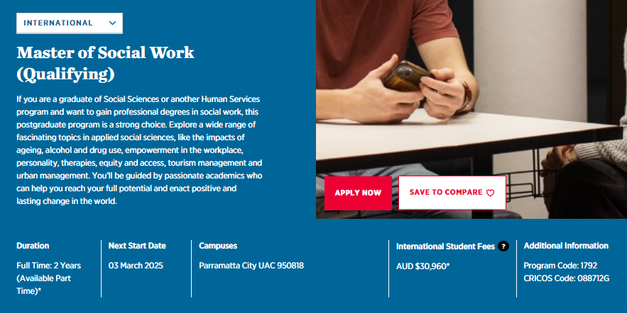 ![]() 02如何成为社工?需要背景吗? 社工专业所涉及的课程非常广泛,除了最基本的社会学概论、社会统计学,还会涉及到心理健康, 文化冲突、基本人权法律,国家的福利政策,以及分析家庭暴力,儿童保护的社会问题的出现以及对应的政策等。 如果想要读硕士社工专业,大部分的社工硕士是需要学生本科有社会科学或者是行为科学背景。 ![]() 如果没有专业背景怎么办?别担心,没有社会科学专业背景的学生可通过学习GC课程来满足Master of Social Work 社工硕士的要求,同时GC课程完成后可在养老以及残障辅助部门就职。03社工桥梁课程 西悉尼大学 西悉尼大学有6个月的社工专业桥梁课程,没有任何本科背景的同学在上完半年的桥梁课程之后,可以就读西悉尼本校的社工硕士。(桥梁课程7月开学,硕士课程第二年3月开学,无缝对接) Postgraduate Bridging Program (Social Work) 学制:0.5年(7月开学) 雅思要求:总分6.5,单项不低于6.0,PTE总分58,单项不低于50 ![]() Master of Social Work (Qualifying) 学制:2年(3月开学) 雅思要求:总分7,单项不低于6.5,PTE总分65,单项不低于58(从社工桥梁课程进入硕士主课无需再考雅思或PTE) ![]() 南十字星大学 本科具备心理学、法律、教育、政治、医学、环境等人文社科背景的学生几乎可以直录硕士。 本科不具备相关背景的也可以通过桥梁课程间接进入硕士课程。 从Bachelor of Social Work里拿出4-8门课给背景不够的申请人就读。 学制:4-8门课(每年2次开学) 雅思要求:总分7,单项不低于7,PTE总分65,单项不低于65 ![]() Master of Social Work (Professional Qualifying) 学制:2年(每年2次开学) 雅思要求:总分7,单项不低于7,PTE总分65,单项不低于65,语言不达标可配语言,海外硕士可以豁免雅思7分要求,如果您已在澳洲等英语母语国家成功取得等同于AQF Level 9(硕士毕业),SCU可豁免该专业雅思7分的语言要求,直录硕士课程。 ![]() 弗林德斯大学 弗林德斯大学桥梁课程只有3个月,不会因为同学们背景不同而桥梁课程长度不同,短时间就可以完成,有两个开学季,4月和11月开学,完美衔接社工硕士主课2月和7月开学。 Graduate Certificate in Society and the Individual 学制:3个月(每年2次开学) 雅思要求:总分6.5,单项不低于6,PTE总分58,单项不低于50 ![]() Master of Social Work (Graduate Entry) 学制:2年 雅思要求:总分7,单项不低于7,PTE总分65,单项不低于65 从社工桥梁课程进入硕士主课无需再考雅思或PTE ![]() 查尔斯达尔文大学CDU 位于澳大利亚北领地,大学以其高水平的教学质量和生动新颖的课程而闻名。 Graduate Diploma of Health and Social Care 学制:1年(1年1次入学) 雅思要求:总分6.5,单项不低于6,PTE总分58,单项不低于50 ![]() Master of Social Work (Qualifying) 学制:2年(1年1次入学) 雅思要求:总分7,单项不低于7,PTE总分65,单项不低于65 本校的桥梁课程完成后,可减免4门课学分,GD+Master学制一共2.5年,进入master需要达到雅思4个7分或同等英语水平 ![]() 塔斯马尼亚大学 塔斯马尼亚大学位于偏远地区,可以有偏远地区加分,考虑移民的同学可选择。 Bachelor of Social Work with Honours 学制:1年(2月开学) 雅思要求:总分7,单项不低于7(仅接受雅思) ![]() Master of Social Work (Qualifying) 学制:2年(2月开学) 雅思要求:总分7,单项不低于7(仅接受雅思) 塔斯马尼亚大学社工硕士的桥梁课程一般学校会安排为一年,所以是2月开学,读完之后可以直接衔接2月的主课。 ![]() ACAP 澳大利亚ACAP是一家着力于心理专业、社工专业课程的学院,在悉尼、墨尔本、珀斯和布里斯班均有校区,其社会工作硕士(Qualifying)可豁免英语要求。 Graduate Certificate in Human Services 学制:0.5年 雅思要求:总分6.5,单项不低于6.0,PTE总分58,单项不低于50 ![]() Master of Social Work (Qualifying) 学制:2年(2月开学) 雅思要求:总分7,单项不低于7,PTE总分65,单项不低于65 从社工桥梁课程进入硕士主课无需再考雅思或PTE ![]() 信为留学(原信为留学移民咨询集团)是澳大利亚规模最大、最专业的留学服务机构之一,专注于为留学生进行升学规划及院校申请。 信为留学总部位于墨尔本,在悉尼、布里斯班、南京、台北及胡志明市设有分部,与澳洲几乎所有高等院校均有长期合作,成立十多年来已成功为超万名学生获得心仪offer。 信为留学的顾问老师均为持牌教育顾问,拥有丰富的行业经验,荣获过多项合作院校颁发的服务奖项,并连续多年被澳洲多所名校评为最佳代理,是求学路上可信赖的伙伴。 信为留学的使命是帮助学生上更好的大学,创造更多的可能。因此信为在产品及服务上持续探索,不断精深。除澳洲本地中小学、职业院校及高校外,信为更提供英国和美国顶尖院校的留学规划及申请服务。 ![]() ![]() ![]() |