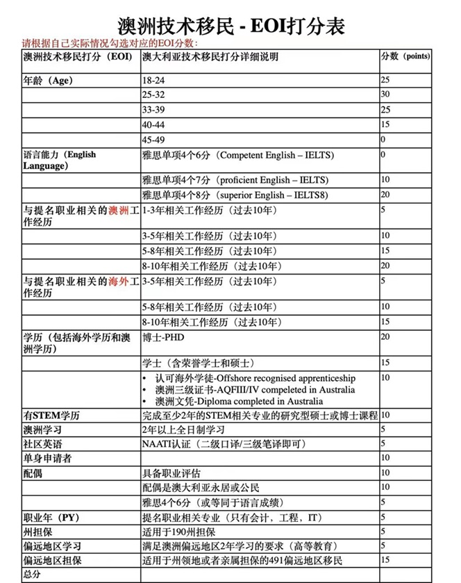 ![]() EOI打分体系详解意向书(Expression of Interest, EOI)打分系统是澳洲技术移民申请过程中的关键部分。EOI是申请人在提交正式签证申请前,向澳洲移民局表达移民意向的方式。澳洲技术移民的EOI系统基于打分制度,申请者必须通过该系统达到最低分数要求,才有可能收到移民局的邀请信(Invitation to Apply, ITA)。![]() 在EOI打分系统中,申请者的分数是根据一系列因素计算得出的,包括但不限于:年龄:年轻的申请者通常得分较高。18-25岁得30分,25-33岁得25分,33-40岁得15分,超过40岁则得分逐渐减少。英语能力:雅思或PTE成绩对于英语能力的评估至关重要。雅思8分或PTE79分及以上的申请者可以获得20分,而雅思7分或PTE65分的申请者则可以获得10分。工作经验:澳洲境内或境外的工作经验均可计分,但要根据具体年限和行业来评估。3-5年的相关工作经验可以获得5-10分,5-8年则可以获得15-20分。学历:持有博士学位的申请者可获得20分,学士学位或硕士学位得15分,文凭或职业资格则得10分。州或领地担保:获得州或领地的担保可以增加5-15分,视具体签证类别而定。这一打分系统确保了申请者的整体素质符合澳洲当前的经济和社会需求。 提高打分的策略与建议为了提高EOI打分,申请者可以采取多种策略:![]() 提升英语水平:通过参加雅思或PTE考试,提高英语能力以获得更多分数是最直接的方法之一。增加工作经验:如果可能,增加相关领域的工作经验,特别是在澳洲本地的工作经验,将大大提高打分。提高学历:在提交EOI之前,如果有机会,可以考虑完成更高的学历,如硕士或博士学位,这将显著增加分数。获得州或领地担保:选择那些对特定技能有需求的州或领地,并申请其担保,以增加额外的分数。通过伴侣加分:如果配偶或伴侣也符合移民条件,他们的技能和资格也可以帮助提高整体打分。 州政府担保与偏远地区担保州政府担保和偏远地区担保是提升EOI打分的重要途径之一。这些担保不仅能帮助申请者增加额外的分数,还能在一些特定情况下,降低申请的分数门槛。每个州或领地都有自己的担保要求和优先职业列表,申请者需要根据自己的职业和背景选择最适合的州或领地进行申请。![]() 州政府担保:此类担保一般要求申请者具有州政府或领地所需的技能,并承诺在获得签证后在该州或领地居住和工作一定年限。州担保签证的打分标准较低,但竞争依然激烈,申请者需要根据州的需求调整自己的申请策略。偏远地区担保:此担保主要针对那些愿意在澳洲偏远地区定居的申请者。偏远地区的生活成本较低,但申请者需要做好适应不同生活环境的准备。偏远地区担保通常提供更多的打分机会,尤其适合那些得分稍低但愿意在非都市地区生活的申请者。 END ![]() 扫码立即免费咨询 微信:FEAC2017 咨询热线:4006228284 ![]() 备注:咨询澳洲各类签证,请后台直接发送“咨询”咨询移民国家请直接发送国家名字,如:“澳洲”“加拿大”“新西兰”留下您的微信或者手机联系方式,即有专业顾问联系您。 |