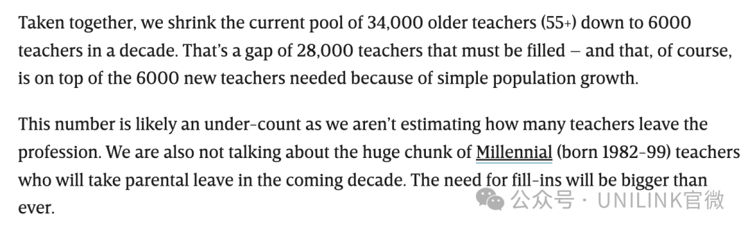 ![]() 澳洲幼教专业已经是风生水起了!又有学校开中教GD专业,就读一年就可以尝试中教移民路线了。今天且让小U带大家来瞅瞅! 在澳洲留学移民整体竞争加剧的时代下!澳洲幼教是异军突起,成为一个比较火热的移民专业。 尤其因为澳洲当地人学习教育专业的人数下降,以及后疫情时代新生儿的出生潮,再加上越来越多的新移民到来!澳洲缺幼教啊! ![]() 墨尔本大学申请评估 👉 点我开始 只要一年的澳洲幼教GD课程学历,就可以满足教师职业评估的学历要求!然后考雅思7788满足语言要求(在英美澳加等英语国家就读满4年高等教育课程可以豁免语言)。接着移民分凑65分以上就有机会申请移民了! —— 这是澳洲幼教移民的现状! 但是就读幼教课程的同学也越来越多!很多人不知道的是,澳洲也同样缺中学教师啊! 澳洲也面临中学教师短缺的长期问题!因为目前有34000名55岁以上的老教师!这些人在未来10年仅仅可能留下6000人!澳洲必须填补28000的缺口,以及增加额外的6000人去应对人口增长带来的教师需求。 ![]() 悉尼大学申请评估 👉 点我开始 中学教师和幼教一样,移民分很低!拿PR的模式也想通,你至少要具备1年的澳洲对口教师学历,然后满足语言要求!语言同样可以和幼教一样豁免! 西澳埃迪斯科文大学ECU开创澳洲首个中教GD课程! 本课程将使你在经过一年的全日制学习和临时注册后能够在西澳中学任教。 本课程的一个关键特点是 50 天的实习安排,这将使您能够在理论和实践之间建立必要的联系,同时在真实的教学环境中培养专业和通用技能。 本课程是通过大学和个别学校之间的合作伙伴关系提供的,使您能够在各种环境中获得工作经验,包括公立、大都市、农村、地区和偏远学校。 毕业后,你将有资格在私立和政府部门的中学学习领域任教。 本课程属于 ECU 国家认可的教学硕士(中学)课程。你也可以继续学习并完成硕士课程,以满足州和国家完全注册在中学任教的要求。 ![]() 新南威尔士大学申请评估 👉 点我开始 可以选择的教学方向也非常多!包括艺术、乐器、健康、科学、数学、戏剧、英文等等。目前学费是$36,150/年! ![]() 蒙纳士大学申请评估👉点我开始 这里也和大家聊下读中教移民的优势和劣势! ![]() 优势:主要是目前就读这个领域的人比较少,未来比较长一段时间竞争不会那么大!幼教读的人是越来越多了!中教的职业发展会更多样性,待遇会更高。 劣势:实际语言要求更高!毕竟你去教中学生,而不是应付小朋友!所以课程和实习难度会比幼教更难! 希望大家可以做出更好的选择哦!如果有任何澳洲留学移民的问题都可以直接咨询UNILINK! 2024留学申请活动进行中 澳洲八大免申请费 咨询澳洲大学申请 请添加UNILINK顾问咨询👇: ![]() -End- 推荐阅读 ●● // 1 |悉尼大学(USYD)2024最全攻略!专业介绍、申请、奖学金和就读体验! // 2 |莫纳什大学(Monash)2024申请全攻略!专业介绍、录取要求等最新信息 // 3 |墨尔本大学(UniMelb)2024最全攻略!专业排名、录取要求等信息更新! // 4 |新南威尔士大学(UNSW)2024最全攻略!专业介绍、录取要求等最新信息! // 5 |申请澳洲本科,原来这么容易!世界100强大学供你选择! ![]() ![]() ![]() |