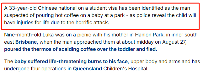 澳洲一名9个月大的婴儿,被亚裔泼了满身滚烫的咖啡,严重烫伤!![]() 当时新闻报道嫌疑人为亚裔,泼完咖啡以后立刻逃跑,现在嫌疑人的身份终于确认了, 竟然是一名中国留学生! ![]() 看看澳媒新闻报道的第一句话: 33岁中国留学生在公园内向婴儿泼咖啡! ![]() 9个月大的婴儿,浑身严重烫伤,一度因为伤势严重生命垂危,截止到目前 已经接受了4次手术,即便如此依然留下了永久性伤害... ![]() 一个9个月大的小婴儿,浑身裹满纱布,里面是因为高温烫伤而溃烂的皮肤,他对这个世界依然懵懂无知,结果却遭到如此伤害。 ![]() 烫伤不仅会让这个小婴儿时刻疼痛,脸上的烫伤足以让他毁容,这是手术也无法解决的问题。 ![]() 而且因为婴儿年龄太小,很多治疗方式都无法使用... ![]() 究竟是什么原因会让一名33岁的成年中国男性,突然向一名9个月大的婴儿发起袭击呢? 而且还是泼滚烫咖啡这样残忍的伤害行为! ![]() 事情发生在8月27日,澳洲警方接到报案以后立刻展开了追查。 根据现场监控,警方初步锁定了嫌疑人,根据长相进行了追踪。 信息显示,这名33岁的中国留学生在2019年通过打工度假签证进入澳洲,之后转换成为了学生签证。 ![]() 8月28日,就在他用滚烫咖啡袭击婴儿的第二天,他独自驾车离开了布里斯班公寓前往了新州。 海关数据显示,8月31日他在悉尼机场离境前往中国。 ![]() 澳媒在新闻中写道: 调查显示,这名男子出生在杭州! ![]() 澳洲警方表示,这起伤人事件非常严重他们也异常重视,立刻组建了一个30人的追踪团队。 结果还是晚了一步,在他们确认嫌疑人身份时,他已经先一步离境! ![]() 虽然他逃走了,但澳洲警方并没有停止追查, 针对这名33岁中国男性的全球通缉令已经发布! 澳洲警方发言人表示,无论如何一定会对他进行逮捕,让他为自己的行为付出代价。 ![]() 受伤儿童的父母对于犯人已经逃走的事情根本无法接受。 自己只是带孩子外出野餐,结果突遭横祸被一个陌生人袭击,滚烫的咖啡就这样全部泼在了孩子身上。 ![]() 马上这个9个月大的婴儿就要接受第五次手术,具体恢复到什么程度医生都无法确定。 如果这个犯人只是逃离澳洲就能逃脱法律制裁的话,对所有人来说都不公平。 ![]() 根据目前的国际条款,早在2007年9月份,中国就与澳大利亚签订了引渡条款。 根据条款规定: 缔约一方同意根据本条约的规定,应另一方请求,将在其境内发现的为了就可引渡的犯罪进行起诉、判刑或者执行判决而被通缉的任何人引渡给另一方。 根据这个规定,如果澳洲警方向中国发出了引渡申请,即便这名33岁的男子逃回中国,也可能会被逮捕并押送回澳洲接受审判。 ![]() 但是即便有引渡条款存在,锁定这名犯罪分子也没有那么容易。 但相信天网恢恢疏而不漏,犯下如此恶行之人,必然会遭到严肃处罚! 让我们回顾一下究竟发生了什么事情吧! 将时间倒回至8月27日,那一日在布里斯班Coorparoo Park之中,一位母亲带着自己年仅9个月大的婴儿正在和友人一起野餐,享受美食和阳光。 当时一行人其乐融融非常开心,可就在这时,一名男子悄悄向着他们几人走去,整个过程,没有人发现任何异常,看起来这只是一个拿着一杯咖啡的普通人。 等到这位母亲有察觉时,男子已经来到了他们身边! ![]() 接下来一幕,让所有人惊声尖叫: 男子突然将滚烫的咖啡全泼在了9个月大的婴儿身上! ![]() 这一幕吓傻了所有人,男子在倒完咖啡之后,快速逃离现场,这位母亲尖叫着拿出凉水泼在孩子身上,试图帮忙降温,这个时候孩子娇嫩的皮肤上已经开始起泡... 一旁的友人Zara Mazza则向伤人男子追去。无奈对方跑得太快,最终也没能拦住。 ![]() 之后的事情前文也都提到过,最初澳媒只是表示伤人者是一名亚裔,具体来自哪个国家并不清楚。 现在确定了 就是一名33岁的中国留学生! ![]() 出于什么目的伤人谁也不知情,毕竟他们之间没有任何交集。 只知道这名中国男子已经离开澳洲潜逃回了中国,针对他的全球通缉令已经颁布,可能距离将他逮捕只是时间问题! ![]() 将他逮捕回澳洲受审让他为自己的罪恶行为付出代价,这是法律存在的意义。 但是对于这个9个月大小婴儿的伤害已经不可逆了...只希望在合理的治疗之下,他受到的伤害能够尽可能减轻,留下的永久后遗症也可以尽可能消除... (来源| 墨尔本生活资讯) ![]() 推荐阅读:直接戳下面标题 新加坡前交通部长受贿14瓶酒被重判,下周入狱! 男子为泄愤在上海砍人!警方通报:致3死15伤,细节曝光 任8年交通部长的李小鹏,职务调整 小伙考公笔试、面试都过,结果政审被卡:浏览过2次不良网站 香港邀请张维为授课,为香港未来“把脉开方” 从核酸检测到房子检测,无所不能!揭秘华测检测背后股东 湿疹反复用它,3秒止痒去湿疹,长年不反复!一个小方子 就能告别痔疮~不用开刀动手术! |